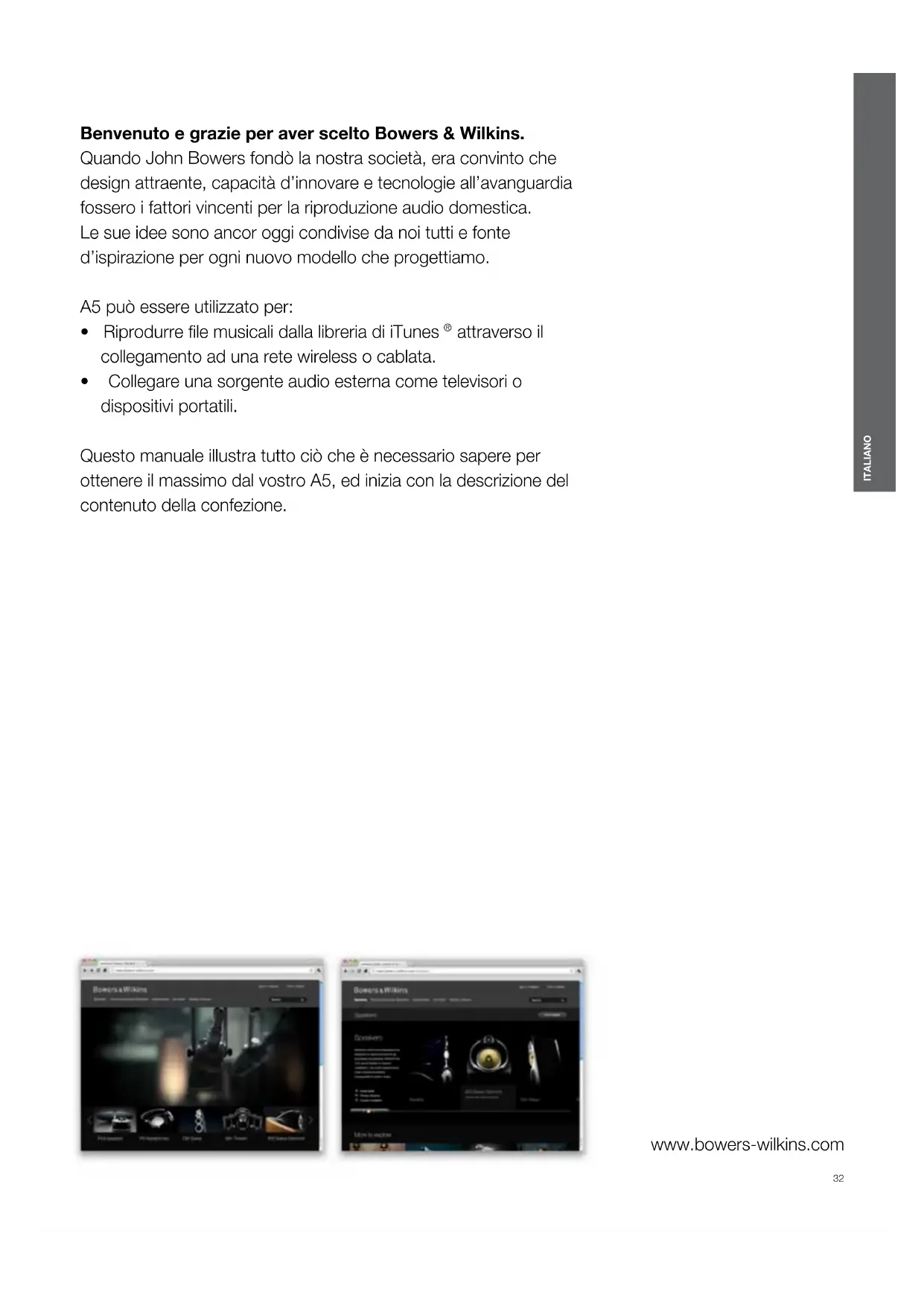 ITALIANO www.bowers-wilkins.com Benvenuto e grazie per aver scelto Bowers & Wilkins. Quando John Bowers fondò la nostra società, era convinto che design attraente, capacità d’innovare e tecnologie all’avanguardia fossero i fattori vincenti per la riproduzione audio domestica. Le sue idee sono ancor oggi condivise da noi tutti e fonte d’ispirazione per ogni nuovo modello che progettiamo. A5 può essere utilizzato per: