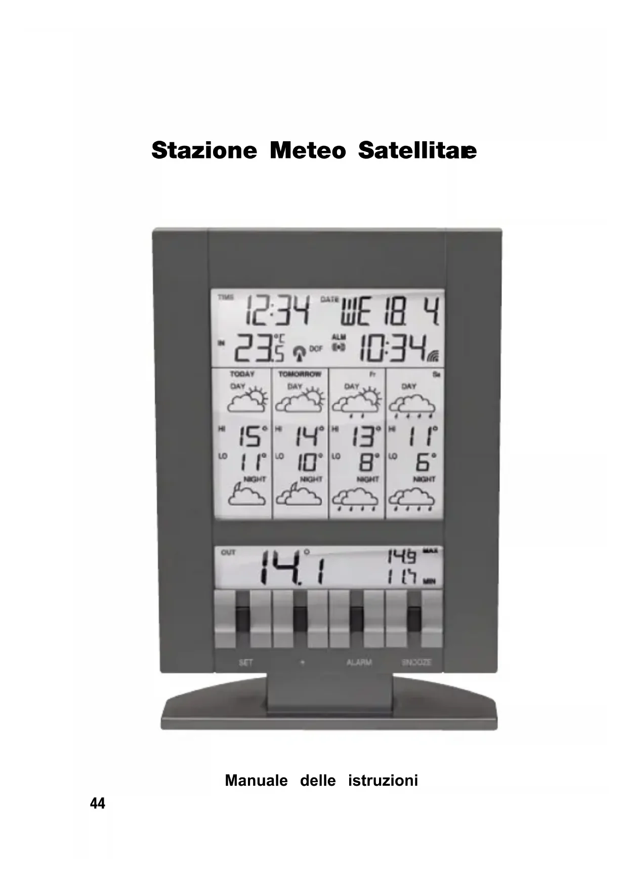 - Simbolo lampeggiante → Allarme attivo o temporaneamente disattivato (Snooze) Calendario Ora di allarme Simbolo dell´allarme Ora Temperatura interna Indicatore della ricezione del segnale radiocontrollato Previsioni del tempo (giorno) MIN/MAX- Temperatura Previsioni del tempo (notte) Oggi Giorno1 J + 2 J + 3 Temperatura esterna i MIN/MAX Indicatore della ricezione per i dati meterologici Indicatore della ricezione per i dati meterologici