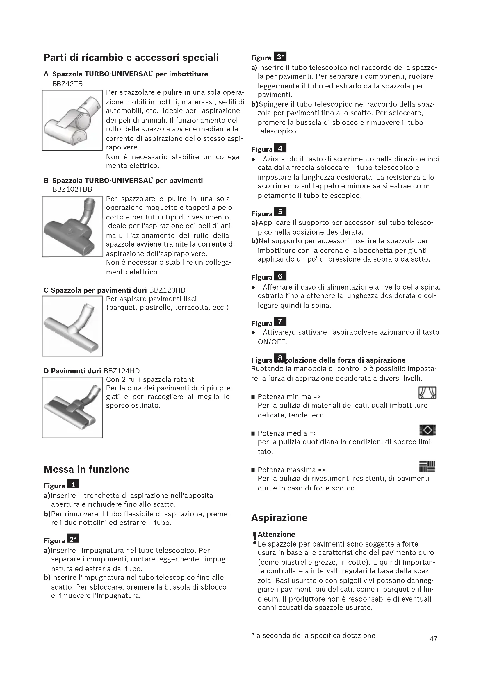 er pavimenti BBZ102TBB Per spazzolare e pulire in una sola operazione moquette e tappeti a pelo corto e per tutti i tipi di rivestimento. Ideale per l'aspirazione dei peli di ani- mali. L'azionamento del rullo della spazzola avviene tramite la corrente di aspirazione dell'aspirapolvere. Non è necessario stabilire un collega- mento elettrico. C Spazzola per pavimenti duri BBZ123HD Per aspirare pavimenti lisci (parquet, piastrelle, terracotta, ecc.) D Pavimenti duri BBZ124HD Con 2 rulli spazzola rotanti Per la cura dei pavimenti duri più pre- giati e per raccogliere al meglio lo sporco ostinato. Messa in funzione Figura a)Inserire il tronchetto di aspirazione nell'apposita apertura e richiudere fino allo scatto. b)Per rimuovere il tubo flessibile di aspirazione, preme- re i due nottolini ed estrarre il tubo. Figura a)Inserire l'impugnatura nel tubo telescopico. Per separare i componenti, ruotare leggermente l'impug- natura ed estrarla dal tubo. b)Inserire l'impugnatura nel tubo telescopico fino allo scatto. Per sbloccare, premere la bussola di sblocco e rimuovere l'impugnatura.