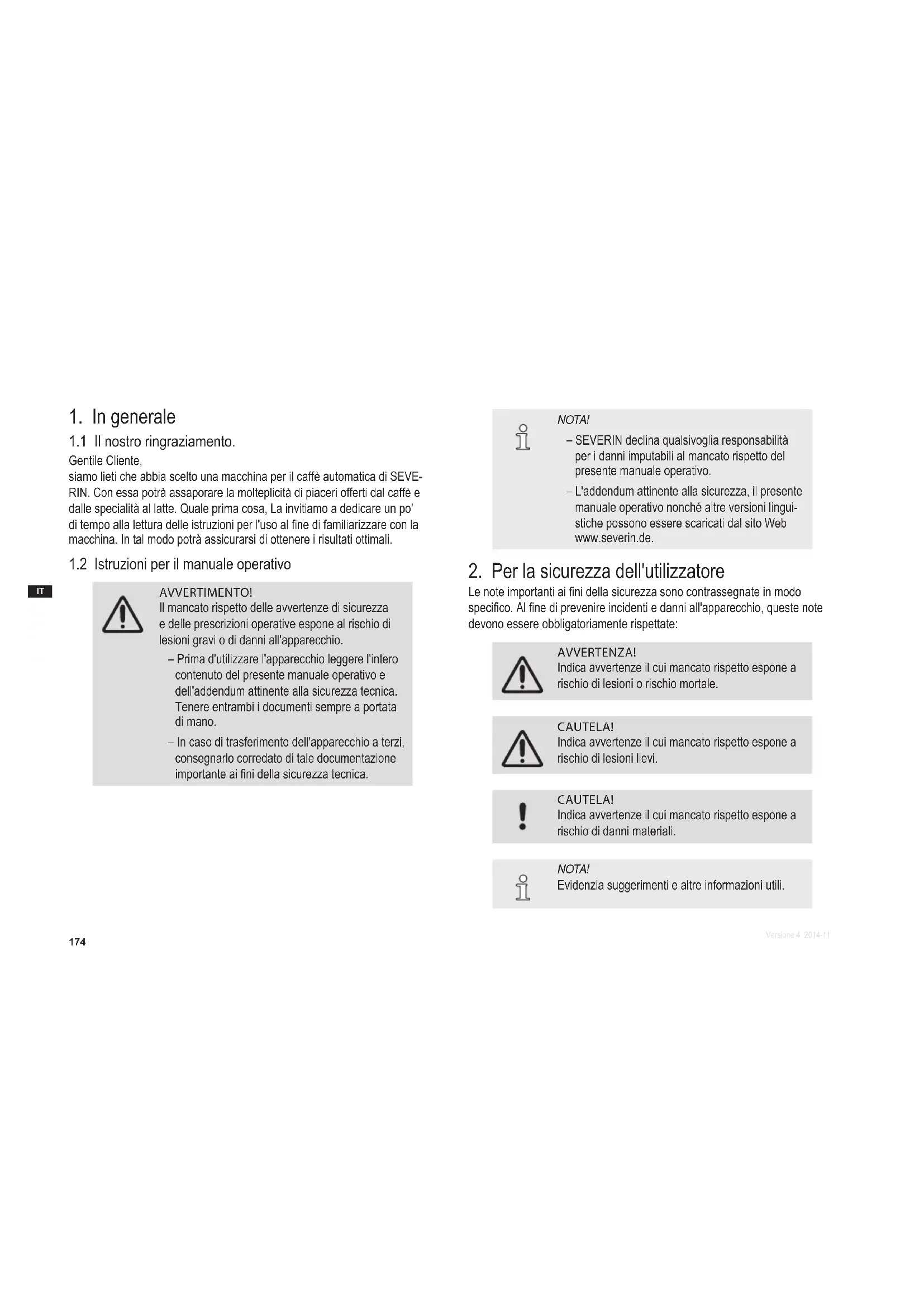 AVVERTIMENTO! Il mancato rispetto delle avvertenze di sicurezza e delle prescrizioni operative espone al rischio di lesioni gravi o di danni all'apparecchio. – Prima d'utilizzare l'apparecchio leggere l'intero contenuto del presente manuale operativo e dell'addendum attinente alla sicurezza tecnica. Tenere entrambi i documenti sempre a portata di mano. – In caso di trasferimento dell'apparecchio a terzi, consegnarlo corredato di tale documentazione importante ai ni della sicurezza tecnica. NO TA! – SEVERIN declina qualsivoglia responsabilità per i danni imputabili al mancato rispetto del presente manuale operativo. – L'addendum attinente alla sicurezza, il presente manuale operativo nonché altre versioni lingui- stiche possono essere scaricati dal sito Web www.severin.de.