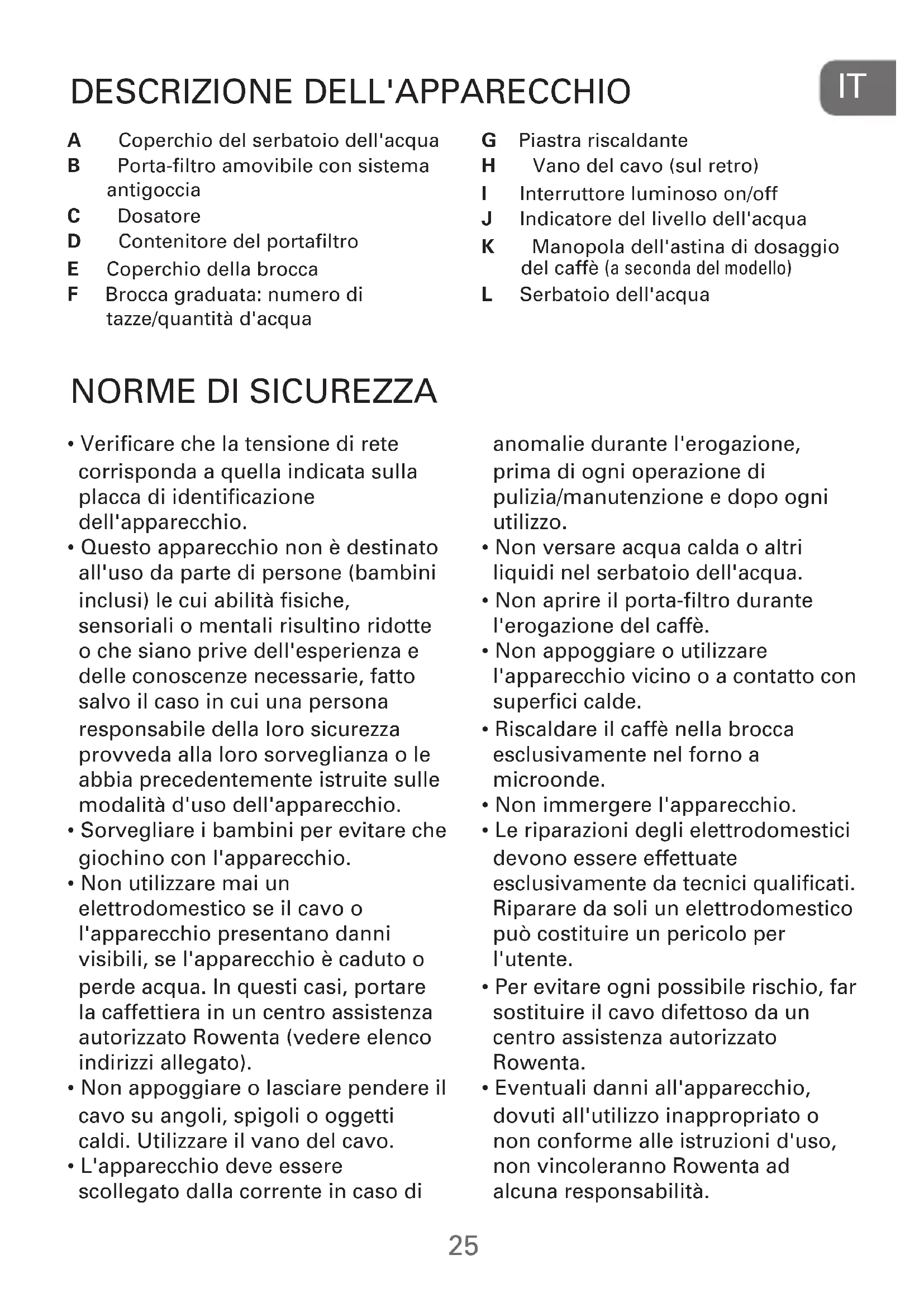 - Non utilizzare mai un elettrodomestico se il cavo o l'apparecchio presentano danni visibili, se l'apparecchio è caduto o perde acqua. In questi casi, portare la caffettiera in un centro assistenza autorizzato Rowenta (vedere elenco indirizzi allegato).