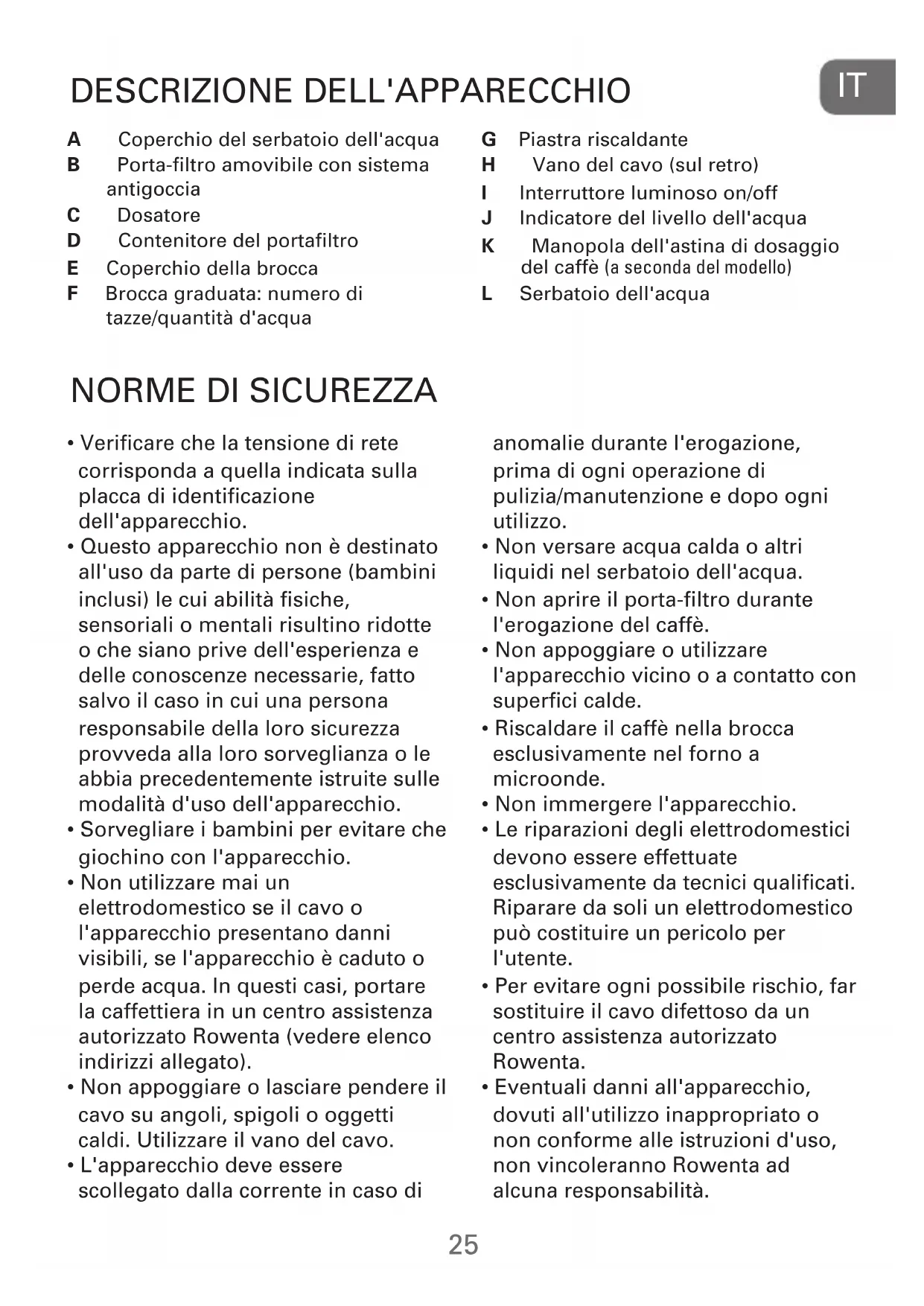 - Non utilizzare mai un elettrodomestico se il cavo o l'apparecchio presentano danni visibili, se l'apparecchio è caduto o perde acqua. In questi casi, portare la caffettiera in un centro assistenza autorizzato Rowenta (vedere elenco indirizzi allegato).