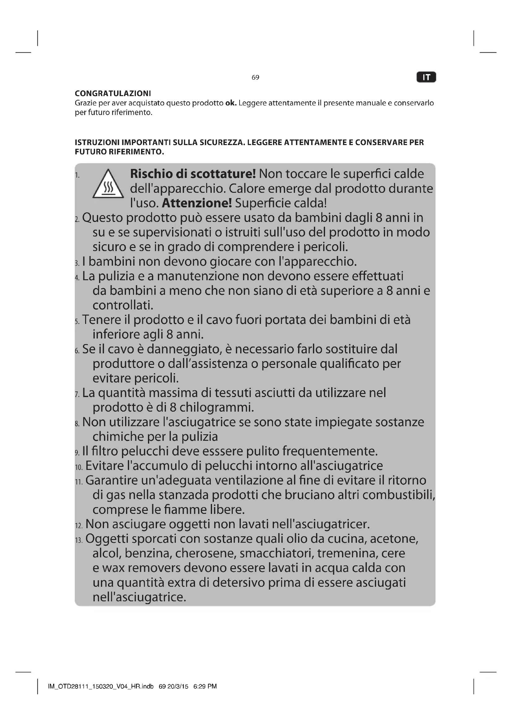 - Oggetti sporcati con sostanze quali olio da cucina, acetone, alcol, benzina, cherosene, smacchiatori, tremenina, cere e wax removers devono essere lavati in acqua calda con una quantità extra di detersivo prima di essere asciugati nell'asciugatrice.