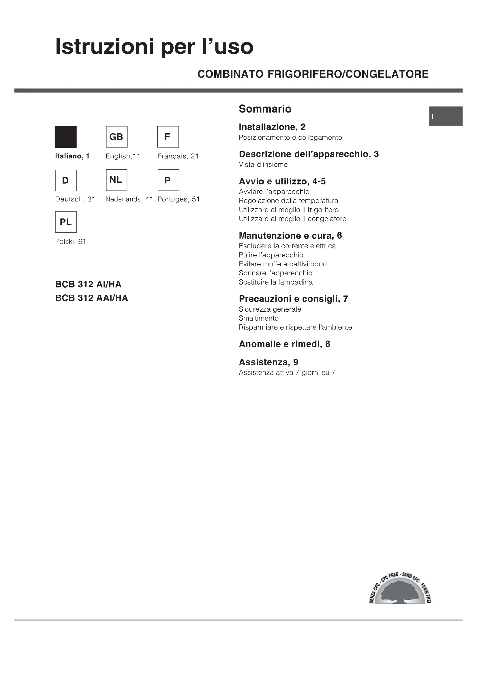 Sommario Installazione, 2 Posizionamento e collegamento Descrizione dell’apparecchio, 3 Vista d’insieme Avvio e utilizzo, 4-5 Avviare l’apparecchio Regolazione della temperatura Utilizzare al meglio il frigorifero Utilizzare al meglio il congelatore Manutenzione e cura, 6 Escludere la corrente elettrica Pulire l’apparecchio Evitare muffe e cattivi odori Sbrinare l’apparecchio Sostituire la lampadina Precauzioni e consigli, 7 Sicurezza generale Smaltimento Risparmiare e rispettare l’ambiente Anomalie e rimedi, 8 Assistenza, 9 Assistenza attiva 7 giorni su 7 Italiano, 1 Portuges, 51 English,11 GBI