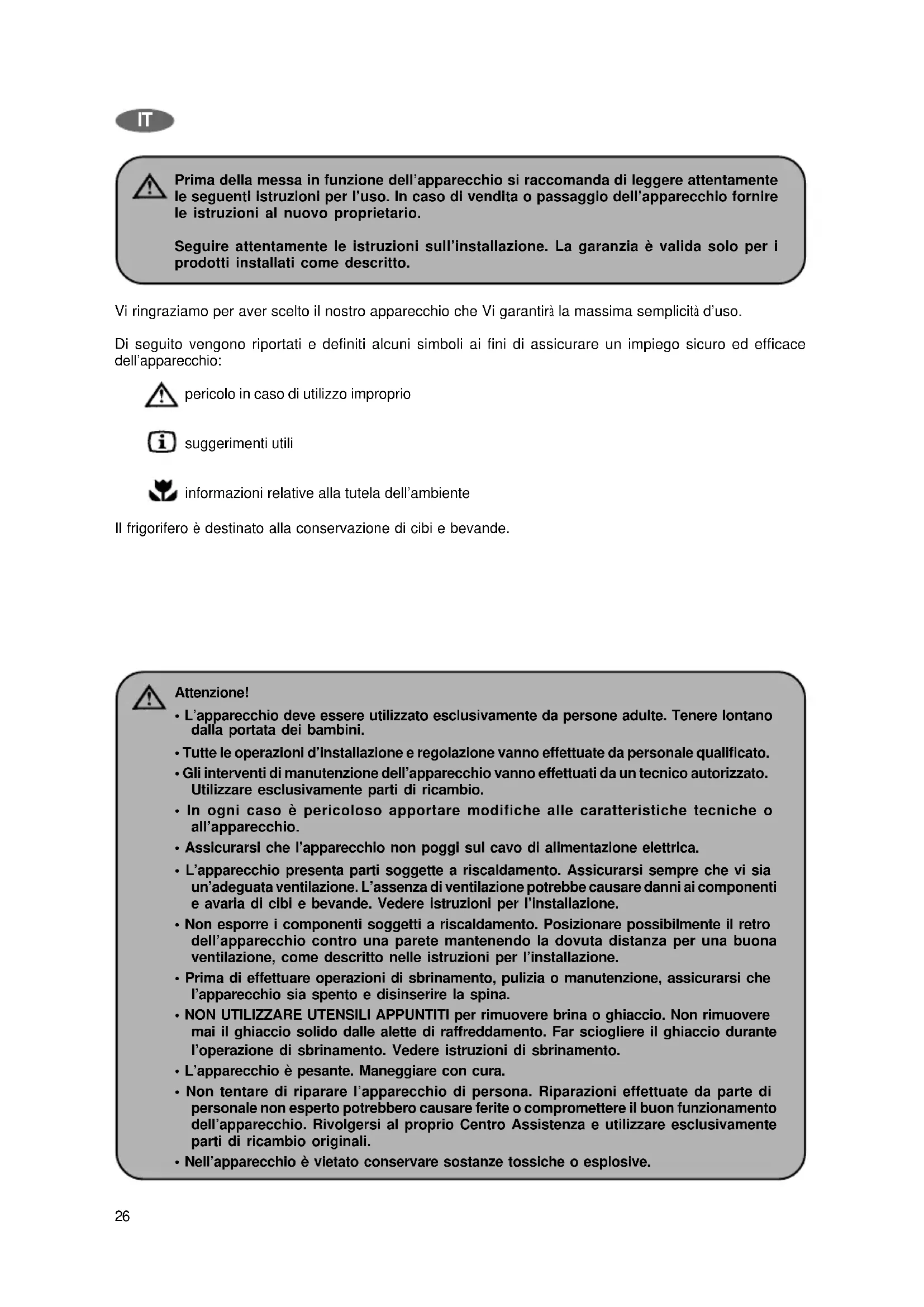 Prima della messa in funzione dell’apparecchio si raccomanda di leggere attentamente le seguenti istruzioni per l’uso. In caso di vendita o passaggio dell’apparecchio fornire le istruzioni al nuovo proprietario. Seguire attentamente le istruzioni sull’installazione. La garanzia è valida solo per i prodotti installati come descritto. Vi ringraziamo per aver scelto il nostro apparecchio che Vi garantirà la massima semplicità d’uso. Di seguito vengono riportati e definiti alcuni simboli ai fini di assicurare un impiego sicuro ed efficace dell’apparecchio: pericolo in caso di utilizzo improprio suggerimenti utili informazioni relative alla tutela dell’ambiente Il frigorifero è destinato alla conservazione di cibi e bevande. Attenzione!