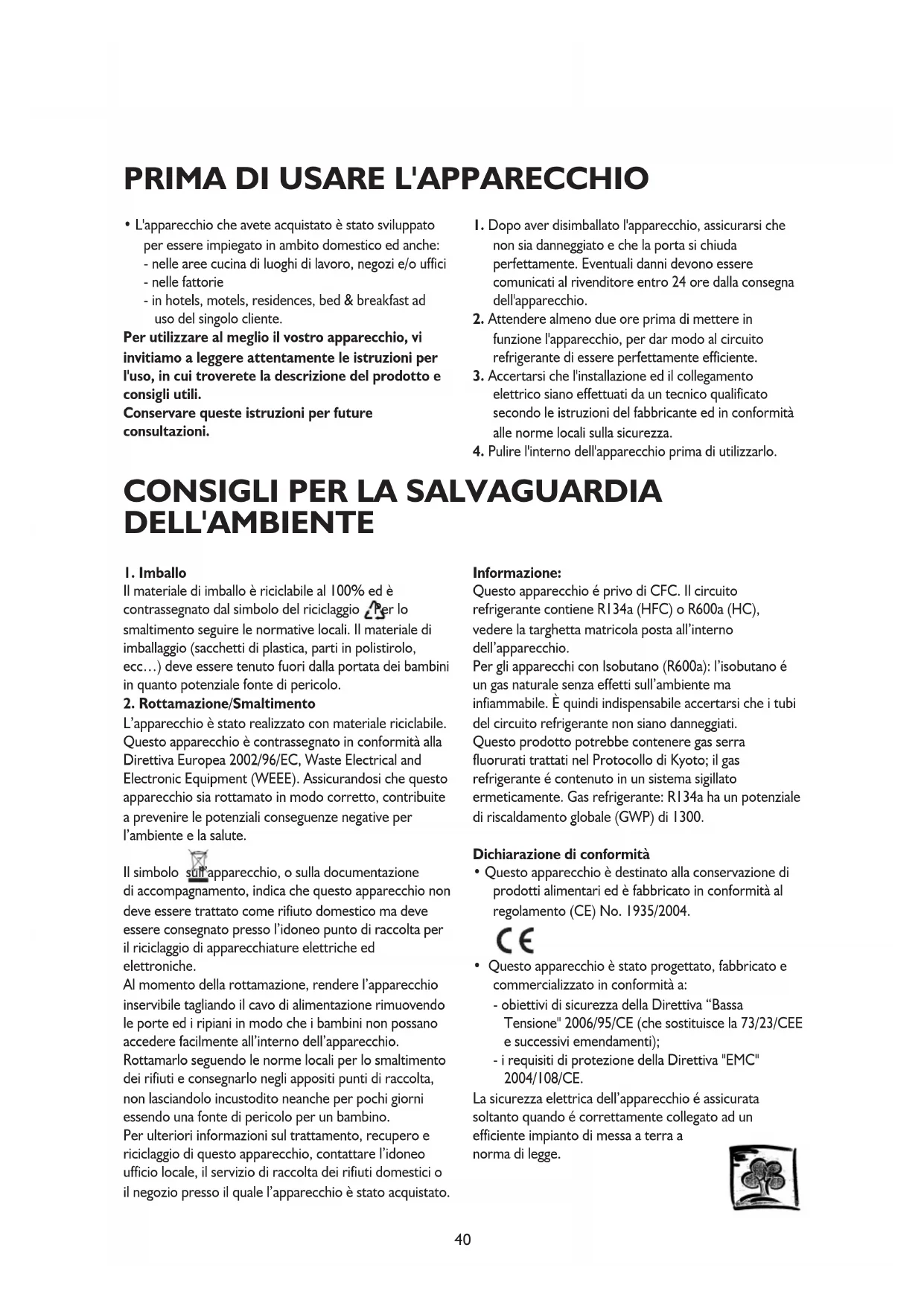 L’apparecchio è stato realizzato con materiale riciclabile. Questo apparecchio è contrassegnato in conformità alla Direttiva Europea 2002/96/EC, Waste Electrical and Electronic Equipment (WEEE). Assicurandosi che questo apparecchio sia rottamato in modo corretto, contribuite a prevenire le potenziali conseguenze negative per l’ambiente e la salute. Il simbolo sull’apparecchio, o sulla documentazione di accompagnamento, indica che questo apparecchio non deve essere trattato come rifiuto domestico ma deve essere consegnato presso l’idoneo punto di raccolta per il riciclaggio di apparecchiature elettriche ed elettroniche. Al momento della rottamazione, rendere l’apparecchio inservibile tagliando il cavo di alimentazione rimuovendo le porte ed i ripiani in modo che i bambini non possano accedere facilmente all’interno dell’apparecchio. Rottamarlo seguendo le norme locali per lo smaltimento dei rifiuti e consegnarlo negli appositi punti di raccolta, non lasciandolo incustodito neanche per pochi giorni essendo una fonte di pericolo per un bambino. Per ulteriori informazioni sul trattamento, recupero e riciclaggio di questo apparecchio, contattare l’idoneo ufficio locale, il servizio di raccolta dei rifiuti domestici o il negozio presso il quale l’apparecchio è stato acquistato. Informazione: Questo apparecchio é privo di CFC. Il circuito refrigerante contiene R134a (HFC) o R600a (HC), vedere la targhetta matricola posta all’interno dell’apparecchio. Per gli apparecchi con Isobutano (R600a): l’isobutano é un gas naturale senza effetti sull’ambiente ma infiammabile. È quindi indispensabile accertarsi che i tubi del circuito refrigerante non siano danneggiati. Questo prodotto potrebbe contenere gas serra fluorurati trattati nel Protocollo di Kyoto; il gas refrigerante é contenuto in un sistema sigillato ermeticamente. Gas refrigerante: R134a ha un potenziale di riscaldamento globale (GWP) di 1300. Dichiarazione di conformità