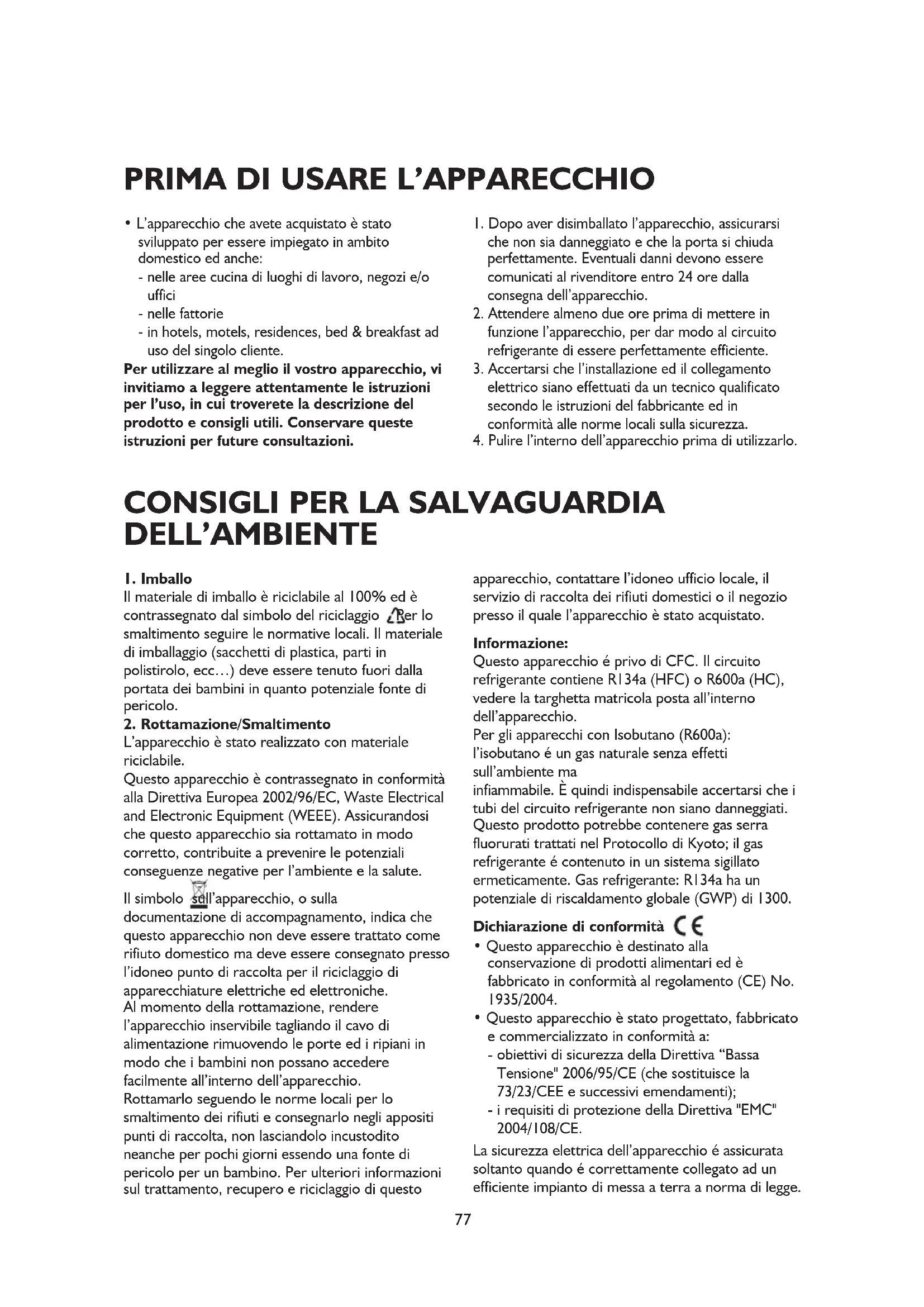 L’apparecchio è stato realizzato con materiale riciclabile. Questo apparecchio è contrassegnato in conformità alla Direttiva Europea 2002/96/EC, Waste Electrical and Electronic Equipment (WEEE). Assicurandosi che questo apparecchio sia rottamato in modo corretto, contribuite a prevenire le potenziali conseguenze negative per l’ambiente e la salute. Il simbolo sull’apparecchio, o sulla documentazione di accompagnamento, indica che questo apparecchio non deve essere trattato come rifiuto domestico ma deve essere consegnato presso l’idoneo punto di raccolta per il riciclaggio di apparecchiature elettriche ed elettroniche. Al momento della rottamazione, rendere l’apparecchio inservibile tagliando il cavo di alimentazione rimuovendo le porte ed i ripiani in modo che i bambini non possano accedere facilmente all’interno dell’apparecchio. Rottamarlo seguendo le norme locali per lo smaltimento dei rifiuti e consegnarlo negli appositi punti di raccolta, non lasciandolo incustodito neanche per pochi giorni essendo una fonte di pericolo per un bambino. Per ulteriori informazioni sul trattamento, recupero e riciclaggio di questo apparecchio, contattare l’idoneo ufficio locale, il servizio di raccolta dei rifiuti domestici o il negozio presso il quale l’apparecchio è stato acquistato. Informazione: Questo apparecchio é privo di CFC. Il circuito refrigerante contiene R134a (HFC) o R600a (HC), vedere la targhetta matricola posta all’interno dell’apparecchio. Per gli apparecchi con Isobutano (R600a): l’isobutano é un gas naturale senza effetti sull’ambiente ma infiammabile. È quindi indispensabile accertarsi che i tubi del circuito refrigerante non siano danneggiati. Questo prodotto potrebbe contenere gas serra fluorurati trattati nel Protocollo di Kyoto; il gas refrigerante é contenuto in un sistema sigillato ermeticamente. Gas refrigerante: R134a ha un potenziale di riscaldamento globale (GWP) di 1300. Dichiarazione di conformità