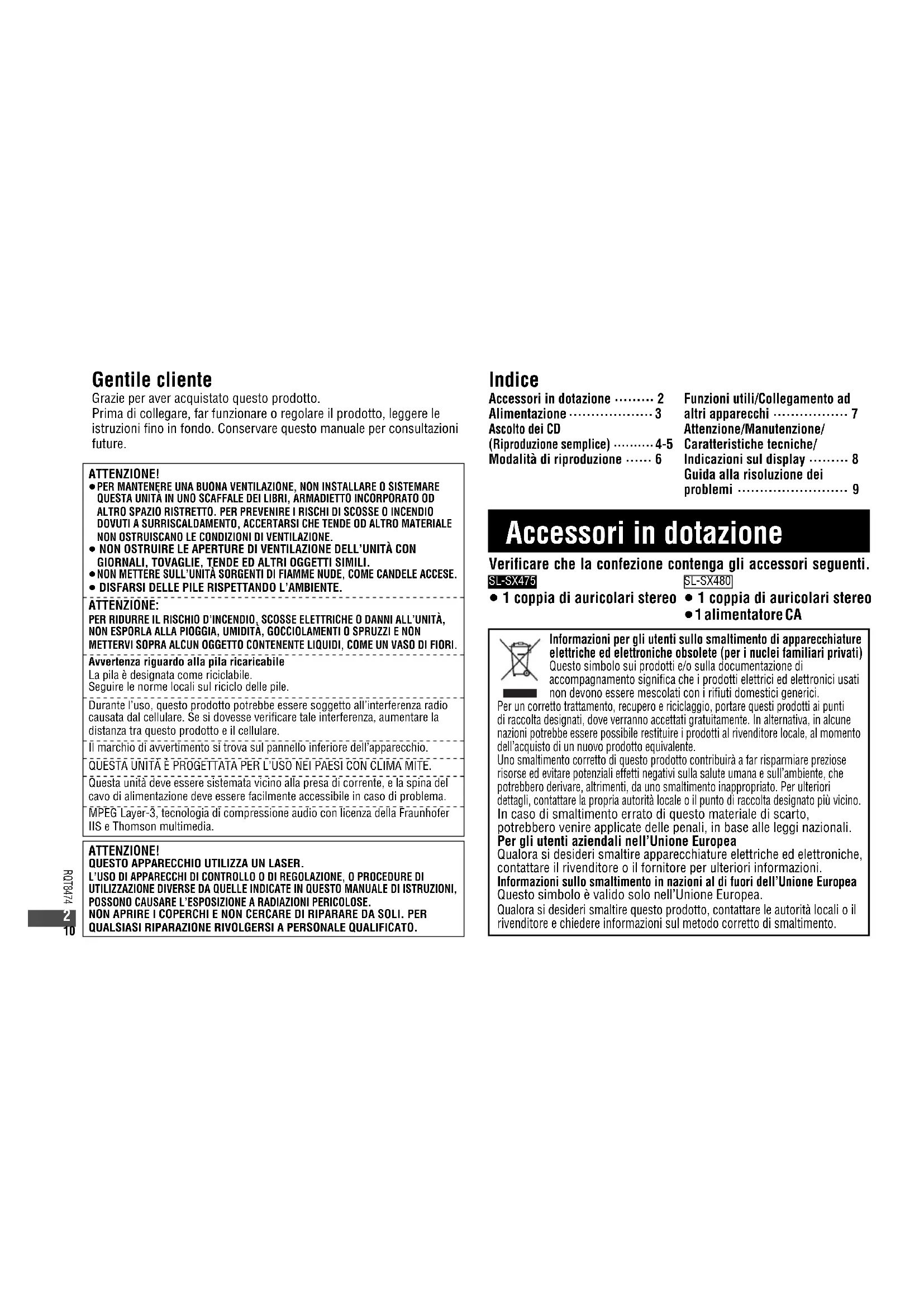Se ricaricate completamente.p Il tempo di riproduzione può essere inferiore, a seconda delle condizioni d’uso.p Il tempo di riproduzione sarà notevolmente ridotto con la riproduzione di CD-RW.wTempo di ricarica Da 3 a 4 ore circawAudio (CD-DA)Frequenza di campionamento: 44,1 kHzN. di canali: 2 (sinistro e destro, stereo)Risposta in frequenza: Da 20 Hz a 20.000 Hz(Kda 0 dB a L3,6 dB)Livello di uscita cuffia: RMS max. 8 mWK8 mW/16 j (regolabile)wPickupFonte di luce: Laser a semiconduttoreLunghezza d’onda: 795 nmwMP3Bit-rate supportati(Bit-rate variabili supportati): Da 32 kbps a 320 kbps(consigliati 128 kbps)Frequenze di campionamento supportate: 48 kHz/44,1 kHz/32 kHzMassimo numero di elementi (n. complessivo di album e brani): 999 (n. complessivo di album): 500Massimo numero di livelli degli album: 100wGeneraliSL-SX475Alimentazione: Ingresso DC (tramite alimentatore CA, non in dotazione): DC 4,5 VSL-SX480Alimentazione: Ingresso DC(tramite alimentatore CA in dotazione): DC 4,5 V Ingresso alimentatore CA: CA da 220 a 230 V 50/60 HzAssorbimento: Utilizzando l’alimentatore CA(MP3/CD-DA): 1,4 W/1,2 W In ricarica: 3,6 WDimensioni (LCACP): 138,6 mmC24,4 mmC138,6 mm Peso: 209 g (batterie incluse) 162 g (batterie escluse) Gamma di temperature di esercizio: da 0 GC a 40 GC Gamma di temperature per la ricarica: da 5 GC a 40 GC Assorbimento di corrente dell’alimentatore CA in condizione di attesa: 0,3 WNota:Le caratteristiche tecniche sono soggette a modifica senza preavviso.Il peso e le dimensioni sono approssimativi. Caratteristiche tecniche