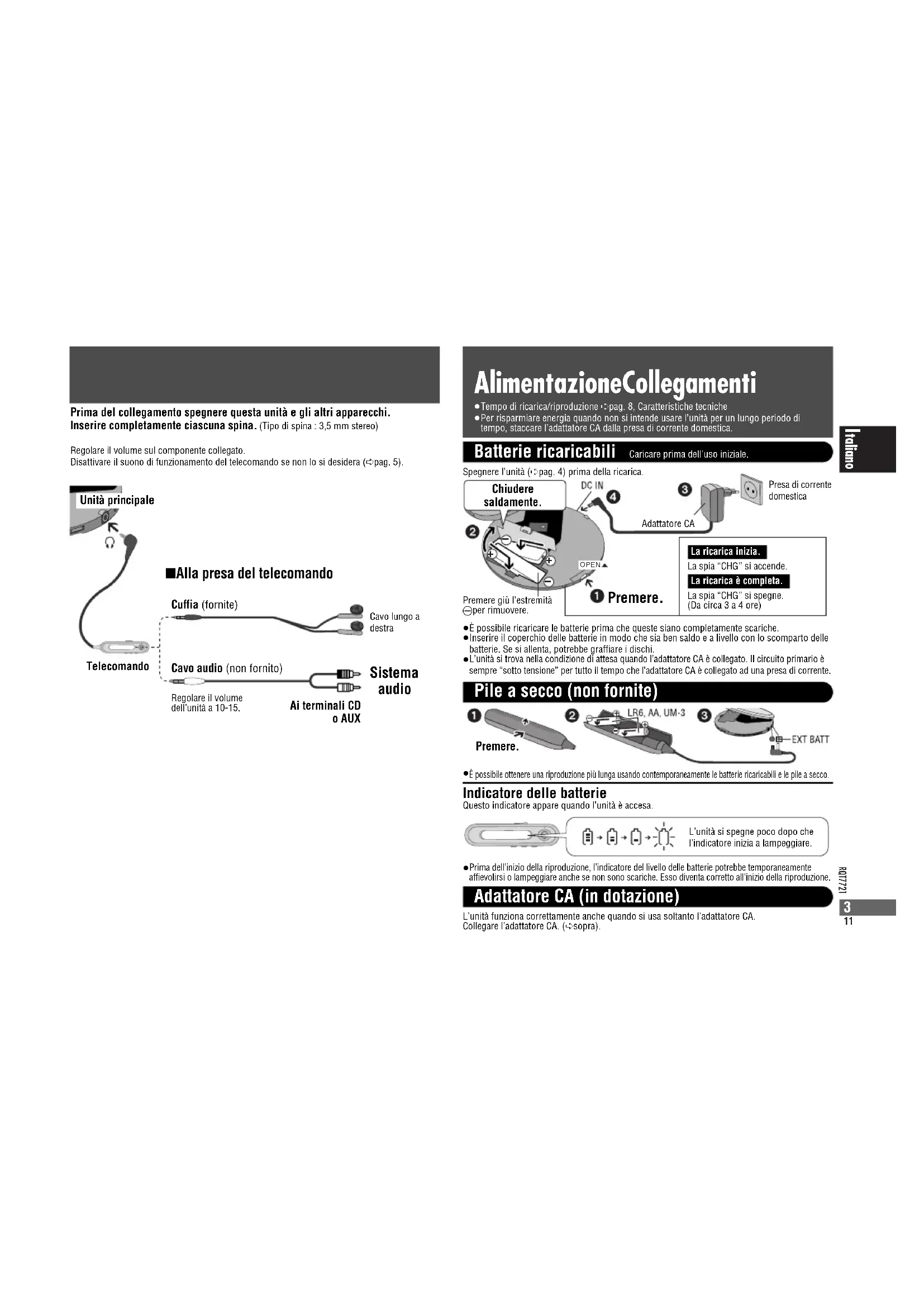 OPEN Premere. Adattatore CAPresa di correntedomesticaChiuderesaldamente.Premere giù l’estremità- per rimuovere.La spia “CHG” si spegne.(Da circa 3 a 4 ore)La spia “CHG” si accende.Premere. Prima dell’inizio della riproduzione, l’indicatore del livello delle batterie potrebbe temporaneamenteaffievolirsi o lampeggiare anche se non sono scariche. Esso diventa corretto all’inizio della riproduzione.L’unità funziona correttamente anche quando si usa soltanto l’adattatore CA.Collegare l’adattatore CA. (➪sopra).Spegnere l’unità (➪pag. 4) prima della ricarica.La ricarica inizia.La ricarica è completa. È possibile ottenere una riproduzione più lunga usando contemporaneamente le batterie ricaricabili e le pile a secco. Indicatore delle batterie Questo indicatore appare quando l’unità è accesa.L’unità si spegne poco dopo chel’indicatore inizia a lampeggiare.≥È possibile ricaricare le batterie prima che queste siano completamente scariche. ≥Inserire il coperchio delle batterie in modo che sia ben saldo e a livello con lo scomparto delle batterie. Se si allenta, potrebbe graffiare i dischi. L’unità si trova nella condizione di attesa quando l’adattatore CA è collegato. Il circuito primario èsempre “sotto tensione” per tutto il tempo che l’adattatore CA è collegato ad una presa di corrente. ≥Tempo di ricarica/riproduzione ➪pag. 8, Caratteristiche tecniche ≥Per risparmiare energia quando non si intende usare l’unità per un lungo periodo ditempo, staccare l’adattatore CA dalla presa di corrente domestica.