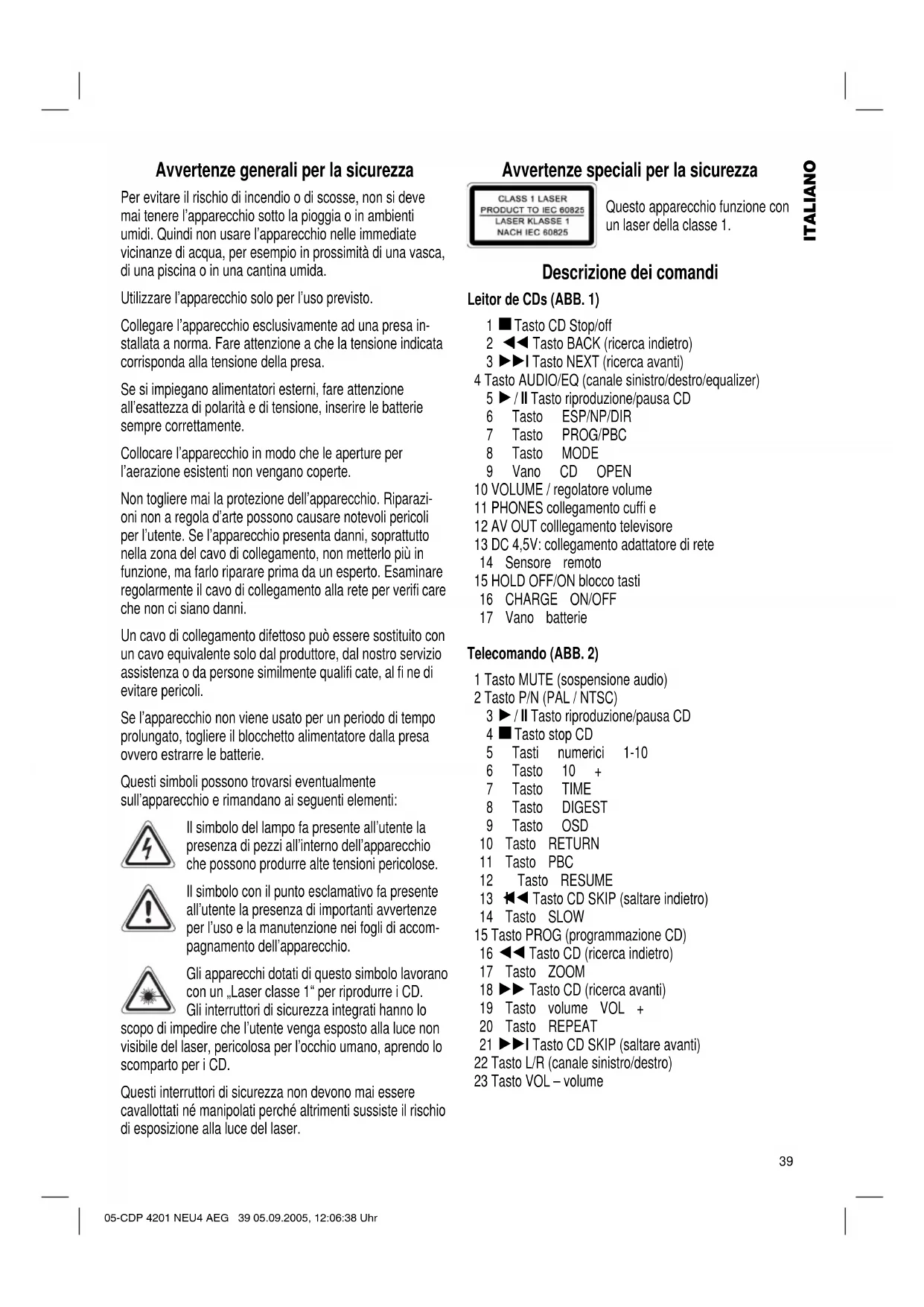 Gli apparecchi dotati di questo simbolo lavorano con un „Laser classe 1“ per riprodurre i CD. Gli interruttori di sicurezza integrati hanno lo
