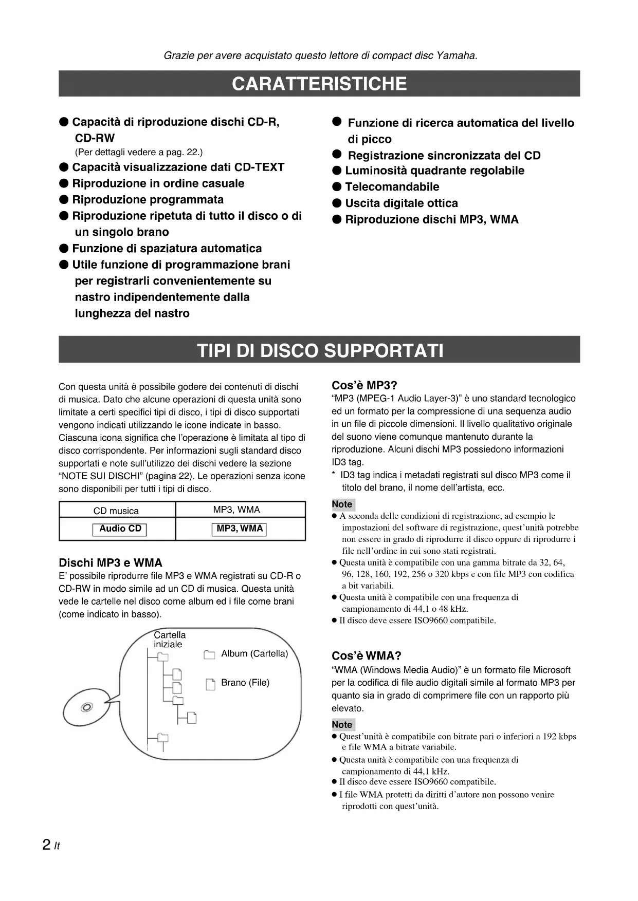 CD musica Dischi MP3 e WMA E’ possibile riprodurre file MP3 e WMA registrati su CD-R o CD-RW in modo simile ad un CD di musica. Questa unità vede le cartelle nel disco come album ed i file come brani (come indicato in basso). Cartella iniziale Brano (File) Album (Cartella) MP3, WMA Audio CD Grazie per avere acquistato questo lettore di compact disc Yamaha. 䢇 Capacità di riproduzione dischi CD-R, CD-RW (Per dettagli vedere a pag. 22.) 䢇 Capacità visualizzazione dati CD-TEXT 䢇 Riproduzione in ordine casuale 䢇 Riproduzione programmata 䢇 Riproduzione ripetuta di tutto il disco o di un singolo brano 䢇 Funzione di spaziatura automatica 䢇 Utile funzione di programmazione brani per registrarli convenientemente su nastro indipendentemente dalla lunghezza del nastro CARATTERISTICHE MP3, WMA 05It_02_BOD_CDX-397MK2_G.p65 29/1/07, 1:32 PM23