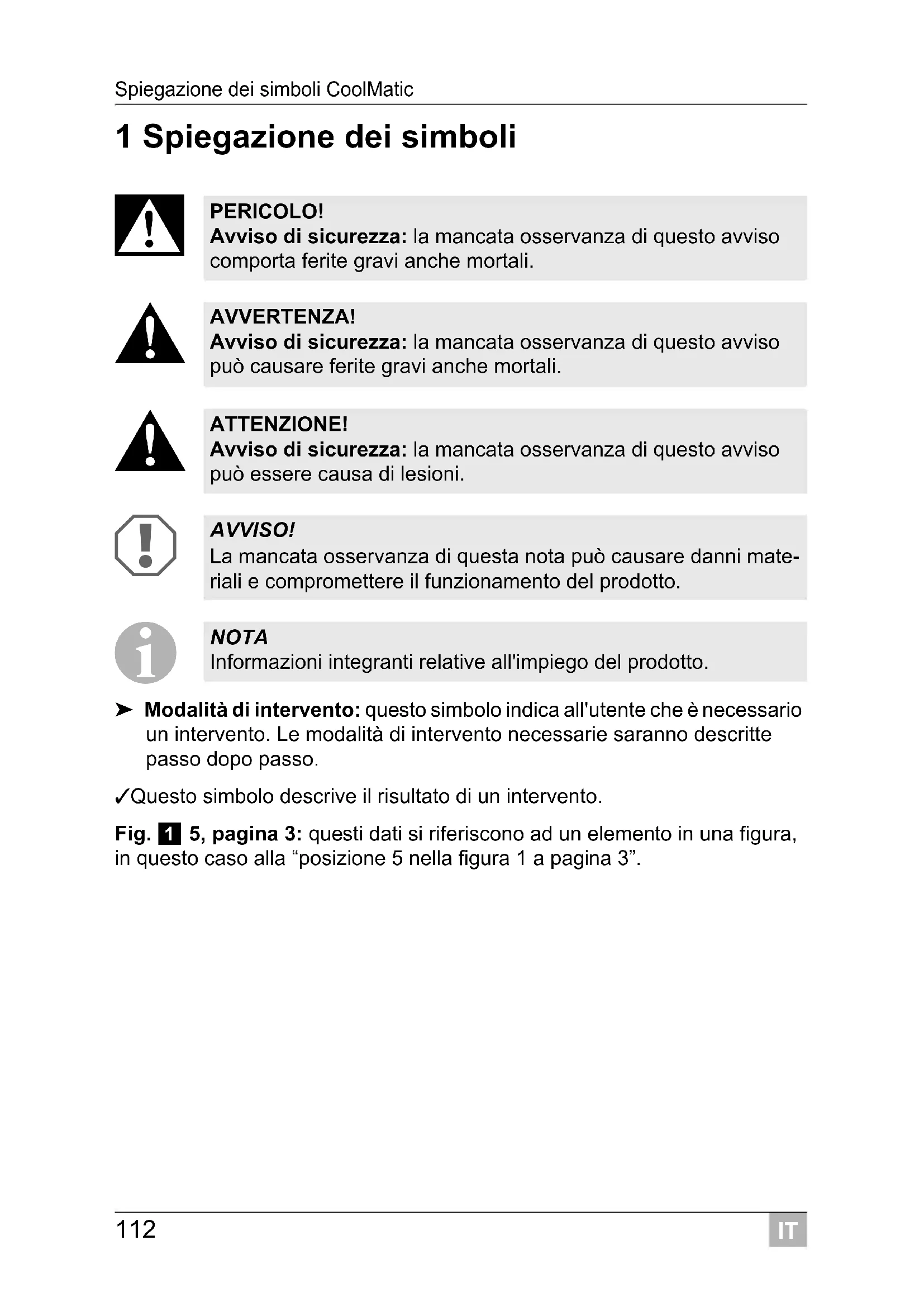 ➤ Modalità di intervento: questo simbolo indica all'utente che è necessario un intervento. Le modalità di intervento necessarie saranno descritte passo dopo passo. ✓ Questo simbolo descrive il risultato di un intervento. Fig. 1 5, pagina 3: questi dati si riferiscono ad un elemento in una figura, in questo caso alla “posizione 5 nella figura 1 a pagina 3”. PERICOLO! Avviso di sicurezza: la mancata osservanza di questo avviso comporta ferite gravi anche mortali. AVVERTENZA! Avviso di sicurezza: la mancata osservanza di questo avviso può causare ferite gravi anche mortali. ATTENZIONE! Avviso di sicurezza: la mancata osservanza di questo avviso può essere causa di lesioni. AVVISO! La mancata osservanza di questa nota può causare danni mate- riali e compromettere il funzionamento del prodotto. NOTA Informazioni integranti relative all'impiego del prodotto.IT CoolMatic Istruzioni per la sicurezza