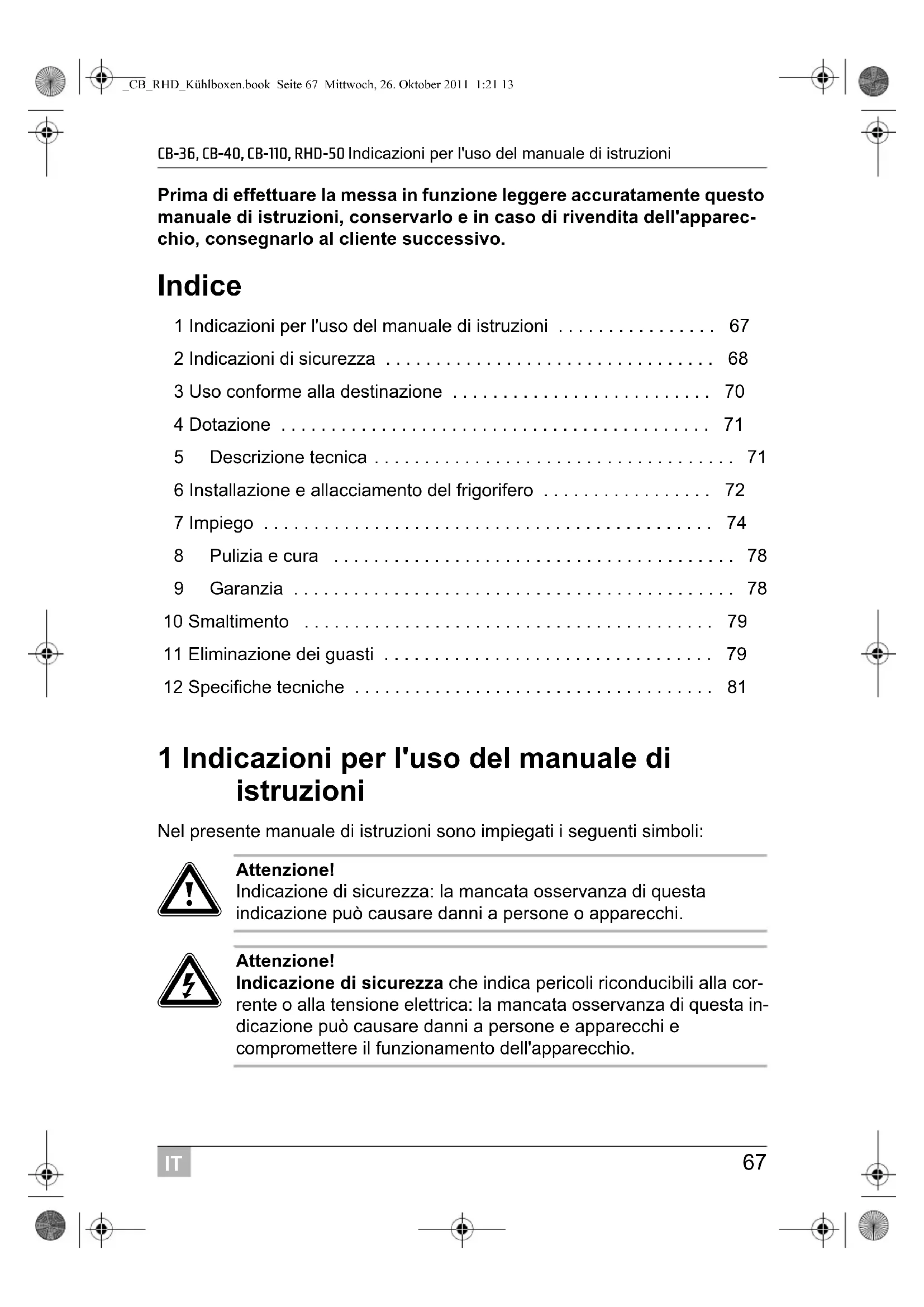Attenzione! Indicazione di sicurezza che indica pericoli riconducibili alla cor- rente o alla tensione elettrica: la mancata osservanza di questa in- dicazione può causare danni a persone e apparecchi e compromettere il funzionamento dell'apparecchio. _CB_RHD_Kühlboxen.book Seite 67 Mittwoch, 26. Oktober 2011 1:21 13IT Indicazioni di sicurezza CB-36, CB-40, CB-110, RHD-50