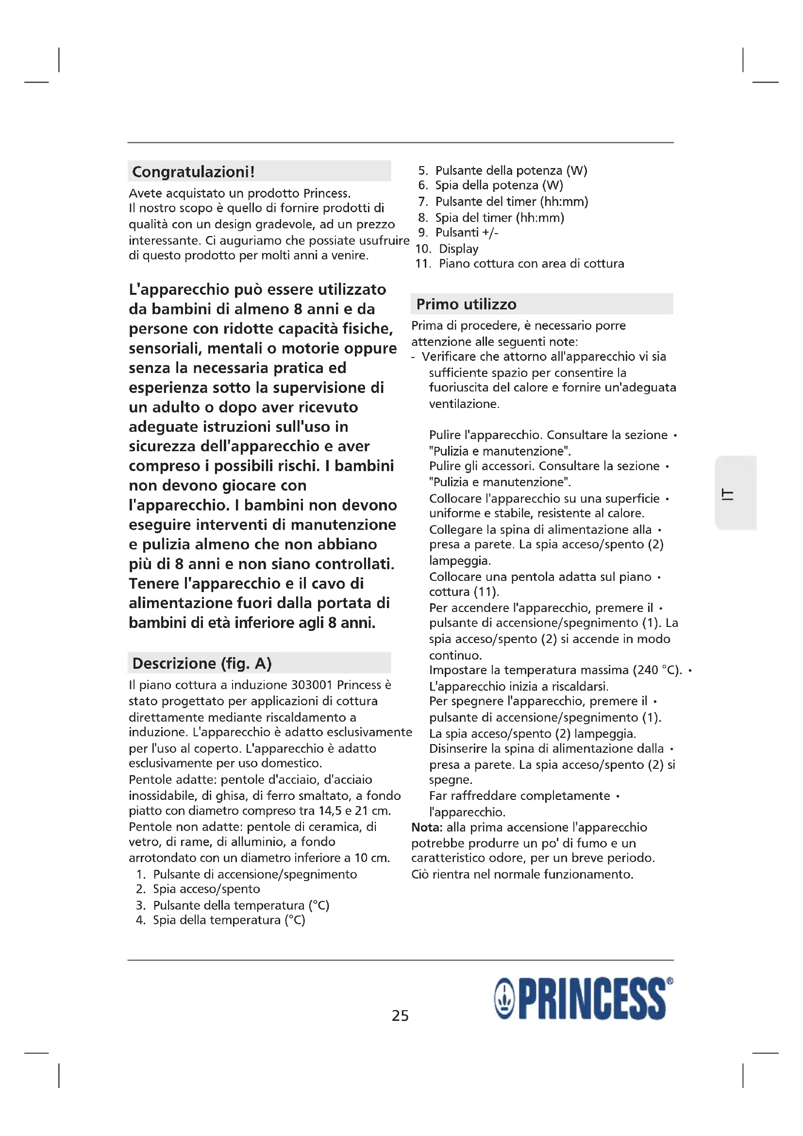 Congratulazioni! Avete acquistato un prodotto Princess. Il nostro scopo è quello di fornire prodotti di qualità con un design gradevole, ad un prezzo interessante. Ci auguriamo che possiate usufruire di questo prodotto per molti anni a venire. L'apparecchio può essere utilizzato da bambini di almeno 8 anni e da persone con ridotte capacità fisiche, sensoriali, mentali o motorie oppure senza la necessaria pratica ed esperienza sotto la supervisione di un adulto o dopo aver ricevuto adeguate istruzioni sull'uso in sicurezza dell'apparecchio e aver compreso i possibili rischi. I bambini non devono giocare con l'apparecchio. I bambini non devono eseguire interventi di manutenzione e pulizia almeno che non abbiano più di 8 anni e non siano controllati. Tenere l'apparecchio e il cavo di alimentazione fuori dalla portata di bambini di età inferiore agli 8 anni. Descrizione (fig. A) Il piano cottura a induzione 303001 Princess è stato progettato per applicazioni di cottura direttamente mediante riscaldamento a induzione. L'apparecchio è adatto esclusivamente per l'uso al coperto. L'apparecchio è adatto esclusivamente per uso domestico. Pentole adatte: pentole d'acciaio, d'acciaio inossidabile, di ghisa, di ferro smaltato, a fondo piatto con diametro compreso tra 14,5 e 21 cm. Pentole non adatte: pentole di ceramica, di vetro, di rame, di alluminio, a fondo arrotondato con un diametro inferiore a 10 cm.