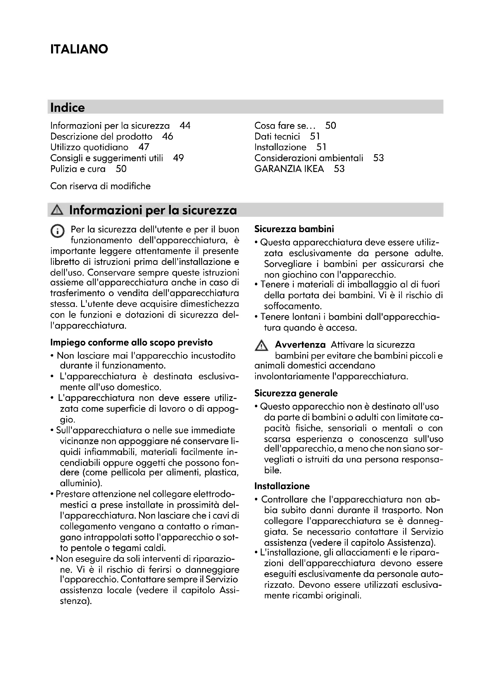 - Tagliare il cavo di alimentazione e smaltirlo adeguatamente. GARANZIA IKEA Validità della garanzia La presente garanzia è valida per cinque (5) anni a partire dalla data di acquisto originale del Vostro elettrodomestico presso un punto vendita IKEA. Per gli elettrodomestici LAGAN, la garanzia è di due (2) anni soltanto. Lo scon- trino originale è indispensabile come ricevuta d'acquisto. Una riparazione effettuata nel- l'ambito della garanzia non estende il periodo di garanzia per l'elettrodomestico o per i nuovi pezzi di ricambio. Elettrodomestici non coperti dalla garanzia IKEA di cinque (5) anni La garanzia IKEA di cinque anni non è valida per gli elettrodomestici con il nome LAGAN e tutti gli elettrodomestici acquistati presso un punto vendita IKEA prima dell'1 agosto 2007. Chi fornisce il servizio ai clienti? L'assistenza ai clienti sarà garantita dal forni- tore del servizio nominato da IKEA attraverso la propria organizzazione o la propria rete di partner di assistenza autorizzati. Cosa copre la garanzia? La garanzia copre gli eventuali difetti legati ai materiali e o alla costruzione dell'elettrodo- mestico ed è valida a partire dalla data di ac- quisto dell'elettrodomestico presso un punto vendita IKEA. La garanzia è valida solo su elettrodomestici destinati all'impiego dome- stico. Le eccezioni sono descritte alla voce "Cosa non copre la garanzia". Nel periodo di validità della garanzia, il fornitore del servizio nominato da IKEA sosterrà i costi per la ripa- razione, i pezzi di ricambio, la manodopera e le trasferte del personale di manutenzione, ammesso che il prodotto possa essere riparato senza costi troppo elevati e che il difetto legato ai materiali o alla costruzione rientri nella co- pertura dell garanzia. Queste condizioni sono conformi alle direttive EU (N. 99/44/CE) e alle norme e disposizioni locali applicabili. Le parti sostituite diventeranno di proprietà di IKEA. ITALIANO 53Come interverrà IKEA per risolvere il problema? Il fornitore del servizio nominato da IKEA esa- minerà il prodotto e deciderà a propria esclu- siva discrezione se lo stesso rientra nella co- pertura della garanzia. In caso affermativo, il fornitore del servizio nominato da IKEA o un suo partner di assistenza autorizzato provve- derà a propria esclusiva discrezione a ripara- re il prodotto difettoso o a sostituirlo con un prodotto uguale o equivalente. Cosa non copre la garanzia