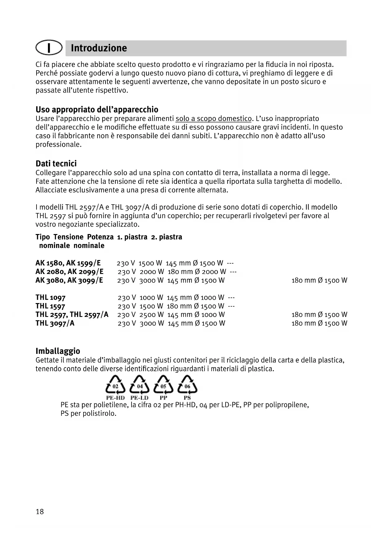 Technologie de chauffage plaque fonte plaque fonte plaque fonte Diamètre 14,5 cm 18 cm 14,5 cm et 18 cm Consommation d’énergie de la plaque de cuisson, calculée par kg 195 Wh/kg 195 Wh/kg 14,5 cm Ø: 195 Wh/kg 18 cm Ø: 195 Wh/kg Consommation d’énergie totale, par kg 195 Wh/kg 195 Wh/kg 195 Wh/kg18 Ci fa piacere che abbiate scelto questo prodotto e vi ringraziamo per la fiducia in noi riposta. Perché possiate godervi a lungo questo nuovo piano di cottura, vi preghiamo di leggere e di osservare attentamente le seguenti avvertenze, che vanno depositate in un posto sicuro e passate all’utente rispettivo. Uso appropriato dell’apparecchio Usare l’apparecchio per preparare alimenti solo a scopo domestico. L’uso inappropriato dell’apparecchio e le modifiche effettuate su di esso possono causare gravi incidenti. In questo caso il fabbricante non è responsabile dei danni subiti. L’apparecchio non è adatto all’uso professionale. Dati tecnici Collegare l’apparecchio solo ad una spina con contatto di terra, installata a norma di legge. Fate attenzione che la tensione di rete sia identica a quella riportata sulla targhetta di modello. Allacciate esclusivamente a una presa di corrente alternata. I modelli THL 2597/A e THL 3097/A di produzione di serie sono dotati di coperchio. Il modello THL 2597 si può fornire in aggiunta d’un coperchio; per recuperarli rivolgetevi per favore al vostro negoziante specializzato. Tipo Tensione Potenza 1. piastra 2. piastra nominale nominale AK 1580, AK 1599/E 230 V 1500 W 145 mm Ø 1500 W --- AK 2080, AK 2099/E 230 V 2000 W 180 mm Ø 2000 W --- AK 3080, AK 3099/E 230 V 3000 W 145 mm Ø 1500 W 180 mm Ø 1500 W THL 1097 230 V 1000 W 145 mm Ø 1000 W --- THL 1597 230 V 1500 W 180 mm Ø 1500 W ---
