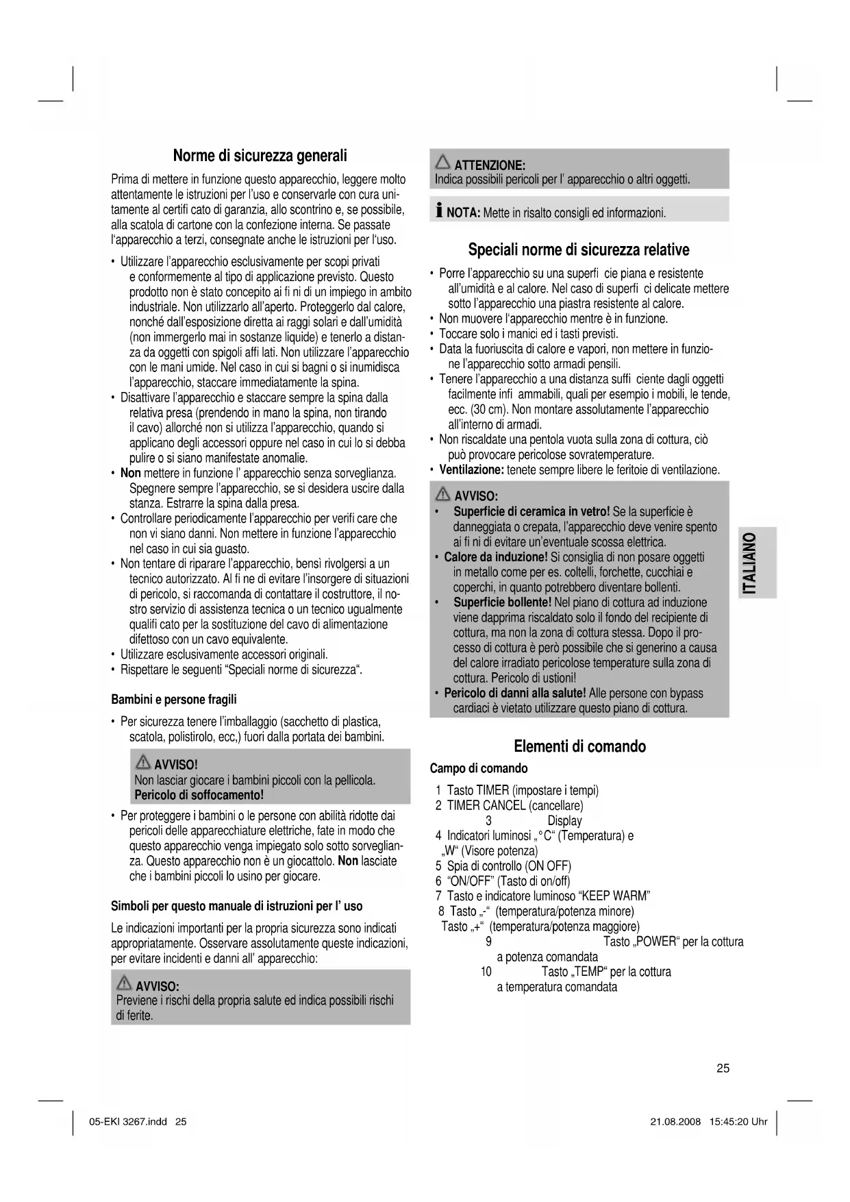 - Pericolo di danni alla salute! Alle persone con bypass cardiaci è vietato utilizzare questo piano di cottura. Elementi di comando Campo di comando 1 Tasto TIMER (impostare i tempi) 2 TIMER CANCEL (cancellare) 3 Display 4 Indicatori luminosi „°C“ (Temperatura) e „W“ (Visore potenza) 5 Spia di controllo (ON OFF) 6 “ON/OFF” (Tasto di on/off) 7 Tasto e indicatore luminoso “KEEP WARM” 8 Tasto „-“ (temperatura/potenza minore) Tasto „+“ (temperatura/potenza maggiore) 9 Tasto „POWER“ per la cottura a potenza comandata 10 Tasto „TEMP“ per la cottura a temperatura comandata 05-EKI 3267.indd 2505-EKI 3267.indd 25 21.08.2008 15:45:20 Uhr21.08.2008 15:45:20 Uhr26 ITALIANO ITALIANO Generalità Cucinare con induzione Nella cottura con induzione il calore si genera mediante forze magnetiche solo quando una pentola o una padella con fondo magnetizzabile viene collocata su una zona di cottura accesa. Ciò che si riscalda è solo il fondo, ma non la zona di cottura stessa. Sotto la vetroceramica si trova la bobina di induzione. Quando essa viene alimentata con energia elettrica si forma un campo magnetico che genera vortici nel fondo della pentola. In tal modo viene provocato un riscaldamento del fondo. Ciò permette di risparmiare energia, in quanto il calore si forma solo dove esso è necessario. Che tipo di pentolame posso impiegare? Per i piani di cottura ad induzione sono necessari pentole ossia fondi di pentola in materiale magnetizzabile. Oggigiorno il pentolame viene in tali casi munito della dicitura “fornello ad induzione”. Fondamentalmente potete utilizzare tutti i recipienti di cottura contenenti ferro; se essi sono effettivamente magnetizzabili lo potete constatare con un piccolo esperimento: mettete la pentola in questione sul piano. Se dopo che avete selezionato la funzione di cottura e acceso l’apparecchio viene emesso un segnale acustico, la pentola non è idonea. NOTA: Per motivi di sicurezza l’apparecchio passa dopo pochi secon- di nella condizione di pronto per l’uso. Come pentolame non si possono utilizzare recipienti com- posti dei seguenti materiali: argilla, vetro o alluminio. È vietato utilizzare i seguenti tipi di pentola: Pentole con fondo rotondo. Pentole il cui fondo ha un diametro inferiore a 12cm. Pentole sorrette da piedini Allacciamento elettrico Potenza allacciata Complessivamente il piano di cottura può assorbire una potenza di 2000 W. Con questa potenza allacciata si consiglia una linea di alimentazione separata con una protezione mediante un interruttore automatico domestico da 16 A. AVVISO DI SOVRACCARICO! Non utilizzate prolunghe di cavi o prese multiple, in quanto questo apparecchio ha una potenza troppo elevata. Collegamento