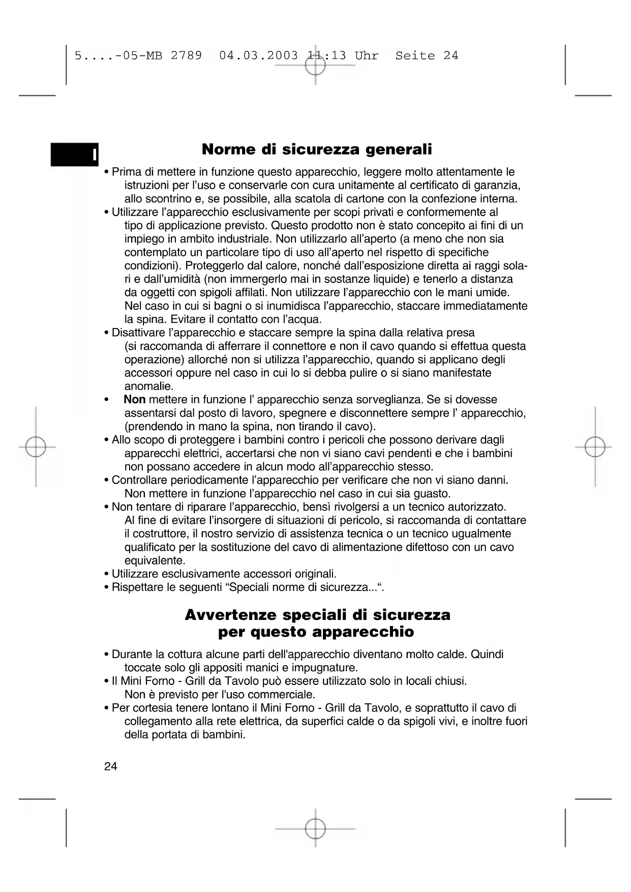 5....-05-MB 2789 04.03.2003 11:13 Uhr Seite 24Presentazione degli elementi di comando 1 Selettore tipo di cottura 4 Finestra (AUS-OBEN-UNTEN-DUAL) 5 Manico 2 Timer 15 minuti 6 Teglia di cottura 3 Griglia briciole Messa in esercizio