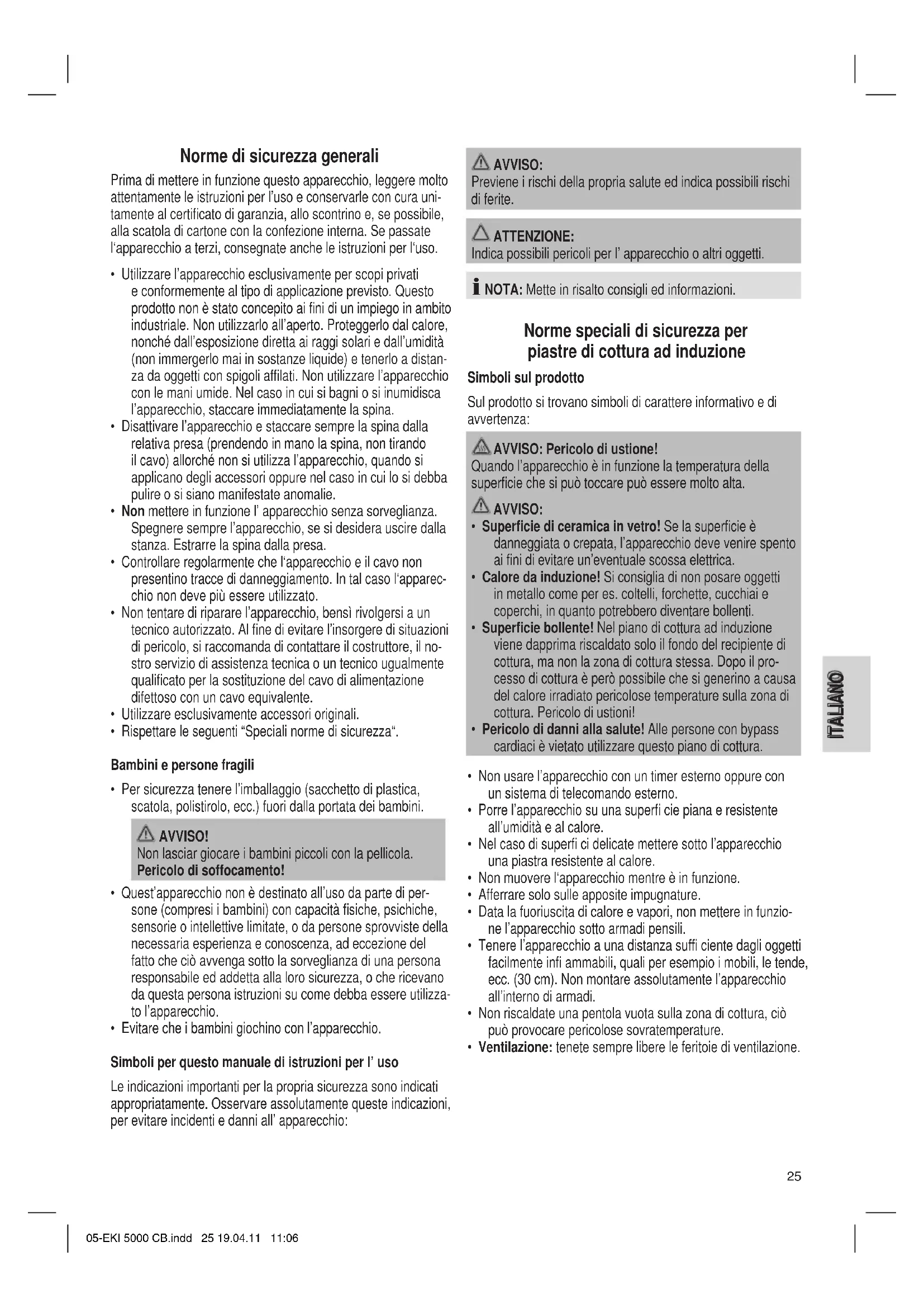 - Il piano di cottura si spegne improvvisamente durante il funzionamento. Possibile causa: La protezione contro le sovratemperature è intervenuta. 05-EKI 5000 CB.indd 27 19.04.11 11:0628 ITALIANO Rimedio: Separate l’apparecchio dalla rete di alimentazione di energia elettrica e fatelo raffreddare per ca. 20 min. Rimettetelo poi in funzione. Ulteriore causa: Le feritoie di ventilazione sono coperte. Rimedio: Liberate le feritoie di ventilazione da corpi estranei. Ulteriore causa: La piastra di cottura è stata spenta automaticamente dopo 120 minuti. Segnalazione dei guasti Durante il funzionamento vengono visualizzati sul display i seguenti messaggi: Messaggio E1,E2, E4, E5, Eb, EC In questo caso vi è un problema nel comando elettronico. E3, E6 Sovratemperatura. Vedi al capitolo sull’eliminazione dei guasti. E7, E8 Sovratensione o sottotensione. Controllate la rete di alimentazione elettrica! Dati tecnici Modello: .................................................................... EKI 5000 CB Alimentazione rete: ......................................220–240 V, 50/60 Hz Consumo di energia: .........................................................2000 W Classe di protezione: ................................................................... II Peso netto: .........................................................................2,33 kg Questo apparecchio è stato controllato sulla base di tutte le direttive CE attuali in vigore in questo settore, quali per esempio la normativa in materia di compatibilità elettromagnetica e la direttiva in materia di bassa tensione, ed è stato costruito confor- memente alle norme di sicurezza più moderne. Con riserva di apportare modifiche tecniche. Significato del simbolo „Eliminazione“ Salvaguardare l’ ambiente, gli elettrodomestici non vanno elimi- nati come rifiuti domestici. Per l’ eliminazione degli elettrodomestici, fare uso dei posti di raccolta previsti per questo tipo e porre quegli elettrodomestici che non sono più in uso. Si contribuisce così ad evitare un effetto potenziale sull’ ambien- te e sulla salute, dovuto magari ad una eliminazione sbagliata. Questo significa un contributo personale alla riutilizzazione, al riciclaggio e altre forme di utilizzazione di elettrodomestici ed apparecchi elettronici usati. Si possono trovare le corrispondenti informazioni sugli appositi luoghi di raccolta, nelle amministrazioni dei comuni. 05-EKI 5000 CB.indd 28 19.04.11 11:0629 ENGLISH General Safety Instructions Read the operating instructions carefully before putting the appliance into operation and keep the instructions including the warranty, the receipt and, if possible, the box with the internal packing. If you give this device to other people, please also pass on the operating instructions.