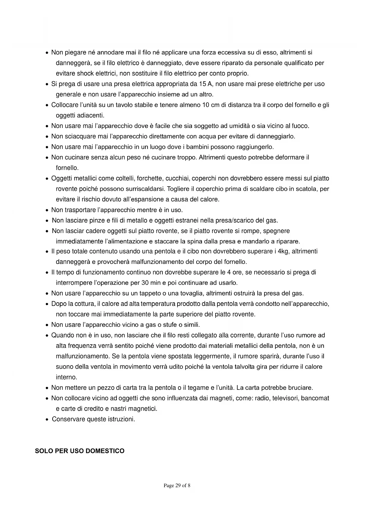 Leggere tutte le istruzioni prima dell’uso. Non smontare e reinserire le parti o riparare per conto proprio il fornello ad induzione. Non toccare la spina con le mani bagnate, quando il filo è danneggiato o la spina non è inserita al suo posto, non usare l’apparecchio. Controllare regolarmente il filo e la spina per eventuali danni.Page 29 of 8 Non piegare né annodare mai il filo né applicare una forza eccessiva su di esso, altrimenti si danneggerà, se il filo elettrico è danneggiato, deve essere riparato da personale qualificato per evitare shock elettrici, non sostituire il filo elettrico per conto proprio. Si prega di usare una presa elettrica appropriata da 15 A, non usare mai prese elettriche per uso generale e non usare l’apparecchio insieme ad un altro. Collocare l’unità su un tavolo stabile e tenere almeno 10 cm di distanza tra il corpo del fornello e gli oggetti adiacenti. Non usare mai l’apparecchio dove è facile che sia soggetto ad umidità o sia vicino al fuoco. Non sciacquare mai l’apparecchio direttamente con acqua per evitare di danneggiarlo. Non usare mai l’apparecchio in un luogo dove i bambini possono raggiungerlo. Non cucinare senza alcun peso né cucinare troppo. Altrimenti questo potrebbe deformare il fornello. Oggetti metallici come coltelli, forchette, cucchiai, coperchi non dovrebbero essere messi sul piatto rovente poiché possono surriscaldarsi. Togliere il coperchio prima di scaldare cibo in scatola, per evitare il rischio dovuto all’espansione a causa del calore. Non trasportare l’apparecchio mentre è in uso. Non lasciare pinze e fili di metallo e oggetti estranei nella presa/scarico del gas. Non lasciar cadere oggetti sul piatto rovente, se il piatto rovente si rompe, spegnere immediatamente l’alimentazione e staccare la spina dalla presa e mandarlo a riparare. Il peso totale contenuto usando una pentola e il cibo non dovrebbero superare i 4kg, altrimenti danneggerà e provocherà malfunzionamento del corpo del fornello. Il tempo di funzionamento continuo non dovrebbe superare le 4 ore, se necessario si prega di interrompere l’operazione per 30 min e poi continuare ad usarlo. Non usare l’apparecchio su un tappeto o una tovaglia, altrimenti ostruirà la presa del gas. Dopo la cottura, il calore ad alta temperatura prodotto dalla pentola verrà condotto nell’apparecchio, non toccare mai immediatamente la parte superiore del piatto rovente. Non usare l’apparecchio vicino a gas o stufe o simili. Quando non è in uso, non lasciare che il filo resti collegato alla corrente, durante l’uso rumore ad alta frequenza verrà sentito poiché viene prodotto dai materiali metallici della pentola, non è un malfunzionamento. Se la pentola viene spostata leggermente, il rumore sparirà, durante l’uso il suono della ventola in movimento verrà udito poiché la ventola talvolta gira per ridurre il calore interno. Non mettere un pezzo di carta tra la pentola o il tegame e l’unità. La carta potrebbe bruciare. Non collocare vicino ad oggetti che sono influenzata dai magneti, come: radio, televisori, bancomat e carte di credito e nastri magnetici. Conservare queste istruzioni.