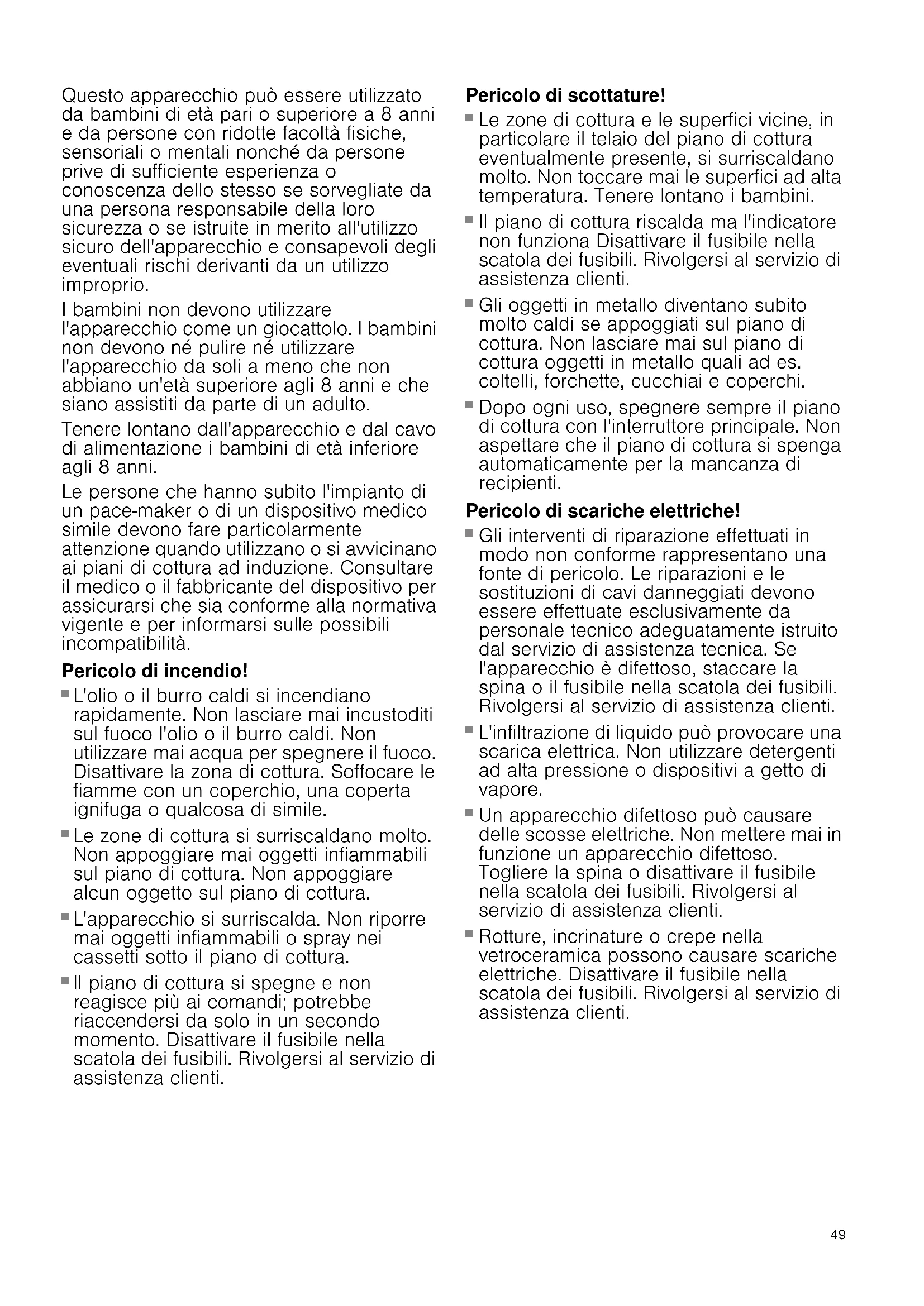 - Piatti testati Produktinfo Per ulteriori informazioni su prodotti, accessori, pezzi di ricambio e servizi è possibile consultare il sito Internet www.neff-international.com e l'eShop www.neff-eshop.com : Norme di sicurezza Leggere attentamente le presenti istruzioni per l'uso. Custodire con la massima cura le presenti istruzioni per l'uso e il montaggio e il certificato di identificazione dell'apparecchio in caso di un utilizzo futuro e cessione a terzi. Verificare le condizioni dell'apparecchio dopo averlo estratto dall'imballaggio. In caso di danni provocati dal trasporto, non collegare l'apparecchio, contattare il Servizio di Assistenza Tecnica e riportare per iscritto i danni riscontrati; in caso contrario, si perderà il diritto a qualunque tipo di indennizzo. Questo apparecchio deve essere installato secondo le istruzioni per il montaggio fornite. Questo apparecchio è pensato esclusivamente per l'utilizzo in abitazioni private e in ambito domestico. Utilizzare l'apparecchio per la preparazione di cibi e bevande. Prestare attenzione all'apparecchio durante il suo funzionamento. Utilizzare l'apparecchio esclusivamente in luoghi chiusi. Non utilizzare alcuna copertura del piano di cottura. Potrebbe causare incidenti, dovuti ad es. al surriscaldamento, alla formazione di fiamme o agli schizzi di materiale. Non utilizzare dispositivi di protezione o griglie di protezione per bambini non adatti. Potrebbero causare incidenti. Questo apparecchio non è da utilizzare con un timer esterno o un telecomando separato.49 Questo apparecchio può essere utilizzato da bambini di età pari o superiore a 8 anni e da persone con ridotte facoltà fisiche, sensoriali o mentali nonché da persone prive di sufficiente esperienza o conoscenza dello stesso se sorvegliate da una persona responsabile della loro sicurezza o se istruite in merito all'utilizzo sicuro dell'apparecchio e consapevoli degli eventuali rischi derivanti da un utilizzo improprio. I bambini non devono utilizzare l'apparecchio come un giocattolo. I bambini non devono né pulire né utilizzare l'apparecchio da soli a meno che non abbiano un'età superiore agli 8 anni e che siano assistiti da parte di un adulto. Tenere lontano dall'apparecchio e dal cavo di alimentazione i bambini di età inferiore agli 8 anni. Le persone che hanno subito l'impianto di un pace-maker o di un dispositivo medico simile devono fare particolarmente attenzione quando utilizzano o si avvicinano ai piani di cottura ad induzione. Consultare il medico o il fabbricante del dispositivo per assicurarsi che sia conforme alla normativa vigente e per informarsi sulle possibili incompatibilità. Pericolo di incendio! p. 61
