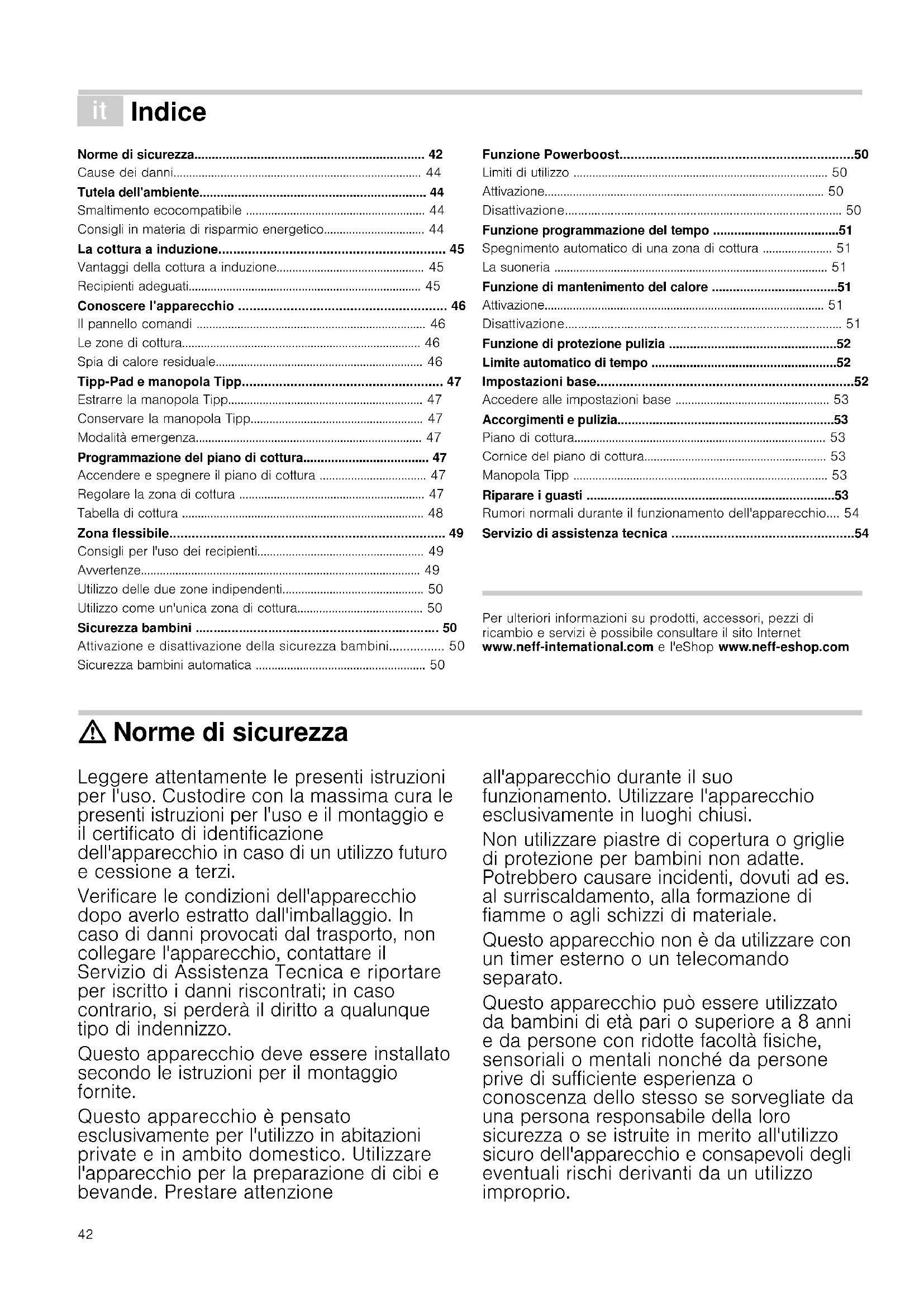 - Si l'indication persiste, prévenir le Service technique. Ne placer aucun récipient chaud sur le bandeau de commande. B 070 222 143 FR 01 40 10 42 10 CH 0848 840 04042 â Indice [it]Istruzioni per l’uso Norme di sicurezza.................................................................. 42 Cause dei danni............................................................................... 44 Tutela dell'ambiente................................................................. 44 Smaltimento ecocompatibile ......................................................... 44 Consigli in materia di risparmio energetico................................ 44 La cottura a induzione............................................................. 45 Vantaggi della cottura a induzione............................................... 45 Recipienti adeguati.......................................................................... 45 Conoscere l'apparecchio ........................................................ 46 Il pannello comandi ......................................................................... 46 Le zone di cottura............................................................................ 46 Spia di calore residuale.................................................................. 46 Tipp-Pad e manopola Tipp...................................................... 47 Estrarre la manopola Tipp.............................................................. 47 Conservare la manopola Tipp....................................................... 47 Modalità emergenza........................................................................ 47 Programmazione del piano di cottura.................................... 47 Accendere e spegnere il piano di cottura .................................. 47 Regolare la zona di cottura ........................................................... 47 Tabella di cottura ............................................................................. 48 Zona flessibile.......................................................................... 49 Consigli per l'uso dei recipienti..................................................... 49 Avvertenze......................................................................................... 49 Utilizzo delle due zone indipendenti............................................. 50 Utilizzo come un'unica zona di cottura........................................ 50 Sicurezza bambini ................................................................... 50 Attivazione e disattivazione della sicurezza bambini................ 50 Sicurezza bambini automatica ...................................................... 50 Funzione Powerboost...............................................................50 Limiti di utilizzo ................................................................................. 50 Attivazione......................................................................................... 50 Disattivazione.................................................................................... 50 Funzione programmazione del tempo ....................................51 Spegnimento automatico di una zona di cottura ...................... 51 La suoneria ....................................................................................... 51 Funzione di mantenimento del calore ....................................51 Attivazione......................................................................................... 51 Disattivazione.................................................................................... 51 Funzione di protezione pulizia ................................................52 Limite automatico di tempo .....................................................52 Impostazioni base.....................................................................52 Accedere alle impostazioni base ................................................. 53 Accorgimenti e pulizia..............................................................53 Piano di cottura................................................................................ 53 Cornice del piano di cottura.......................................................... 53 Manopola Tipp ................................................................................. 53 Riparare i guasti .......................................................................53 Rumori normali durante il funzionamento dell'apparecchio.... 54 Servizio di assistenza tecnica .................................................54 Produktinfo Per ulteriori informazioni su prodotti, accessori, pezzi di ricambio e servizi è possibile consultare il sito Internet www.neff-international.com e l'eShop www.neff-eshop.com : Norme di sicurezza Leggere attentamente le presenti istruzioni per l'uso. Custodire con la massima cura le presenti istruzioni per l'uso e il montaggio e il certificato di identificazione dell'apparecchio in caso di un utilizzo futuro e cessione a terzi. Verificare le condizioni dell'apparecchio dopo averlo estratto dall'imballaggio. In caso di danni provocati dal trasporto, non collegare l'apparecchio, contattare il Servizio di Assistenza Tecnica e riportare per iscritto i danni riscontrati; in caso contrario, si perderà il diritto a qualunque tipo di indennizzo. Questo apparecchio deve essere installato secondo le istruzioni per il montaggio fornite. Questo apparecchio è pensato esclusivamente per l'utilizzo in abitazioni private e in ambito domestico. Utilizzare l'apparecchio per la preparazione di cibi e bevande. Prestare attenzione all'apparecchio durante il suo funzionamento. Utilizzare l'apparecchio esclusivamente in luoghi chiusi. Non utilizzare piastre di copertura o griglie di protezione per bambini non adatte. Potrebbero causare incidenti, dovuti ad es. al surriscaldamento, alla formazione di fiamme o agli schizzi di materiale. Questo apparecchio non è da utilizzare con un timer esterno o un telecomando sep