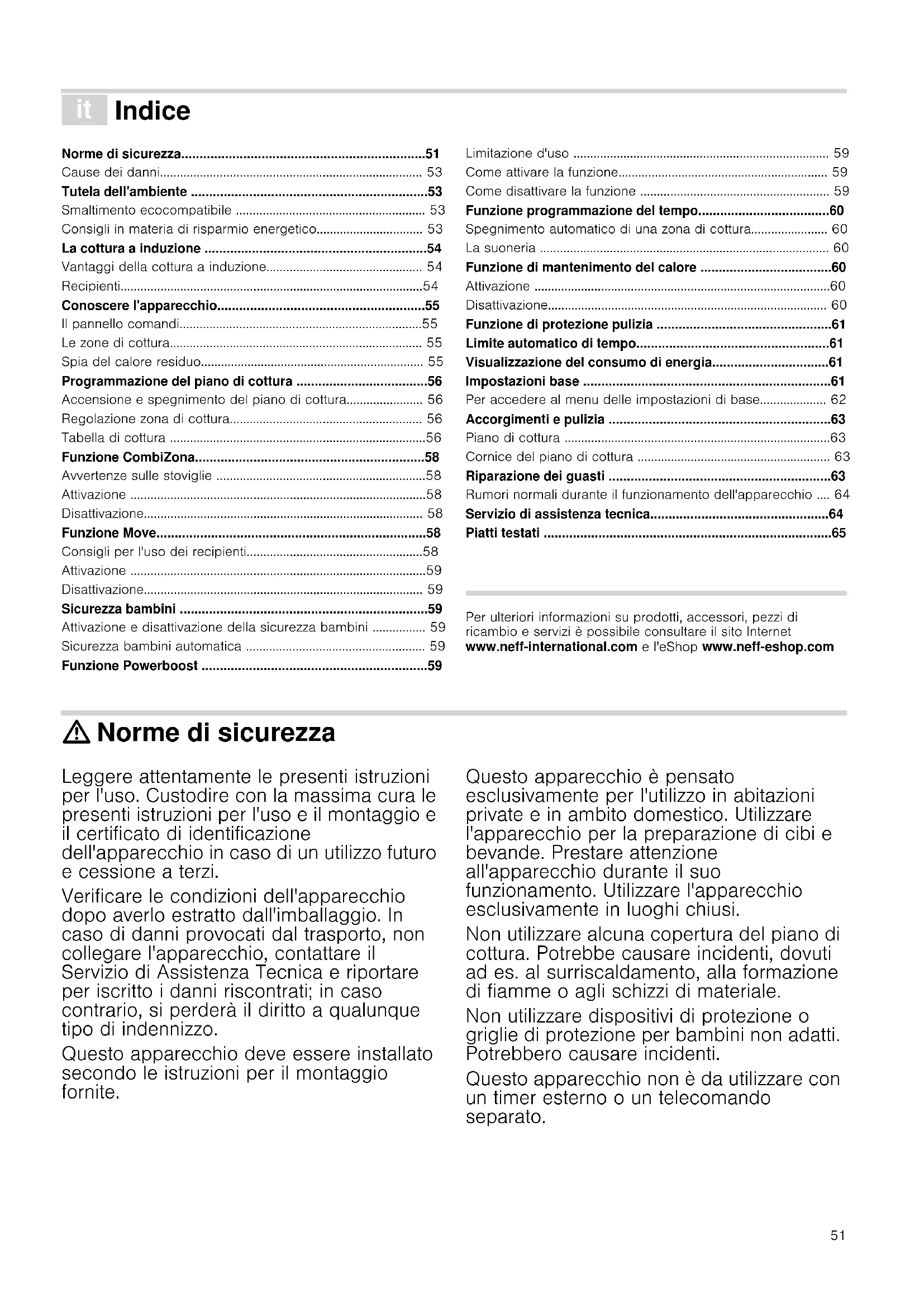 - Piatti testati Produktinfo Per ulteriori informazioni su prodotti, accessori, pezzi di ricambio e servizi è possibile consultare il sito Internet www.neff-international.com e l'eShop www.neff-eshop.com : Norme di sicurezza Leggere attentamente le presenti istruzioni per l'uso. Custodire con la massima cura le presenti istruzioni per l'uso e il montaggio e il certificato di identificazione dell'apparecchio in caso di un utilizzo futuro e cessione a terzi. Verificare le condizioni dell'apparecchio dopo averlo estratto dall'imballaggio. In caso di danni provocati dal trasporto, non collegare l'apparecchio, contattare il Servizio di Assistenza Tecnica e riportare per iscritto i danni riscontrati; in caso contrario, si perderà il diritto a qualunque tipo di indennizzo. Questo apparecchio deve essere installato secondo le istruzioni per il montaggio fornite. Questo apparecchio è pensato esclusivamente per l'utilizzo in abitazioni private e in ambito domestico. Utilizzare l'apparecchio per la preparazione di cibi e bevande. Prestare attenzione all'apparecchio durante il suo funzionamento. Utilizzare l'apparecchio esclusivamente in luoghi chiusi. Non utilizzare alcuna copertura del piano di cottura. Potrebbe causare incidenti, dovuti ad es. al surriscaldamento, alla formazione di fiamme o agli schizzi di materiale. Non utilizzare dispositivi di protezione o griglie di protezione per bambini non adatti. Potrebbero causare incidenti. Questo apparecchio non è da utilizzare con un timer esterno o un telecomando separato.52 Questo apparecchio può essere utilizzato da bambini di età pari o superiore a 8 anni e da persone con ridotte facoltà fisiche, sensoriali o mentali nonché da persone prive di sufficiente esperienza o conoscenza dello stesso se sorvegliate da una persona responsabile della loro sicurezza o se istruite in merito all'utilizzo sicuro dell'apparecchio e consapevoli degli eventuali rischi derivanti da un utilizzo improprio. I bambini non devono utilizzare l'apparecchio come un giocattolo. I bambini non devono né pulire né utilizzare l'apparecchio da soli a meno che non abbiano un'età superiore agli 8 anni e che siano assistiti da parte di un adulto. Tenere lontano dall'apparecchio e dal cavo di alimentazione i bambini di età inferiore agli 8 anni. Le persone che hanno subito l'impianto di un pace-maker o di un dispositivo medico simile devono fare particolarmente attenzione quando utilizzano o si avvicinano ai piani di cottura ad induzione. Consultare il medico o il fabbricante del dispositivo per assicurarsi che sia conforme alla normativa vigente e per informarsi sulle possibili incompatibilità. Pericolo di incendio! p. 65