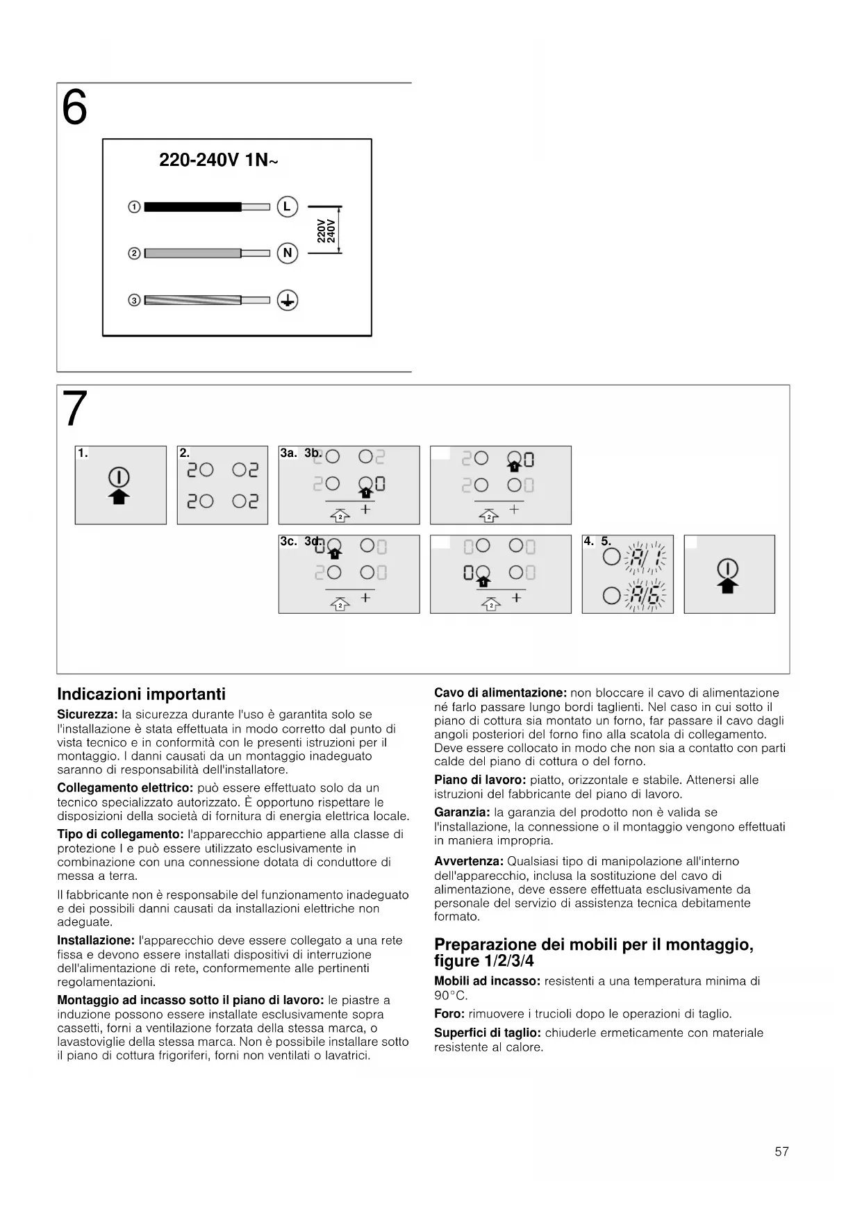 Indicazioni importanti Sicurezza: la sicurezza durante l'uso è garantita solo se l'installazione è stata effettuata in modo corretto dal punto di vista tecnico e in conformità con le presenti istruzioni per il montaggio. I danni causati da un montaggio inadeguato saranno di responsabilità dell'installatore. Collegamento elettrico: può essere effettuato solo da un tecnico specializzato autorizzato. È opportuno rispettare le disposizioni della società di fornitura di energia elettrica locale. Tipo di collegamento: l'apparecchio appartiene alla classe di protezione I e può essere utilizzato esclusivamente in combinazione con una connessione dotata di conduttore di messa a terra. Il fabbricante non è responsabile del funzionamento inadeguato e dei possibili danni causati da installazioni elettriche non adeguate. Installazione: l'apparecchio deve essere collegato a una rete fissa e devono essere installati dispositivi di interruzione dell'alimentazione di rete, conformemente alle pertinenti regolamentazioni. Montaggio ad incasso sotto il piano di lavoro: le piastre a induzione possono essere installate esclusivamente sopra cassetti, forni a ventilazione forzata della stessa marca, o lavastoviglie della stessa marca. Non è possibile installare sotto il piano di cottura frigoriferi, forni non ventilati o lavatrici. Cavo di alimentazione: non bloccare il cavo di alimentazione né farlo passare lungo bordi taglienti. Nel caso in cui sotto il piano di cottura sia montato un forno, far passare il cavo dagli angoli posteriori del forno fino alla scatola di collegamento. Deve essere collocato in modo che non sia a contatto con parti calde del piano di cottura o del forno. Piano di lavoro: piatto, orizzontale e stabile. Attenersi alle istruzioni del fabbricante del piano di lavoro. Garanzia: la garanzia del prodotto non è valida se l'installazione, la connessione o il montaggio vengono effettuati in maniera impropria. Avvertenza: Qualsiasi tipo di manipolazione all'interno dell'apparecchio, inclusa la sostituzione del cavo di alimentazione, deve essere effettuata esclusivamente da personale del servizio di assistenza tecnica debitamente formato. Preparazione dei mobili per il montaggio, figure 1/2/3/4 Mobili ad incasso: resistenti a una temperatura minima di 90°C. Foro: rimuovere i trucioli dopo le operazioni di taglio. Superfici di taglio: chiuderle ermeticamente con materiale resistente al calore.