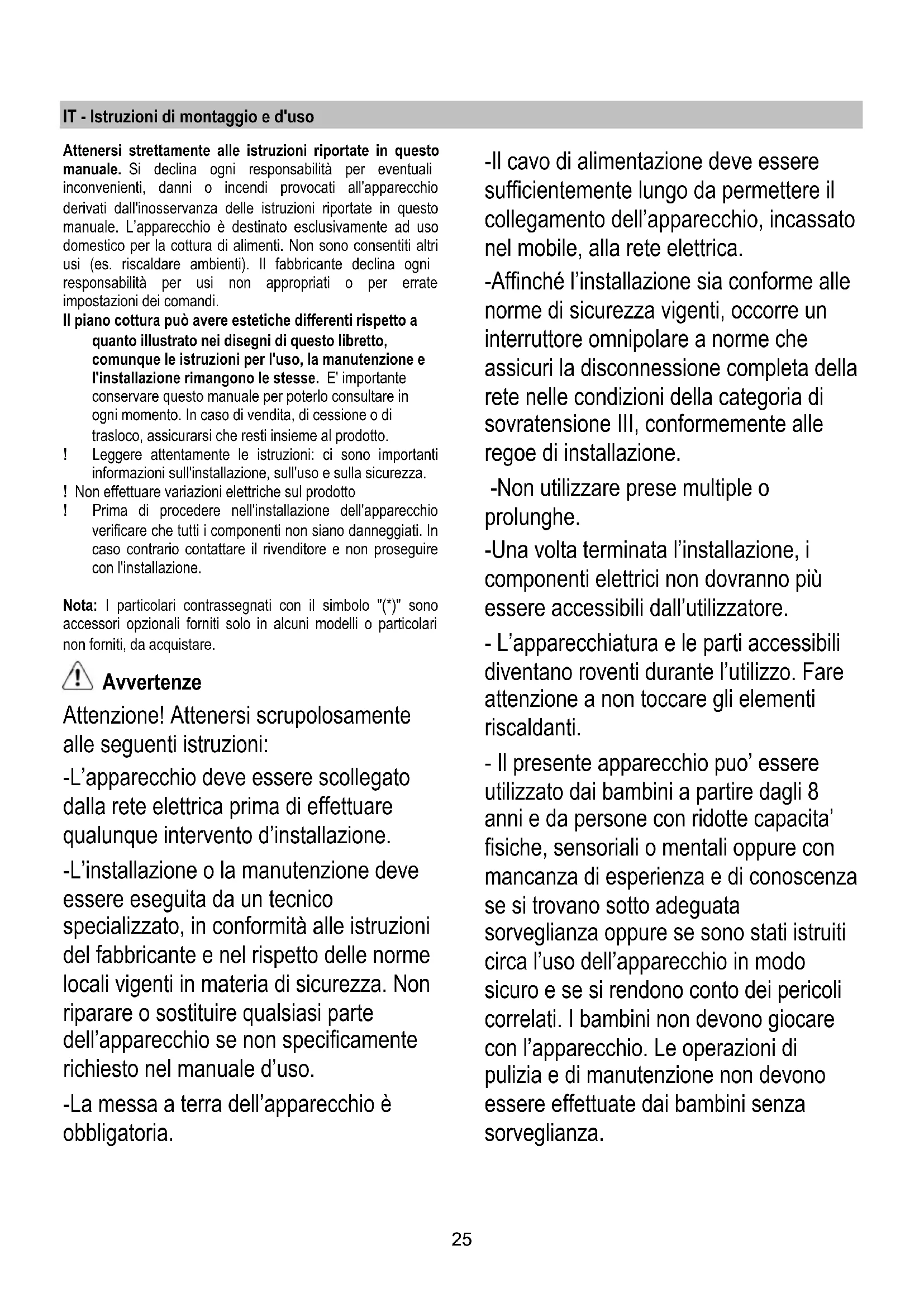 Customer service Before contacting Customer Service 1.Check that you cannot solve the problem yourself based on the points described in "Troubleshooting". 2.Switch the device off and on again to see if the problem resolves itself. If, after the above checks, the fault persists, contact the nearest Customer Service.25 IT - Istruzioni di montaggio e d'uso Attenersi strettamente alle istruzioni riportate in questo manuale. Si declina ogni responsabilità per eventuali inconvenienti, danni o incendi provocati all'apparecchio derivati dall'inosservanza delle istruzioni riportate in questo manuale. L’apparecchio è destinato esclusivamente ad uso domestico per la cottura di alimenti. Non sono consentiti altri usi (es. riscaldare ambienti). Il fabbricante declina ogni responsabilità per usi non appropriati o per errate impostazioni dei comandi. Il piano cottura può avere estetiche differenti rispetto a quanto illustrato nei disegni di questo libretto, comunque le istruzioni per l'uso, la manutenzione e l'installazione rimangono le stesse. E' importante conservare questo manuale per poterlo consultare in ogni momento. In caso di vendita, di cessione o di trasloco, assicurarsi che resti insieme al prodotto. ! Leggere attentamente le istruzioni: ci sono importanti informazioni sull'installazione, sull'uso e sulla sicurezza. ! Non effettuare variazioni elettriche sul prodotto ! Prima di procedere nell'installazione dell'apparecchio verificare che tutti i componenti non siano danneggiati. In caso contrario contattare il rivenditore e non proseguire con l'installazione. Nota: I particolari contrassegnati con il simbolo "(*)" sono accessori opzionali forniti solo in alcuni modelli o particolari non forniti, da acquistare. Avvertenze Attenzione! Attenersi scrupolosamente alle seguenti istruzioni: -L’apparecchio deve essere scollegato dalla rete elettrica prima di effettuare qualunque intervento d’installazione. -L’installazione o la manutenzione deve essere eseguita da un tecnico specializzato, in conformità alle istruzioni del fabbricante e nel rispetto delle norme locali vigenti in materia di sicurezza. Non riparare o sostituire qualsiasi parte dell’apparecchio se non specificamente richiesto nel manuale d’uso. -La messa a terra dell’apparecchio è obbligatoria. -Il cavo di alimentazione deve essere sufficientemente lungo da permettere il collegamento dell’apparecchio, incassato nel mobile, alla rete elettrica. -Affinché l’installazione sia conforme alle norme di sicurezza vigenti, occorre un interruttore omnipolare a norme che assicuri la disconnessione completa della rete nelle condizioni della categoria di sovratensione III, conformemente alle regoe di installazione. -Non utilizzare prese multiple o prolunghe. -Una volta terminata l’installazione, i componenti elettrici non dovranno più essere accessibili dall’utilizzatore. - L’apparecchiatura e le parti accessibili diventano roventi durante l’utilizzo. Fare attenzione a non toccare gli elementi riscaldanti. - Il presente apparecchio puo’ essere utilizzato dai bambini a partire dagli 8 anni e da persone con ridotte capacita’ fisiche, sensoriali o mentali oppure con mancanza di esperienza e di conoscenza se si trovano sotto adeguata sorveglianza oppure se sono stati istruiti circa l’uso dell’apparecchio in modo sicuro e se si rendono conto dei pericoli correlati. I bambini non devono giocare con l’apparecchio. Le operazioni di pulizia e di manutenzione non devono essere effettuate dai bambini senza sorveglianza.26 - Fare attenzione che i bambini non giochino con l'apparecchio; mantenre i bambini a distanza e sorvegliarli, in quanto le parti accessibili possono diventare molto calde durante l’uso. - Per i portatori di stimolatori cardiaci ed impianti attivi è importante verificare, prima dell'uso del piano ad induzione, che il proprio stimolatore sia compatibile con l'apparecchio. .-Durante e dopo l’uso non toccare gli elementi riscaldanti dell’apparecchio. -Evitare il contatto con panni o altro materiale infiammabile fino a che tutti i componenti dell’apparecchio non si siano sufficientemente raffreddati. -Non riporre materiale infiammabile sull’apparecchio o nelle sue vicinanze. -I grassi e gli oli surriscaldati prendono facilmente fuoco. Sorvegliare la cottura di alimenti ricchi di grasso e di olio. - La pulizia e le operazioni di manutenzione eseguibili dall’utente non devono essere svolte da bambini senza la supervisione di una persona responsabile. -È obbligatoria l’installazione di un pannello separatore, non fornito a corredo, nel vano sotto l’apparecchio. -Se la superficie è incrinata, spegnere l’apparecchio per evitare la possibilità di scossa elettrica. -L’apparecchio non è destinato ad essere messo in funzione per mezzo di un temporizzatore esterno oppure di un sistema di comando a distanza separato. -La cottura non sorvegliata su un piano cottura con olio o grasso può essere pericolosa e generare incendi. - Il processo di cottura deve essere sorvegliato. Un processo di cottura a breve termine deve essere sorvegliato continuamente. - Non tentare MAI di spegnere le fiamme con acqua. Al contrario, spegnere l’apparecchio e soffocare le fiamme, ad esempio con un coperchio o una coperta antincendio. Pericolo di incendio: non poggiare oggetti sulle superfici di cottura. -Non usare pulitrici a vapore. -Non appoggiare oggetti metallici come coltelli, forchette, cucchiai e coperchi sulla superficie del piano di cottura perché potrebbero surriscaldarsi. - Prima di allacciare il modello alla rete elettrica: controllare la targa dati (posta nella parte inferiore dell'apparecchio) per accertarsi che la tensione e la potenza siano corrispondenti a quella della rete e la presa di collegamento sia idonea. In caso di dubbio interpellare un elettricista qualificato. Importante: - Dopo l'uso, spegnere il piano di cottura tramite il suo dispositivo di comando e non fare affidamento sul ri