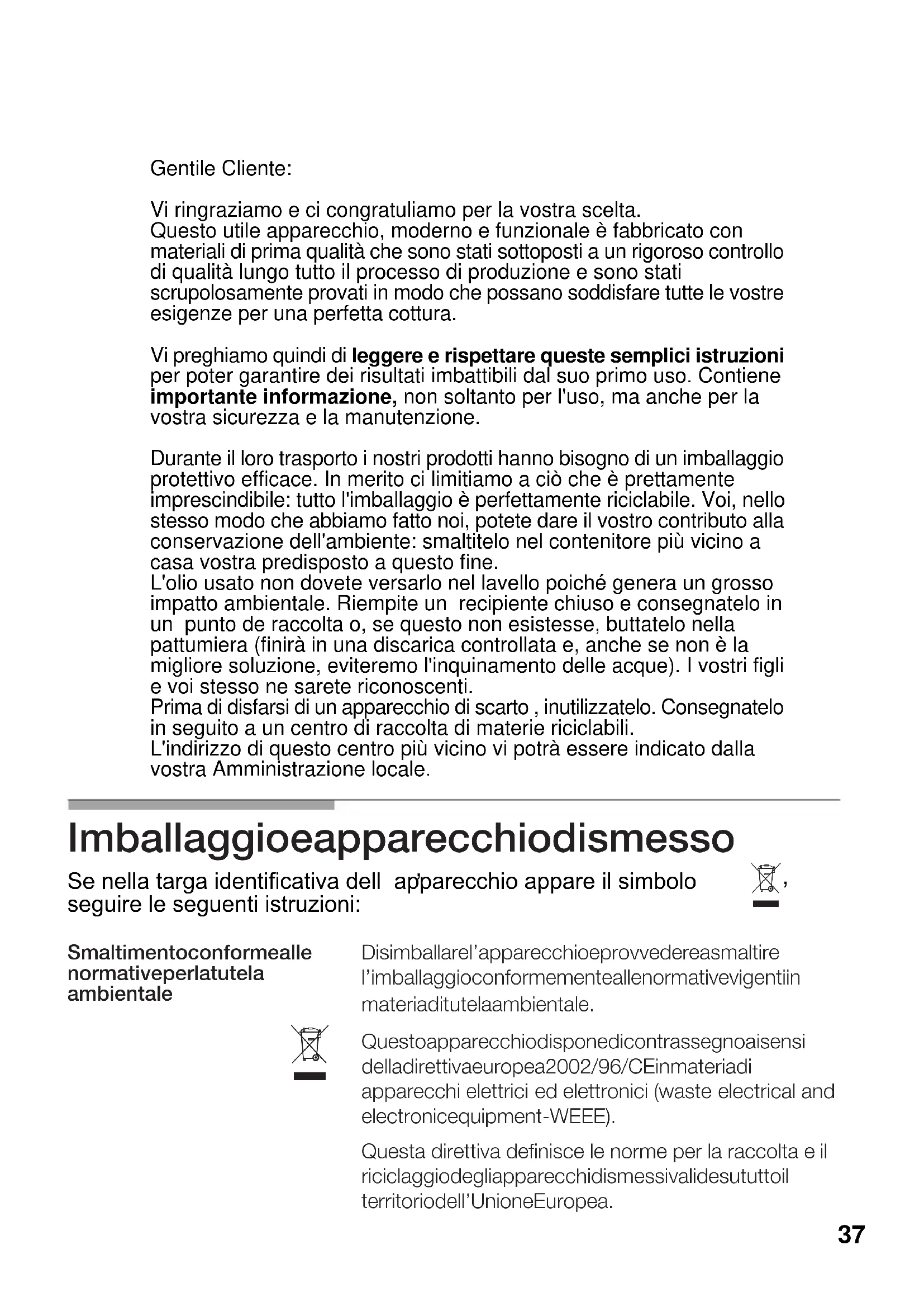 appuyer sur la commande pendant quelques secondes supplémentaires. - Nettoyer les rainures de sortie de gaz des brûleurs. Situations anomalesSi vous appelez notre Service Technique, indiquez s'il vous plaît : E - NR FD Ces indications figurent sur la plaque de caractéristiques de votre appareil. Elle est située sur la partie inférieure de la plaque de cuisson. Conditions de garantie Les conditions de garantie s'appliquant à cet appareil sont celles qui ont été établies par la représentation de notre entreprise dans le pays où a été effectué l'achat. Si vous le désirez, le vendeur auquel vous avez acheté l'appareil est à tout moment prêt à vous faciliter l'information détaillée à cet effet. Dans tous les cas, pour faire usage de la garantie, vous devrez présenter la justification d'achat. Nous nous réservons le droit de faire des modifications. 36Gentile Cliente:Vi ringraziamo e ci congratuliamo per la vostra scelta.Questo utile apparecchio, moderno e funzionale è fabbricato con materiali di prima qualità che sono stati sottoposti a un rigoroso controllo di qualità lungo tutto il processo di produzione e sono stati scrupolosamente provati in modo che possano soddisfare tutte le vostre Vi preghiamo quindi di leggere e rispettare queste semplici istruzioni per poter garantire dei risultati imbattibili dal suo primo uso. Contiene importante informazione, non soltanto per l'uso, ma anche per la vostra sicurezza e la manutenzione.Durante il loro trasporto i nostri prodotti hanno bisogno di un imballaggio protettivo efficace. In merito ci limitiamo a ciò che è prettamente imprescindibile: tutto l'imballaggio è perfettamente riciclabile. Voi, nello stesso modo che abbiamo fatto noi, potete dare il vostro contributo alla conservazione dell'ambiente: smaltitelo nel contenitore più vicino a casa vostra predisposto a questo fine. L'olio usato non dovete versarlo nel lavello poiché genera un grosso impatto ambientale. Riempite un recipiente chiuso e consegnatelo in un punto de raccolta o, se questo non esistesse, buttatelo nella pattumiera (finirà in una discarica controllata e, anche se non è la migliore soluzione, eviteremo l'inquinamento delle acque). I vostri figli e voi stesso ne sarete riconoscenti.Prima di disfarsi di un apparecchio di scarto , inutilizzatelo. Consegnatelo in seguito a un centro di raccolta di materie riciclabili.L'indirizzo di questo centro più vicino vi potrà essere indicato dalla vostra Amministrazione locale.