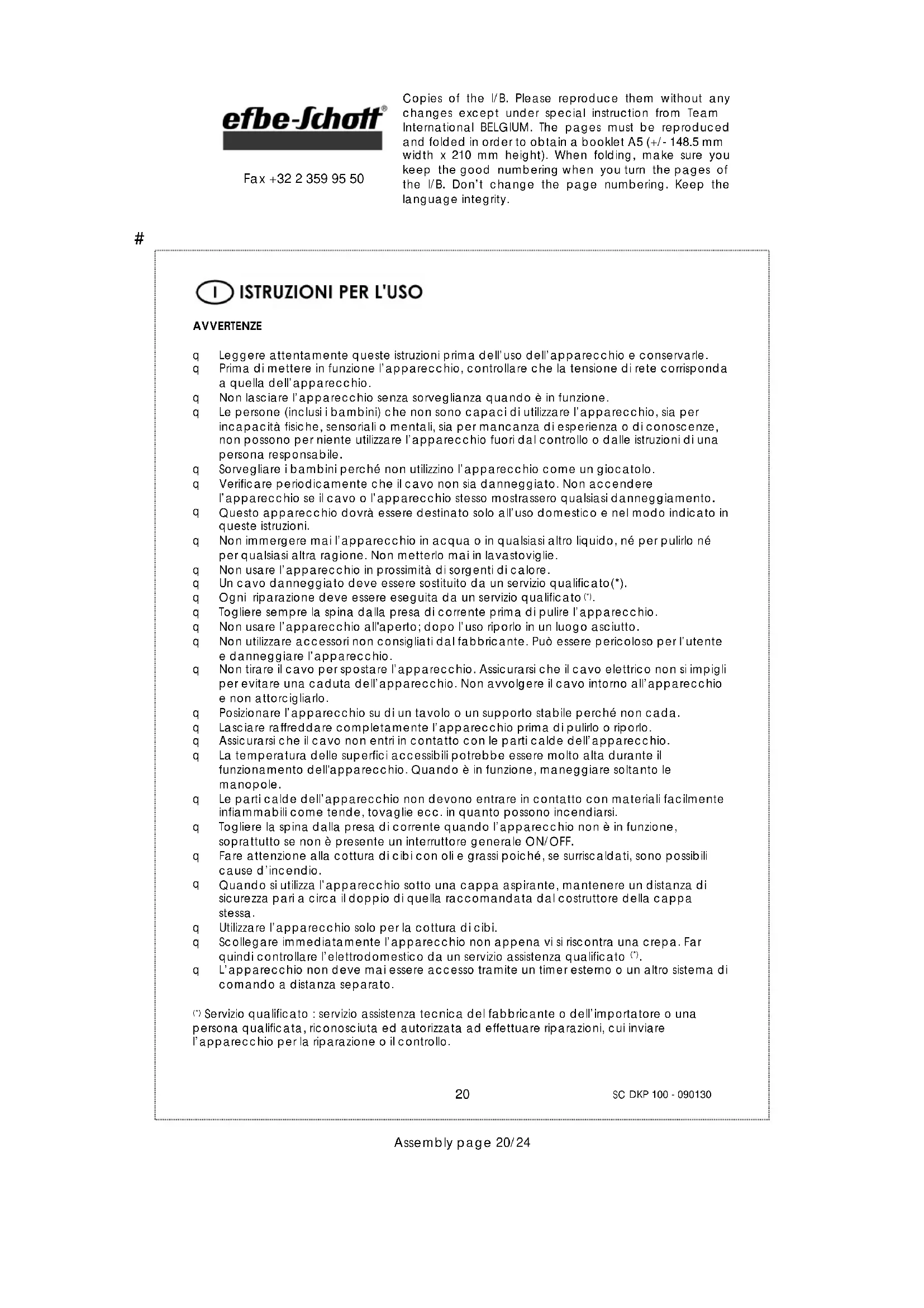 - Non immergere l'apparecchio in acqua o in altri liquidi. DIRETTIVA 2002/96/CE PER LO SMALTIMENTO DELLE APPARECCHIATURE ELETTRICHE ED ELETTRONICHE Per preservare l'ambiente e la nostra salute, l'eliminazione dei vecchi apparecchi elettrici e elettronici non più utilizzati, va fatta secondo la direttiva sopra citata che impone l'obbligo al costruttore, al commerciante e a l'utilizzatore di consegnare gli apparecchi ai centri di raccolta specializzati, i quali saranno in grado di smaltire e riciclare i vecchi prodotti come la legge prescrive. Per questa ragione troverete apposto sulla etichetta segnaletica il simbolo che indica di non gettare il vecchio apparecchio non più utilizzato, in pattumiera o nel cassonetto delle immondizie. Per eliminare il vecchio apparecchio non più utilizzato, potete consegnarlo al rivenditore il cambio di quello nuovo acquistato, o direttamente nei centri di raccolta specializzati messi a disposizione dal vostro comune di residenza.# Copies of the I/B. Please reproduce them without any changes except under special instruction from Team International BELGIUM. The pages must be reproduced and folded in order to obtain a booklet A5 (+/- 148.5 mm width x 210 mm height). When folding, make sure you keep the good numbering when you turn the pages of the I/B. Don’t change the page numbering. Keep the language integrity.