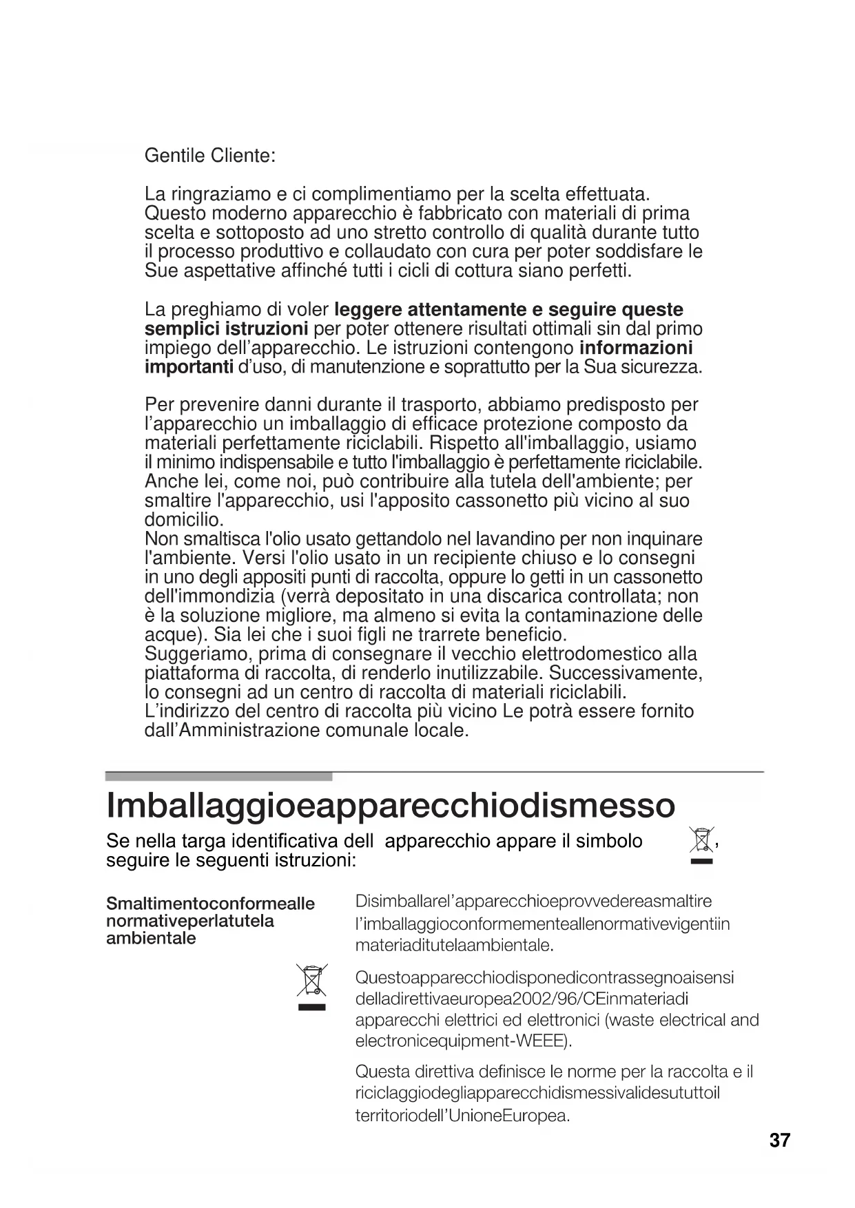 Se nella targa identificativa dell apparecchio appare il simbolo Sue aspettative affinché tutti i cicli di cottura siano perfetti. 37INDICE Avvertenze sulla sicurezza Ecco com'è il suo nuovo piano cottura Bruciatori a gas Diametri consigliati delle stoviglie Consigli per la cottura Avvertenze d'uso Suggerimenti per un corretto impiego del piano durante la cottura Riguardo la pulizia e la conservazione Situazioni anomale: Problemi e soluzioni Condizioni di garanzia