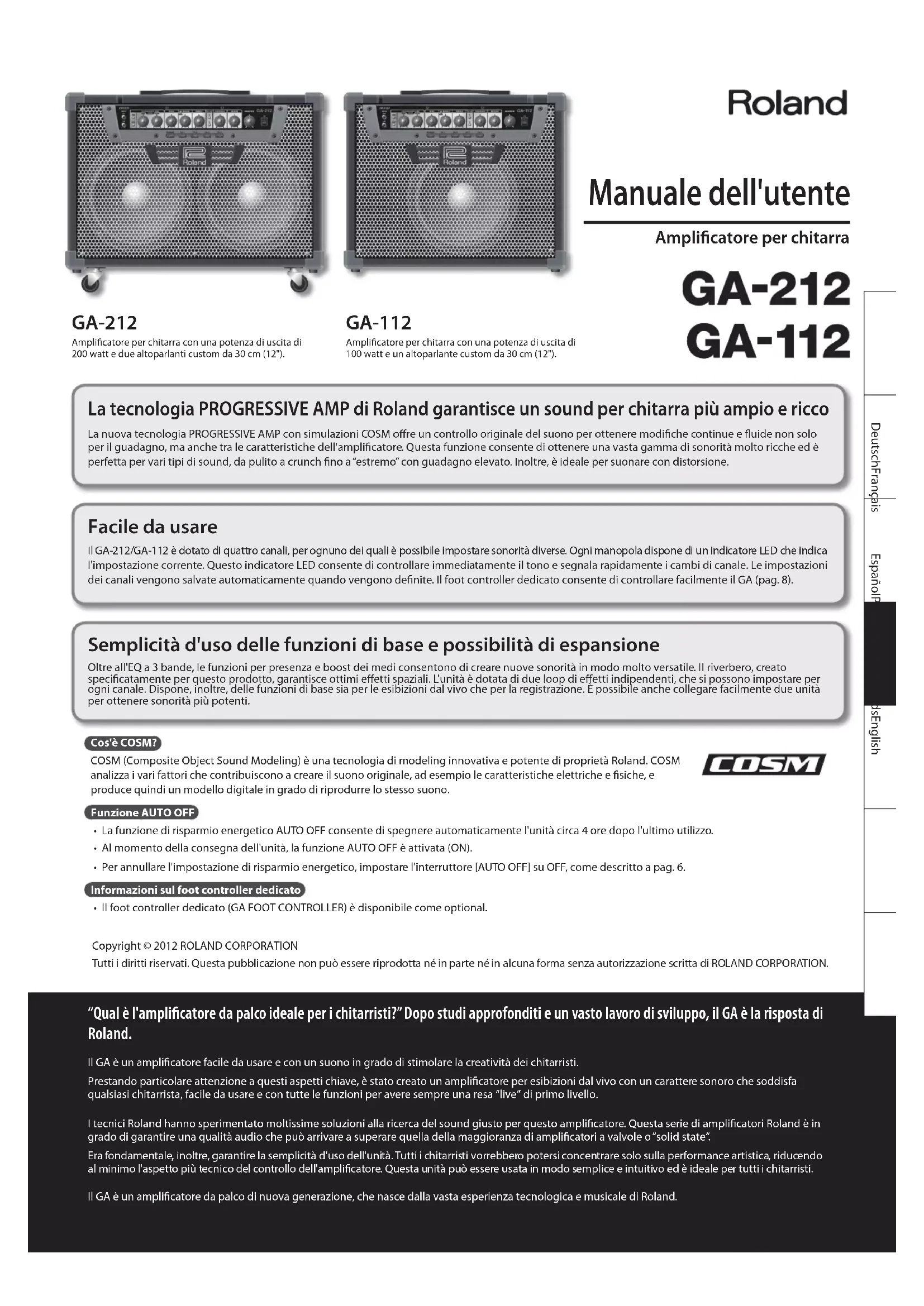 - En vue d’améliorer le produit, ses caractéristiques techniques et/ou son aspect peuvent être modiés sans avis préalable.Copyright © 2012 ROLAND CORPORATION Tutti i diritti riservati. Questa pubblicazione non può essere riprodotta né in parte né in alcuna forma senza autorizzazione scritta di ROLAND CORPORATION. Manuale dell'utente Amplicatore per chitarra GA-212 Amplicatore per chitarra con una potenza di uscita di 200 watt e due altoparlanti custom da 30 cm (12"). GA-112 Amplicatore per chitarra con una potenza di uscita di 100 watt e un altoparlante custom da 30 cm (12"). La tecnologia PROGRESSIVE AMP di Roland garantisce un sound per chitarra più ampio e ricco La nuova tecnologia PROGRESSIVE AMP con simulazioni COSM ore un controllo originale del suono per ottenere modiche continue e uide non solo per il guadagno, ma anche tra le caratteristiche dell'amplicatore. Questa funzione consente di ottenere una vasta gamma di sonorità molto ricche ed è perfetta per vari tipi di sound, da pulito a crunch no a “estremo” con guadagno elevato. Inoltre, è ideale per suonare con distorsione. Facile da usare Il GA-212/GA-112 è dotato di quattro canali, per ognuno dei quali è possibile impostare sonorità diverse. Ogni manopola dispone di un indicatore LED che indica l'impostazione corrente. Questo indicatore LED consente di controllare immediatamente il tono e segnala rapidamente i cambi di canale. Le impostazioni dei canali vengono salvate automaticamente quando vengono denite. Il foot controller dedicato consente di controllare facilmente il GA (pag. 8). Semplicità d'uso delle funzioni di base e possibilità di espansione Oltre all'EQ a 3 bande, le funzioni per presenza e boost dei medi consentono di creare nuove sonorità in modo molto versatile. Il riverbero, creato specicatamente per questo prodotto, garantisce ottimi eetti spaziali. L'unità è dotata di due loop di eetti indipendenti, che si possono impostare per ogni canale. Dispone, inoltre, delle funzioni di base sia per le esibizioni dal vivo che per la registrazione. È possibile anche collegare facilmente due unità per ottenere sonorità più potenti. Cos'è COSM? COSM (Composite Object Sound Modeling) è una tecnologia di modeling innovativa e potente di proprietà Roland. COSM analizza i vari fattori che contribuiscono a creare il suono originale, ad esempio le caratteristiche elettriche e siche, e produce quindi un modello digitale in grado di riprodurre lo stesso suono. Funzione AUTO OFF