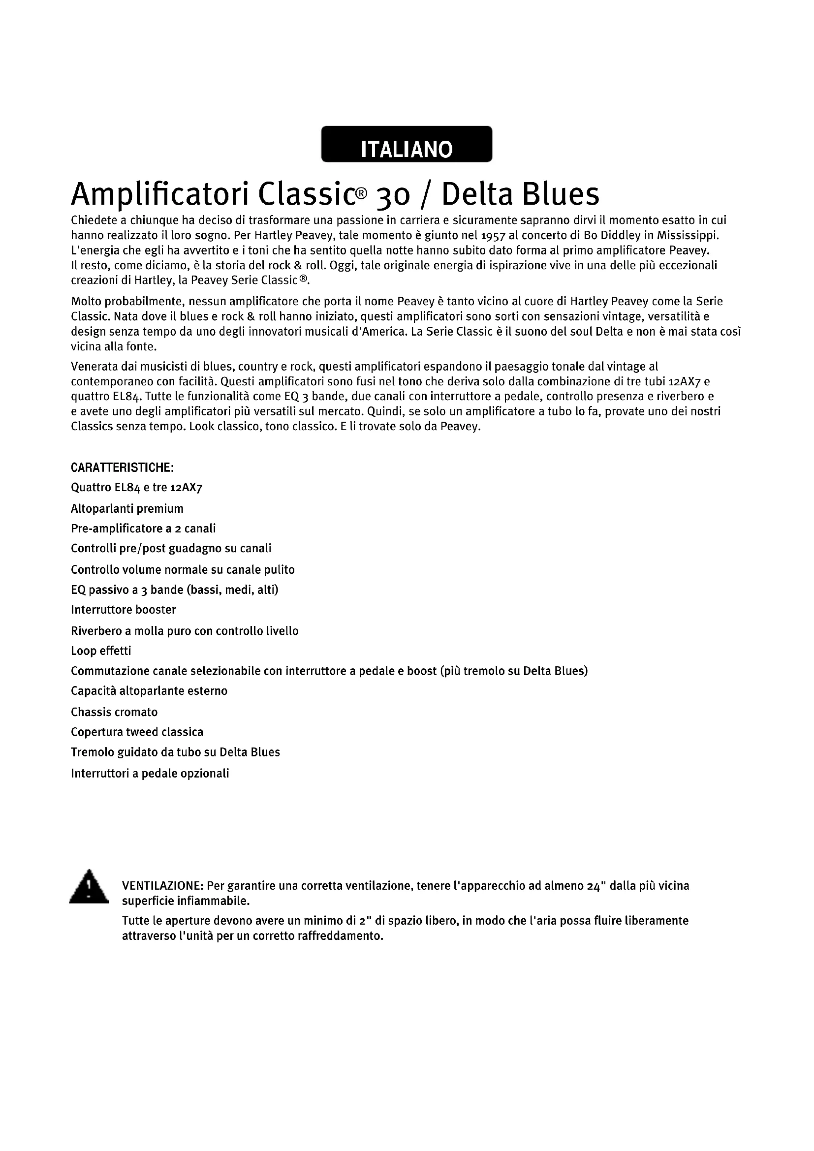 Molto probabilmente, nessun amplificatore che porta il nome Peavey è tanto vicino al cuore di Hartley Peavey come la Serie Classic. Nata dove il blues e rock & roll hanno iniziato, questi amplificatori sono sorti con sensazioni vintage, versatilità e design senza tempo da uno degli innovatori musicali d'America. La Serie Classic è il suono del soul Delta e non è mai stata così vicina alla fonte. Venerata dai musicisti di blues, country e rock, questi amplificatori espandono il paesaggio tonale dal vintage al contemporaneo con facilità. Questi amplificatori sono fusi nel tono che deriva solo dalla combinazione di tre tubi 12AX7 e quattro EL84. Tutte le funzionalità come EQ 3 bande, due canali con interruttore a pedale, controllo presenza e riverbero e e avete uno degli amplificatori più versatili sul mercato. Quindi, se solo un amplificatore a tubo lo fa, provate uno dei nostri Classics senza tempo. Look classico, tono classico. E li trovate solo da Peavey. CARATTERISTICHE: Quattro EL84 e tre 12AX7 Altoparlanti premium Pre-amplificatore a 2 canali Controlli pre/post guadagno su canali Controllo volume normale su canale pulito EQ passivo a 3 bande (bassi, medi, alti) Interruttore booster Riverbero a molla puro con controllo livello Loop effetti Commutazione canale selezionabile con interruttore a pedale e boost (più tremolo su Delta Blues) Capacità altoparlante esterno Chassis cromato Copertura tweed classica Tremolo guidato da tubo su Delta Blues Interruttori a pedale opzionali ITALIANO VENTILAZIONE: Per garantire una corretta ventilazione, tenere l'apparecchio ad almeno 24" dalla più vicina superficie infiammabile. Tutte le aperture devono avere un minimo di 2" di spazio libero, in modo che l'aria possa fluire liberamente attraverso l'unità per un corretto raffreddamento.Pannello di controllo Classic