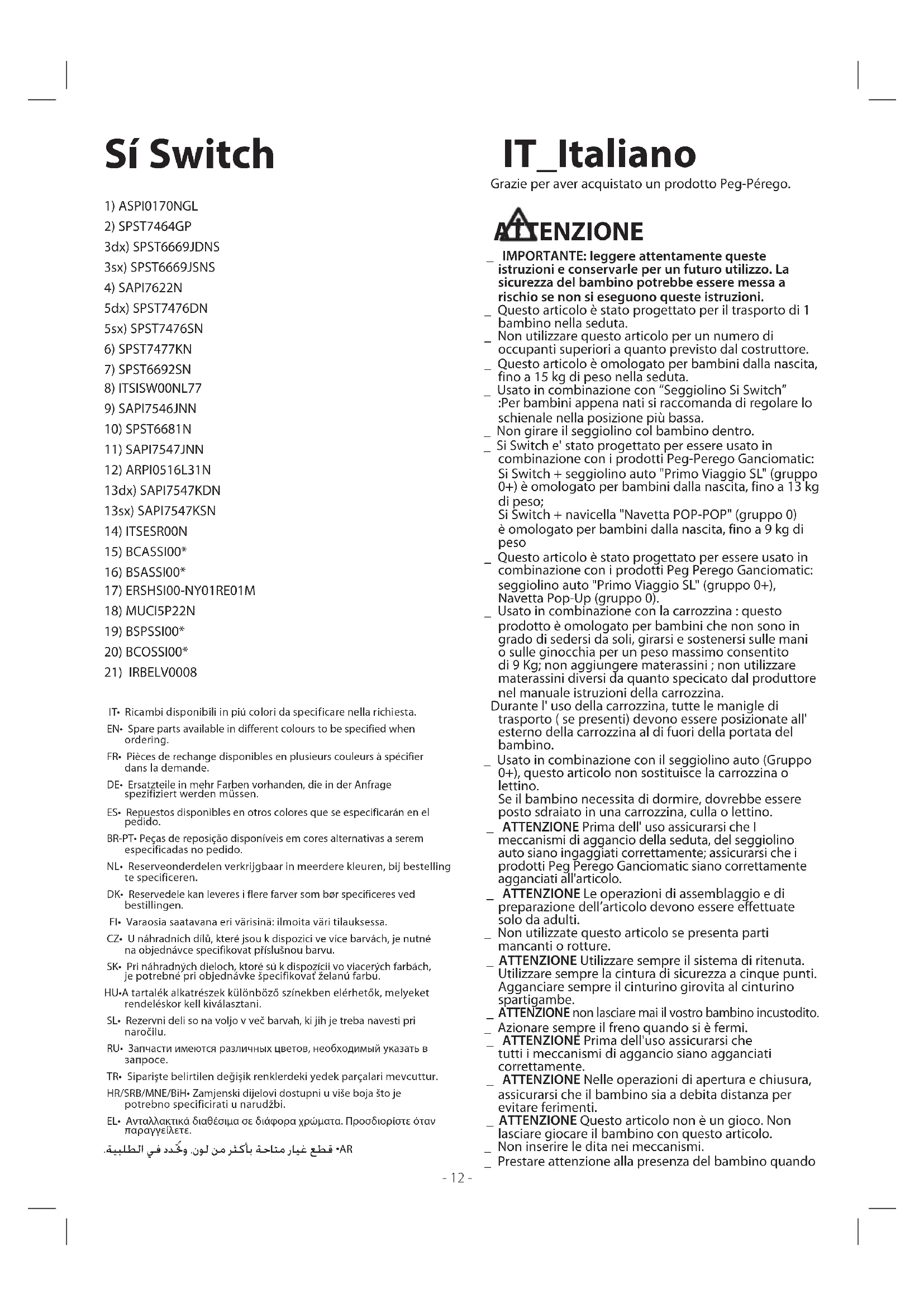IT_Italiano Grazie per aver acquistato un prodotto Peg-Pérego. ATTENZIONE _ IMPORTANTE: leggere attentamente queste istruzioni e conservarle per un futuro utilizzo. La sicurezza del bambino potrebbe essere messa a rischio se non si eseguono queste istruzioni. _ Questo articolo è stato progettato per il trasporto di 1 bambino nella seduta. _ Non utilizzare questo articolo per un numero di occupanti superiori a quanto previsto dal costruttore. _ Questo articolo è omologato per bambini dalla nascita, fino a 15 kg di peso nella seduta. _ Usato in combinazione con “Seggiolino Si Switch” :Per bambini appena nati si raccomanda di regolare lo schienale nella posizione più bassa. _ Non girare il seggiolino col bambino dentro. _ Si Switch e' stato progettato per essere usato in combinazione con i prodotti Peg-Perego Ganciomatic: Si Switch + seggiolino auto "Primo Viaggio SL" (gruppo 0+) è omologato per bambini dalla nascita, fino a 13 kg di peso; Si Switch + navicella "Navetta POP-POP" (gruppo 0) è omologato per bambini dalla nascita, fino a 9 kg di peso _ Questo articolo è stato progettato per essere usato in combinazione con i prodotti Peg Perego Ganciomatic: seggiolino auto "Primo Viaggio SL" (gruppo 0+), Navetta Pop-Up (gruppo 0). _ Usato in combinazione con la carrozzina : questo prodotto è omologato per bambini che non sono in grado di sedersi da soli, girarsi e sostenersi sulle mani o sulle ginocchia per un peso massimo consentito di 9 Kg; non aggiungere materassini ; non utilizzare materassini diversi da quanto specicato dal produttore nel manuale istruzioni della carrozzina. Durante l' uso della carrozzina, tutte le manigle di trasporto ( se presenti) devono essere posizionate all' esterno della carrozzina al di fuori della portata del bambino. _ Usato in combinazione con il seggiolino auto (Gruppo 0+), questo articolo non sostituisce la carrozzina o lettino. Se il bambino necessita di dormire, dovrebbe essere posto sdraiato in una carrozzina, culla o lettino. _ ATTENZIONE Prima dell' uso assicurarsi che I meccanismi di aggancio della seduta, del seggiolino auto siano ingaggiati correttamente; assicurarsi che i prodotti Peg Perego Ganciomatic siano correttamente agganciati all'articolo. _ ATTENZIONE Le operazioni di assemblaggio e di preparazione dell’articolo devono essere effettuate solo da adulti. _ Non utilizzate questo articolo se presenta parti mancanti o rotture. _ ATTENZIONE Utilizzare sempre il sistema di ritenuta. Utilizzare sempre la cintura di sicurezza a cinque punti. Agganciare sempre il cinturino girovita al cinturino spartigambe.