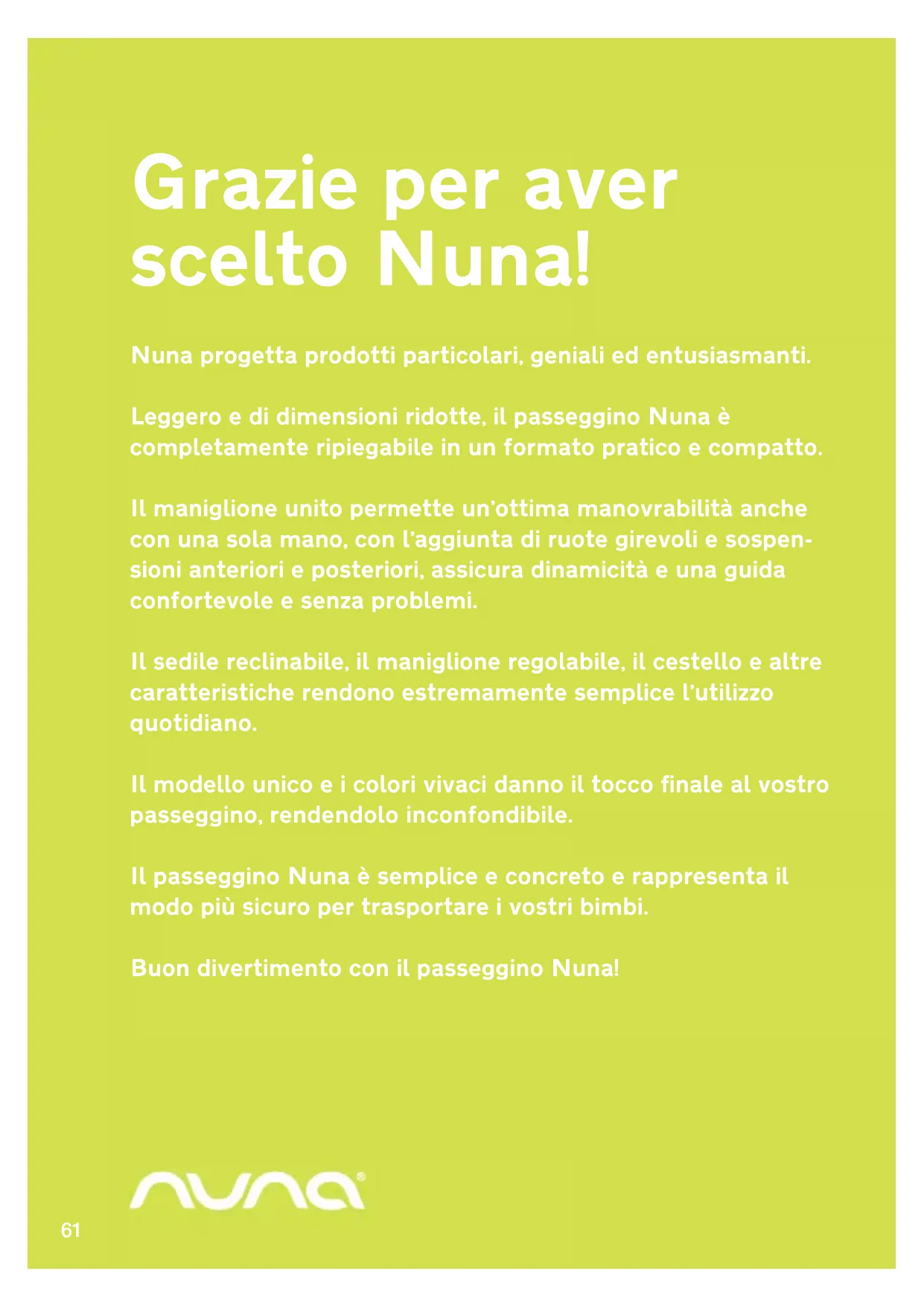 Indice Illustrazioni 1-4 Italiano (IT) 61 Sicurezza e avvertenze 63-66 Contenuti della confezione 67 Come montare il passeggino Nuna 67 Come utilizzare il passeggino Nuna 68-71 Pulizia e manutenzione 71 Garanzia e assistenza 72 Dove trovare i prodotti Nuna 7363
