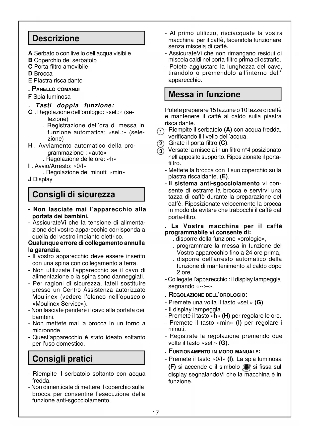 ◆17 Descrizione A Serbatoio con livello dell’acqua visibile B Coperchio del serbatoio C Porta-filtro amovibile D Brocca E Piastra riscaldante . PANELLO COMANDI F Spia luminosa . Tasti doppia funzione: G . Regolazione dell’orologio: «sel.:» (se- lezione) . Registrazione dell’ora di messa in funzione automatica: «sel.:» (sele- zione) H . Avviamento automatico della pro- grammazione : «auto» . Regolazione delle ore: «h» I . Avvio/Arresto: «0/I» . Regolazione dei minuti: «min» J Display Consigli di sicurezza - Non lasciate mai l’apparecchio alla portata dei bambini. - AssicurateVi che la tensione di alimenta- zione del vostro apparecchio corrisponda a quella del vostro impianto elettrico. Qualunque errore di collegamento annulla la garanzia. - Il vostro apparecchio deve essere inserito con una spina con collegamento a terra. - Non utilizzate l’apparecchio se il cavo di alimentazione o la spina sono danneggiati. - Per ragioni di sicurezza, fateli sostituire presso un Centro Assistenza autorizzato Moulinex (vedere l’elenco nell’opuscolo «Moulinex Service»). - Non lasciate pendere il cavo alla portata dei bambini. - Non mettete mai la brocca in un forno a microonde. - Quest’apparecchio è stato ideato soltanto per l’uso domestico. Consigli pratici - Riempite il serbatoio soltanto con acqua fredda. - Non dimenticate di mettere il coperchio sulla brocca per consentire l’esecuzione della funzione anti-sgocciolamento. - Al primo utilizzo, risciacquate la vostra macchina per il caffè, facendola funzionare senza miscela di caffè. - AssicurateVi che non rimangano residui di miscela caldi nel porta-filtro prima di estrarlo. - Potete aggiustare la lunghezza del cavo, tirandolo o premendolo all’interno dell’ apparecchio. Messa in funzione Potete preparare 15 tazzine o 10 tazze di caffè e mantenere il caffè al caldo sulla piastra riscaldante. - Riempite il serbatoio (A) con acqua fredda, verificando il livello dell’acqua. - Girate il porta-filtro (C). - Versate la miscela in un filtro n°4 posizionato nell’apposito supporto. Riposizionate il porta- filtro. - Mettete la brocca con il suo coperchio sulla piastra riscaldante. (E). - Il sistema anti-sgocciolamento vi con- sente di estrarre la brocca e servirvi una tazza di caffè durante la preparazione del caffè. Riposizionate velocemente la brocca in modo da evitare che trabocchi il caffè dal porta-filtro. . La Vostra macchina per il caffè programmabile vi consente di: . disporre della funzione «orologio», . programmare la messa in funzione del Vostro apparecchio fino a 24 ore prima, . disporre dell’arresto automatico della funzione di mantenimento al caldo dopo 2 ore. - Collegate l’apparecchio : il display lampeggia segnando «--:--». . REGOLAZIONE DELL’OROLOGIO: - Premete una volta il tasto «sel.» (G). - Il display lampeggia. - Premete il tasto «h» (H) per regolare le ore. - Premete il tasto «min» (I) per regolare i minuti. - Registrate la regolazione premendo due volte il tasto «sel.» (G). . FUNZIONAMENTO IN MODO MANUALE: - Premete il tasto «0/I» (I). La spia luminosa (F) si accende e il simbolo si fissa sul display segnalandoVi che la macchina è in funzione.
