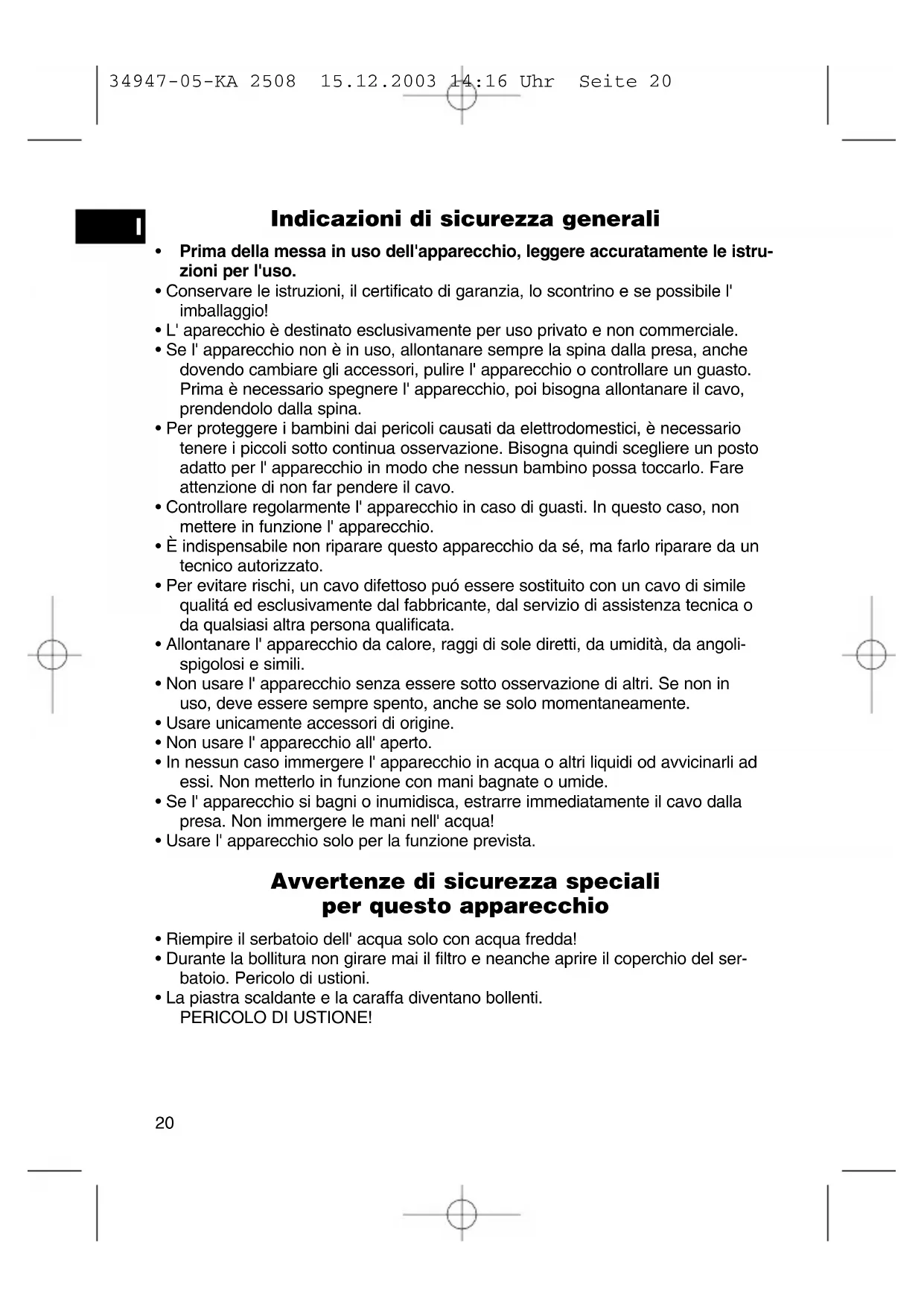 34947-05-KA 2508 15.12.2003 14:16 Uhr Seite 21Garanzia A partire dalla data di acquisto, questo prodotto è garantito dal produttore per un periodo di 12 mesi (scontrino). Durante la durata della garanzia, il produttore eliminerà gratuitamente difetti dell'- apparecchio dovuti a imperfezioni di produzione o di materiale, eventualmente cam- biando l' unità oppure procedendo con le dovute riparazioni. La garanzia è valida solo con lo scontrino. Senza l' esibizione dello scontrino non è possibile fare svolgere le riparazioni gratuitamente. In caso di riparazioni con garanzia, è necessario ritornare al produttore l' appa- recchio intero, nell'imballaggio originale, accompagnato dallo scontrino. In caso di rottura di vetro e difetti agli accessori, i pezzi necessari verranno spediti in cambio gratuitamente. In questo caso è necessario di non spedire l' intero appa- recchio, ma ordinare solo l' accessorio difettoso! Pulizia, manutenzione e scambio non fanno parte della garanzia e sono perciò sono soggetti a spese. La garanzia perde la sua validità se l'apparecchio è sottomesso all' intervento di terzi. Dopo la garanzia Quando la garanzia è scaduta, le riparazioni devono essere effettuate da un nego- zio od un servizio specializzato, contro pagamento.