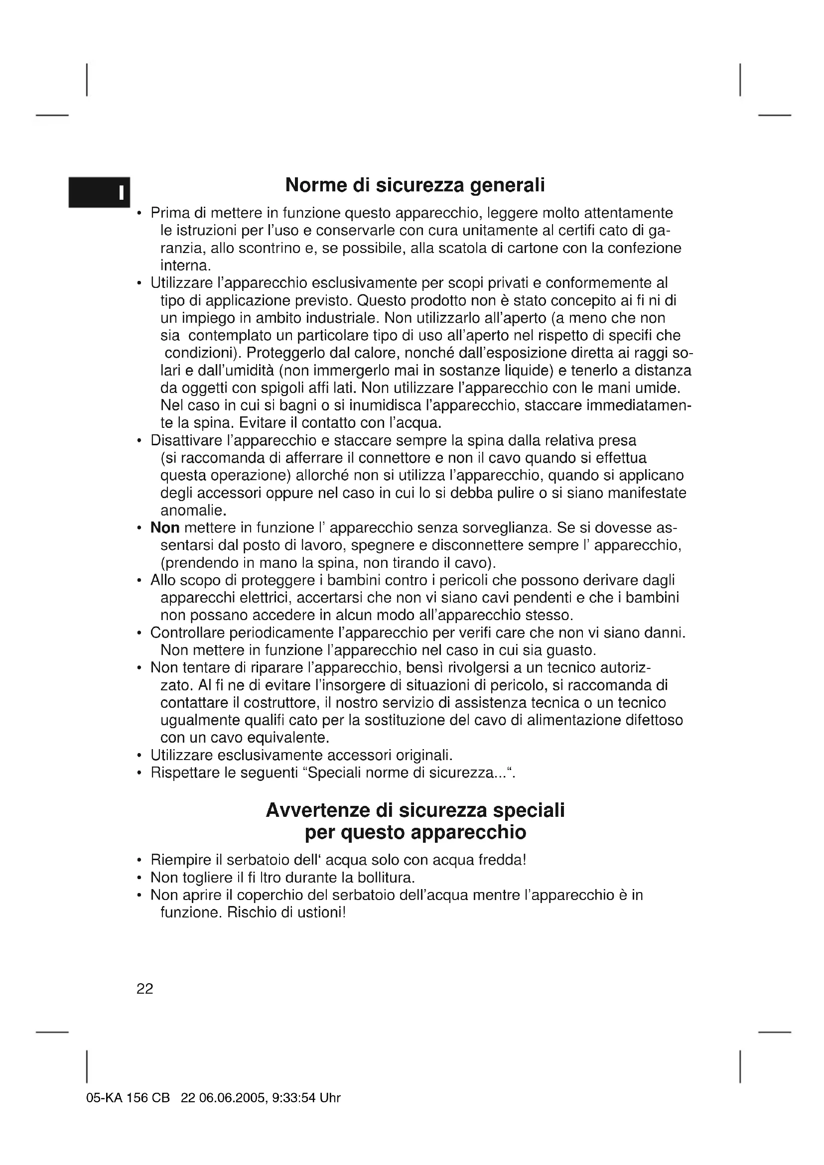 - Non aprire il coperchio del serbatoio dell’acqua mentre l’apparecchio è in funzione. Rischio di ustioni! 05-KA 156 CB 22 06.06.2005, 9:33:54 UhrI