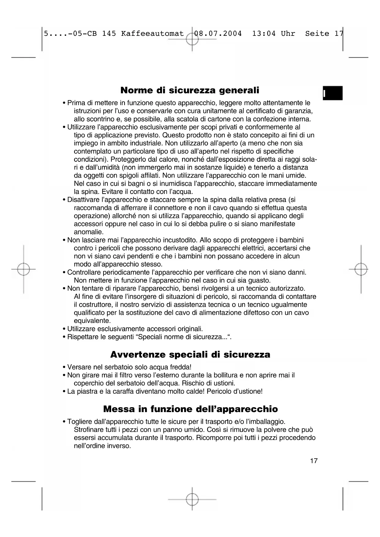 5....-05-CB 145 Kaffeeautomat 08.07.2004 13:04 Uhr Seite 17• Prima di fare il primo caffè, far scorrere 2 - 3 volte acqua fredda nell’appa- recchio per pulirlo. Collegamento elettrico
