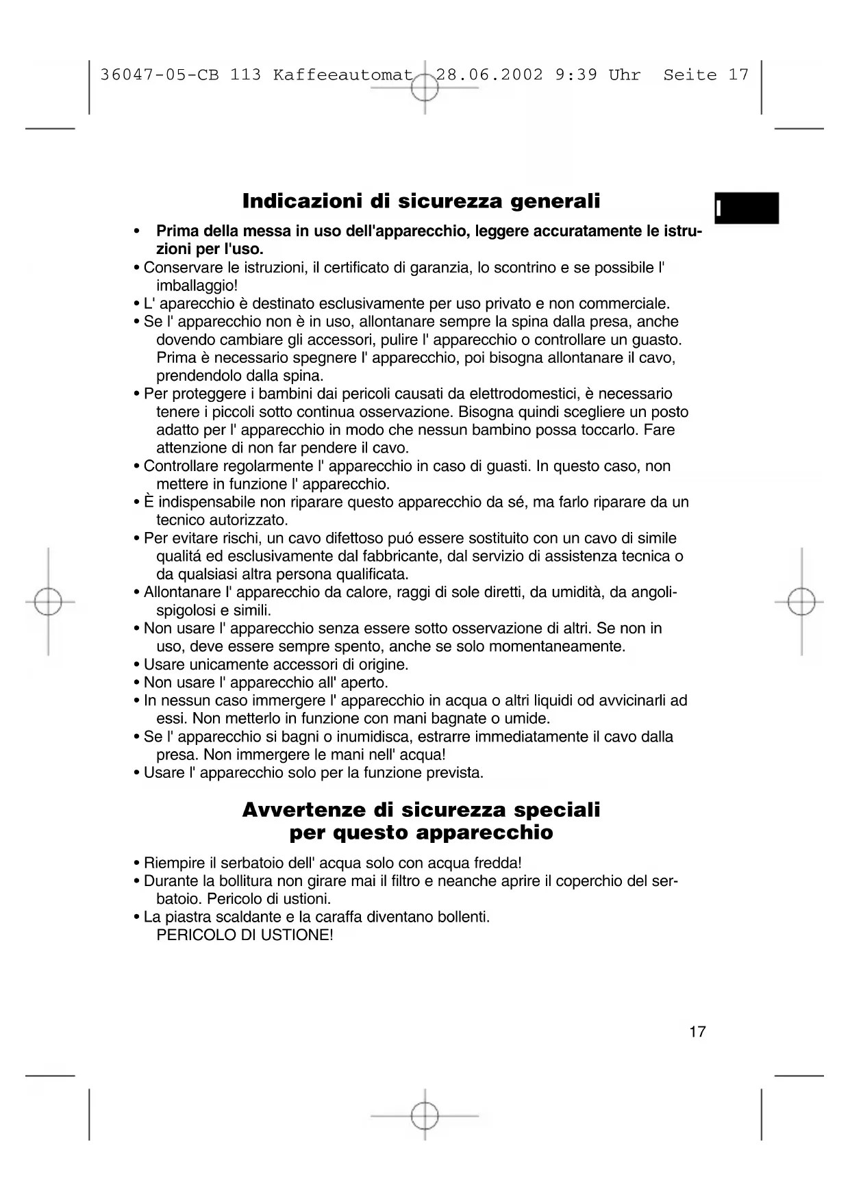 36047-05-CB 113 Kaffeeautomat 28.06.2002 9:39 Uhr Seite 18Garanzia A partire dalla data di acquisto, questo prodotto è garantito dal produttore per un periodo di 24 mesi (scontrino). Durante la durata della garanzia, il produttore eliminerà gratuitamente difetti dell'- apparecchio dovuti a imperfezioni di produzione o di materiale, eventualmente cam- biando l' unità oppure procedendo con le dovute riparazioni. La garanzia è valida solo con lo scontrino. Senza l' esibizione dello scontrino non è possibile fare svolgere le riparazioni gratuitamente. In caso di riparazioni con garanzia, è necessario ritornare al produttore l' appa- recchio intero, nell'imballaggio originale, accompagnato dallo scontrino. In caso di rottura di vetro e difetti agli accessori, i pezzi necessari verranno spediti in cambio gratuitamente. In questo caso è necessario di non spedire l' intero appa- recchio, ma ordinare solo l' accessorio difettoso! Pulizia, manutenzione e scambio non fanno parte della garanzia e sono perciò sono soggetti a spese. La garanzia perde la sua validità se l'apparecchio è sottomesso all' intervento di terzi. Dopo la garanzia Quando la garanzia è scaduta, le riparazioni devono essere effettuate da un nego- zio od un servizio specializzato, contro pagamento.