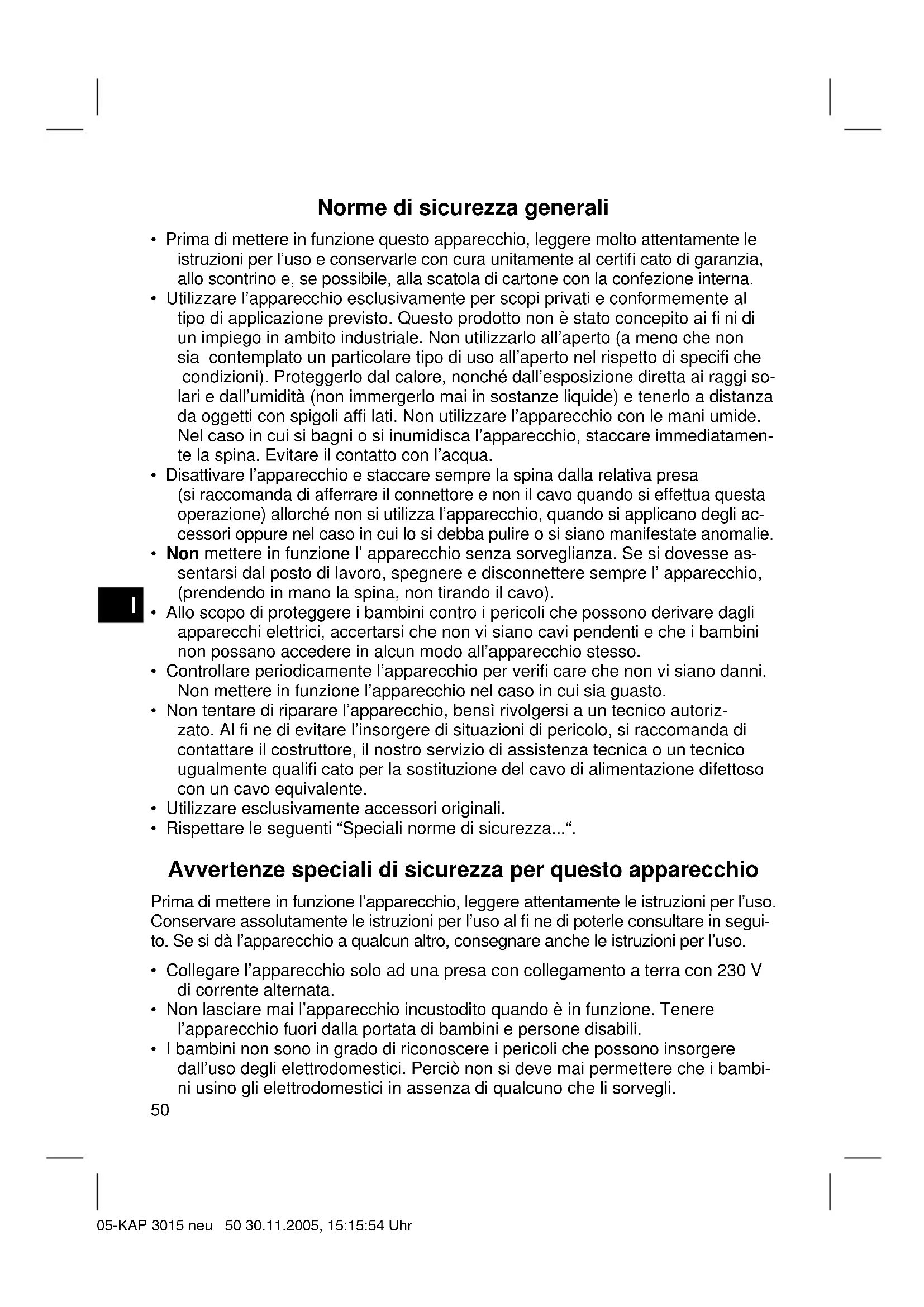 - I bambini non sono in grado di riconoscere i pericoli che possono insorgere dall’uso degli elettrodomestici. Perciò non si deve mai permettere che i bambi- ni usino gli elettrodomestici in assenza di qualcuno che li sorvegli. 05-KAP 3015 neu 50 30.11.2005, 15:15:54 UhrI