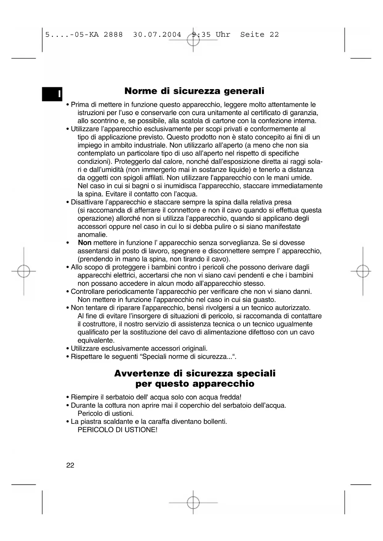 5....-05-KA 2888 30.07.2004 9:35 Uhr Seite 24Questo apparecchio è stato controllato sulla base di tutte le direttive CE attuali in vigore in questo settore, quali per esempio la normativa in materia di compatibilità elettromagnetica e la direttiva in materia di bassa tensione, ed è stato costruito conformemente alle norme di sicurezza più moderne. Con riserva di apportare modifiche tecniche. Garanzia Per l’apparecchio da noi messo in commercio ci assumiamo una garanzia di 24 mesi dalla data di acquisto (scontrino). Durante la garanzia noi ci impegniamo ad eliminare gratuitamente i guasti dell’ap- parecchio o degli accessori*), dovuti a difetti di materiale o di fabbricazione, riparan- doli o, a nostra discrezione, sostituendoli. Le prestazioni in garanzia danno luogo a una proroga della garanzia né danno diritto ad una nuova garanzia! Per la garanzia è sufficiente lo scontrino di acquisto. Senza questo scontrino non sussiste il diritto né ad una sostituzione né ad una riparazione gratuita. Nel caso si ricorra alla garanzia, restituire al rivenditore l’apparecchio completo in ogni sua parte, nell’imballaggio originale unitamente allo scontrino. *) Danni agli accessori non giustificano automaticamente lo scambio gratuito dell’- apparecchio completo. Si prega di mettersi in contatto con la nostra centrale telefo- nica. Danni alle parti di vetro oppure fratture ai pezzi di materia plastica sono obbli- gatoriamente a spese del cliente. La riparazione di pezzi d’uso ovvero soggetti a logoramento (cursori, ganci impa- statori, cinghie di trasmissione, telecomandi di ricambio, spazzolini di ricambio, lame di seghe ecc.) come anche operazioni di pulizia e manutenzione o la sostitu- zione di pezzi soggetti a logoramento non rientrano nella garanzia e quindi sono a pagamento! La garanzia si annulla nel caso di intervento da parte di terzi. Dopo la garanzia Al termine della garanzia le riparazioni possono essere eseguite dietro pagamento dal corrispettivo negozio specializzato o servizio riparazioni.