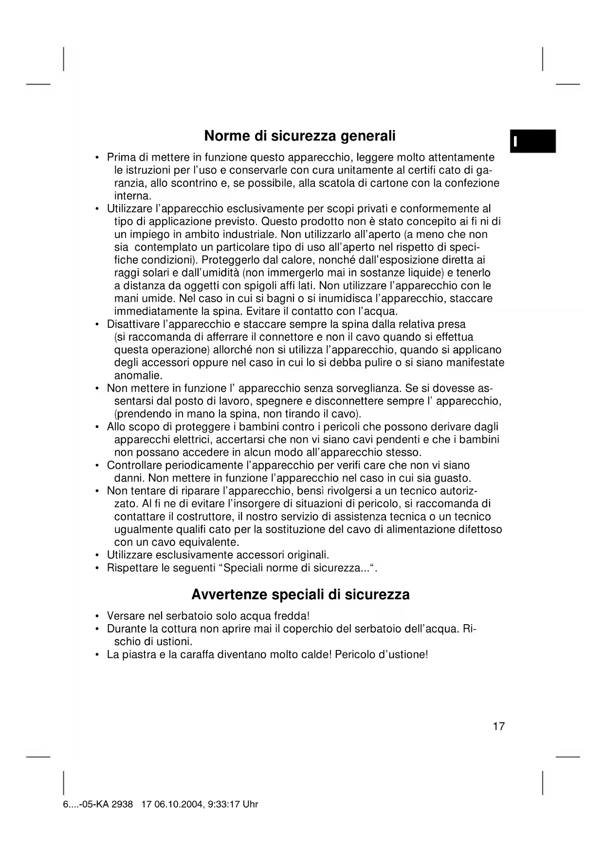 per stoviglie. Questo apparecchio è stato controllato sulla base di tutte le direttive CE attuali in vigore in questo settore, quali per esempio la normativa in materia di compatibili- tà elettromagnetica e la direttiva in materia di bassa tensione, ed è stato costruito conformemente alle norme di sicurezza più moderne. Con riserva di apportare modifi che tecniche. Garanzia Per l’apparecchio da noi messo in commercio ci assumiamo una garanzia di 24 mesi dalla data di acquisto (scontrino). Durante la garanzia noi ci impegniamo ad eliminare gratuitamente i guasti dell’apparecchio o degli accessori*), dovuti a difetti di materiale o di fabbricazi- one, riparandoli o, a nostra discrezione, sostituendoli. Le prestazioni in garanzia danno luogo a una proroga della garanzia né danno diritto ad una nuova garan- zia! Per la garanzia è suffi ciente lo scontrino di acquisto. Senza questo scontrino non sussiste il diritto né ad una sostituzione né ad una riparazione gratuita. Nel caso si ricorra alla garanzia, restituire al rivenditore l’apparecchio completo in ogni sua parte, nell’imballaggio originale unitamente allo scontrino. *) Danni agli accessori non giustifi cano automaticamente lo scambio gratuito dell’apparecchio completo. Si prega di mettersi in contatto con la nostra centrale telefonica. Danni alle parti di vetro oppure fratture ai pezzi di materia plastica sono obbligatoriamente a spese del cliente. La riparazione di pezzi d’uso ovvero soggetti a logoramento (cursori, ganci im- pastatori, cinghie di trasmissione, telecomandi di ricambio, spazzolini di ricambio, lame di seghe ecc.) come anche operazioni di pulizia e manutenzione o la sostitu- zione di pezzi soggetti a logoramento non rientrano nella garanzia e quindi sono a pagamento! La garanzia si annulla nel caso di intervento da parte di terzi. Dopo la garanzia Al termine della garanzia le riparazioni possono essere eseguite dietro pagamento dal corrispettivo negozio specializzato o servizio riparazioni. 6....-05-KA 2938 19 06.10.2004, 9:33:18 UhrN