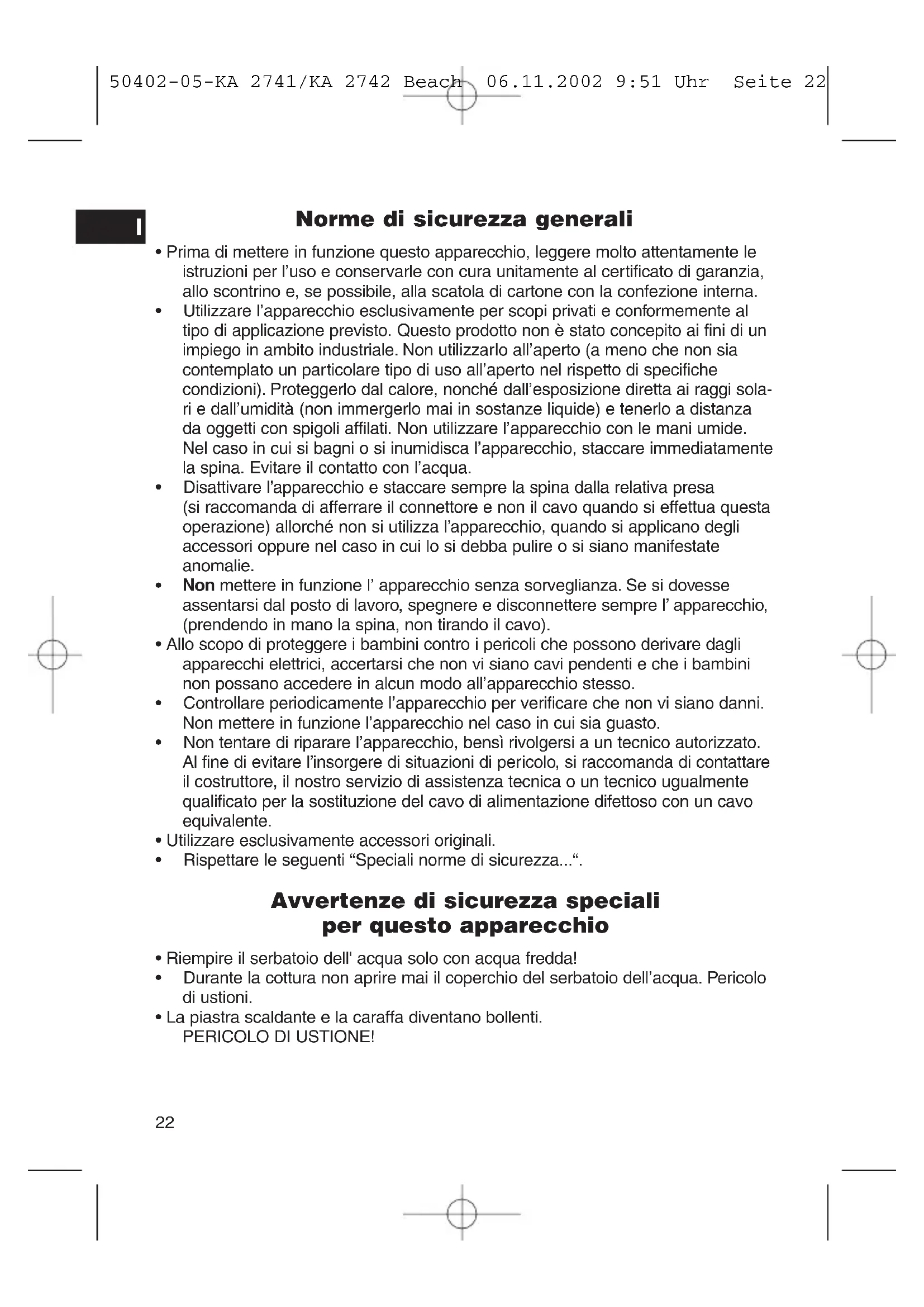50402-05-KA 2741/KA 2742 Beach 06.11.2002 9:51 Uhr Seite 24Questo apparecchio è stato controllato sulla base di tutte le direttive CE attuali in vigore in questo settore, quali per esempio la normativa in materia di compatibilità elettromagnetica e la direttiva in materia di bassa tensione, ed è stato costruito conformemente alle norme di sicurezza più moderne. Con riserva di apportare modifiche tecniche. Garanzia Per l’apparecchio da noi messo in commercio ci assumiamo una garanzia di 24 mesi dalla data di acquisto (scontrino). Durante la garanzia noi ci impegniamo ad eliminare gratuitamente i guasti dell’ap- parecchio o degli accessori*), dovuti a difetti di materiale o di fabbricazione, riparan- doli o, a nostra discrezione, sostituendoli. Le prestazioni in garanzia danno luogo a una proroga della garanzia né danno diritto ad una nuova garanzia! Per la garanzia è sufficiente lo scontrino di acquisto. Senza questo scontrino non sussiste il diritto né ad una sostituzione né ad una riparazione gratuita. Nel caso si ricorra alla garanzia, restituire al rivenditore l’apparecchio completo in ogni sua parte, nell’imballaggio originale unitamente allo scontrino. *) Danni agli accessori non giustificano automaticamente lo scambio gratuito dell’- apparecchio completo. Si prega di mettersi in contatto con la nostra centrale telefo- nica. Danni alle parti di vetro oppure fratture ai pezzi di materia plastica sono obbli- gatoriamente a spese del cliente. La riparazione di pezzi d’uso ovvero soggetti a logoramento (cursori, ganci impa- statori, cinghie di trasmissione, telecomandi di ricambio, spazzolini di ricambio, lame di seghe ecc.) come anche operazioni di pulizia e manutenzione o la sostitu- zione di pezzi soggetti a logoramento non rientrano nella garanzia e quindi sono a pagamento! La garanzia si annulla nel caso di intervento da parte di terzi. Dopo la garanzia Al termine della garanzia le riparazioni possono essere eseguite dietro pagamento dal corrispettivo negozio specializzato o servizio riparazioni.