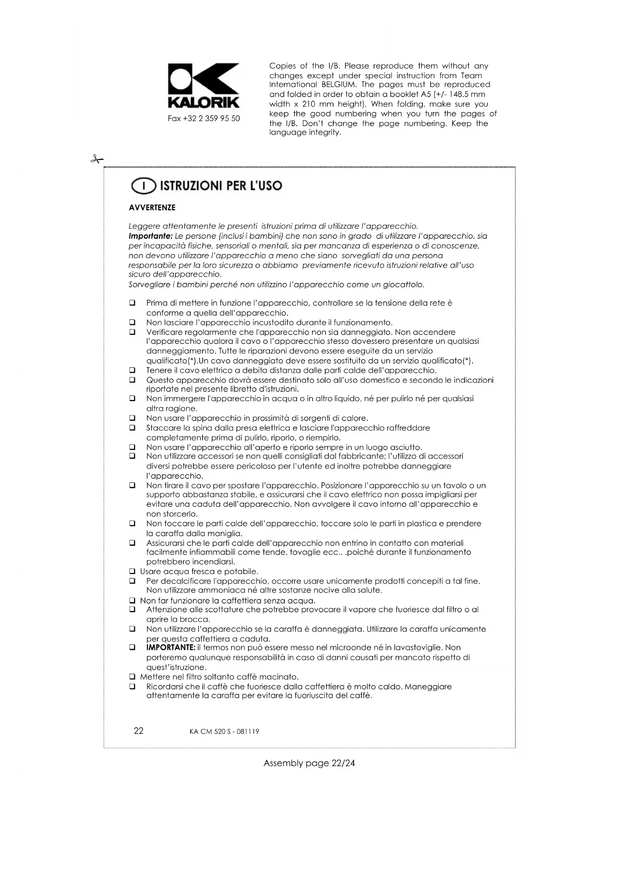 AVVERTENZE Leggere attentamente le presenti istruzioni prima di utilizzare l’apparecchio. Importante: Le persone (inclusi i bambini) che non sono in grado di utilizzare l’apparecchio, sia per incapacità fisiche, sensoriali o mentali, sia per mancanza di esperienza o di conoscenze, non devono utilizzare l’apparecchio a meno che siano sorvegliati da una persona responsabile per la loro sicurezza o abbiamo previamente ricevuto istruzioni relative all’uso sicuro dell’apparecchio. Sorvegliare i bambini perché non utilizzino l’apparecchio come un giocattolo. Prima di mettere in funzione l’apparecchio, controllare se la tensione della rete è conforme a quella dell’apparecchio. Non lasciare l’apparecchio incustodito durante il funzionamento. Verificare regolarmente che l'apparecchio non sia danneggiato. Non accendere l’apparecchio qualora il cavo o l’apparecchio stesso dovessero presentare un qualsiasi danneggiamento. Tutte le riparazioni devono essere eseguite da un servizio qualificato(*).Un cavo danneggiato deve essere sostituito da un servizio qualificato(*). Tenere il cavo elettrico a debita distanza dalle parti calde dell’apparecchio. Questo apparecchio dovrà essere destinato solo all’uso domestico e secondo le indicazioni riportate nel presente libretto d'istruzioni. Non immergere l'apparecchio in acqua o in altro liquido, né per pulirlo né per qualsiasi altra ragione. Non usare l’apparecchio in prossimità di sorgenti di calore. Staccare la spina dalla presa elettrica e lasciare l'apparecchio raffreddare completamente prima di pulirlo, riporlo, o riempirlo. Non usare l’apparecchio all’aperto e riporlo sempre in un luogo asciutto. Non utilizzare accessori se non quelli consigliati dal fabbricante; l’utilizzo di accessori diversi potrebbe essere pericoloso per l’utente ed inoltre potrebbe danneggiare l’apparecchio. Non tirare il cavo per spostare l’apparecchio. Posizionare l’apparecchio su un tavolo o un supporto abbastanza stabile, e assicurarsi che il cavo elettrico non possa impigliarsi per evitare una caduta dell’apparecchio. Non avvolgere il cavo intorno all’apparecchio e non storcerlo. Non toccare le parti calde dell’apparecchio, toccare solo le parti in plastica e prendere la caraffa dalla maniglia. Assicurarsi che le parti calde dell’apparecchio non entrino in contatto con materiali facilmente infiammabili come tende, tovaglie ecc.. .poiché durante il funzionamento potrebbero incendiarsi. Usare acqua fresca e potabile. Per decalcificare l'apparecchio, occorre usare unicamente prodotti concepiti a tal fine. Non utilizzare ammoniaca né altre sostanze nocive alla salute. Non far funzionare la caffettiera senza acqua. Attenzione alle scottature che potrebbe provocare il vapore che fuoriesce dal filtro o al aprire la brocca. Non utilizzare l’apparecchio se la caraffa è danneggiata. Utilizzare la caraffa unicamente per questa caffettiera a caduta. IMPORTANTE: il termos non può essere messo nel microonde né in lavastoviglie. Non porteremo qualunque responsabilità in caso di danni causati per mancato rispetto di quest’istruzione. Mettere nel filtro soltanto caffè macinato. Ricordarsi che il caffè che fuoriesce dalla caffettiera è molto caldo. Maneggiare attentamente la caraffa per evitare la fuoriuscita del caffè. Copies of the I/B. Please reproduce them without any changes except under special instruction from Team International BELGIUM. The pages must be reproduced and folded in order to obtain a booklet A5 (+/- 148.5 mm width x 210 mm height). When folding, make sure you keep the good numbering when you turn the pages of the I/B. Don’t change the page numbering. Keep the language integrity. 23 KA CM 520 S - 081119