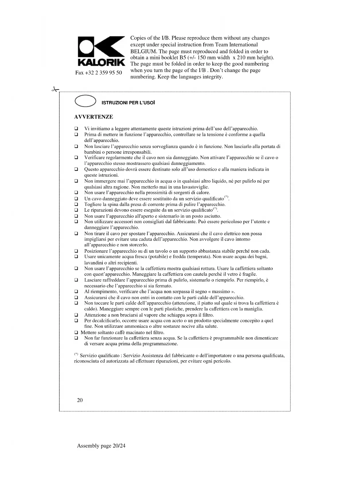Riempire il serbatoio con la quantità d'acqua desiderata. Si può vedere la quantità di tazze ottenute attraverso la finestra che indica il livello. Mettere un filtro di carta nel portafiltro e riempire con la quantità di caffè macinato desiderata. Chiudere bene il coperchio e premere sull’interruttore “ON/OFF”. La spia luminosa rossa si accenderà per indicare che la caffettiera è in moto che il caffè sta passando. Per fermare l’apparecchio, premere sull’interruttore “ON/OFF” (la spia luminosa si spegnerà). Quando si toglie la brocca dall'apparecchio, una valvola antigoccia si chiude automaticamente per evitare che non cadano gocce di caffè sulla piastra. Quando si rimette la brocca il sistema antigoccia si riapre, consentendo al caffè che rimane nel filtro di passare. Per rifare caffè una seconda volta, spegnere l’apparecchio, aspettare 10 minuti, sciacquare la brocca e il porta-filtro, e ripetere l’operazione.Copies of the I/B. Please reproduce them without any changes except under special instruction from Team International BELGIUM. The page must reproduced and folded in order to obtain a mini booklet B5 (+/- 150 mm width x 210 mm height). The page must be folded in order to keep the good numbering when you turn the page of the I/B . Don’t change the page numbering. Keep the languages integrity.