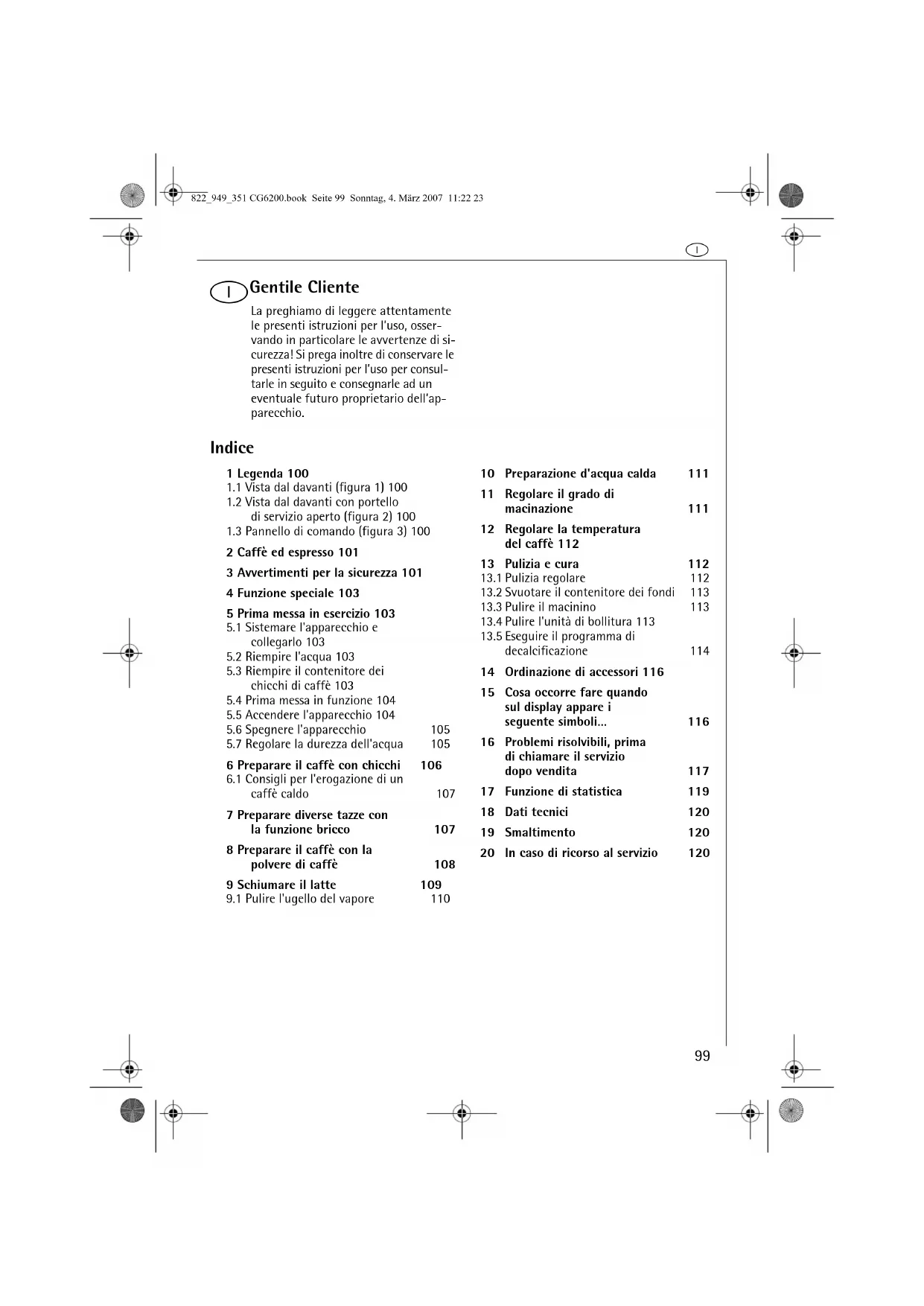 decalcificazione 114 14 Ordinazione di accessori 116 15 Cosa occorre fare quando sul display appare i seguente simboli… 116 16 Problemi risolvibili, prima di chiamare il servizio dopo vendita 117 17 Funzione di statistica 119 18 Dati tecnici 120 19 Smaltimento 120 20 In caso di ricorso al servizio 120 822_949_351 CG6200.book Seite 99 Sonntag, 4. März 2007 11:22 23i