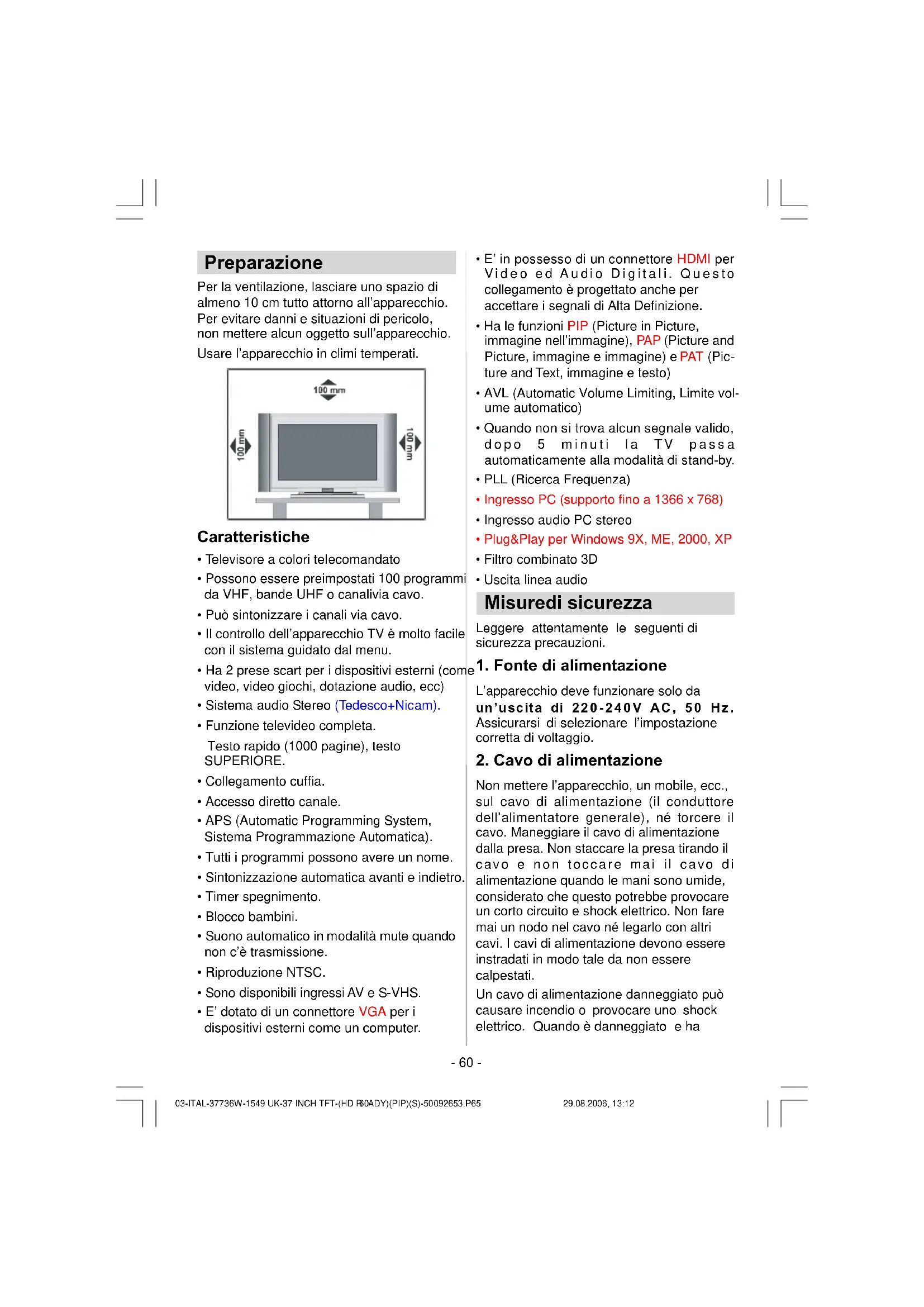 TV /A VM EN UP /C H 03-ITAL-37736W-1549 UK-37 INCH TFT-(HD READY)(PIP)(S)-50092653.P65 29.08.2006, 13:1258- 59 - Entrata S-VHS EXT-4S Ingresso Video EntrateAudio Uscita linea audio Headphone Entrata cavo di alimentazione Interruttore On/Off (accensione/spegnimento) EntrataVGA Entrate Componente Video (YPbPr) Entrate Componenti Audio Entrata HDMI (EXT-5) Scart 2 (EXT-2) Scart 1 (EXT-1) Antenna Entrata Audio PC EXT-3 EXT-4 220V-240 V AC~5 0H z POWER 03-ITAL-37736W-1549 UK-37 INCH TFT-(HD READY)(PIP)(S)-50092653.P65 29.08.2006, 13:1259- 60 - Preparazione Per la ventilazione, lasciare uno spazio di almeno 10 cm tutto attorno all’apparecchio. Per evitare danni e situazioni di pericolo, non mettere alcun oggetto sull’apparecchio. Usare l’apparecchio in climi temperati. Caratteristiche