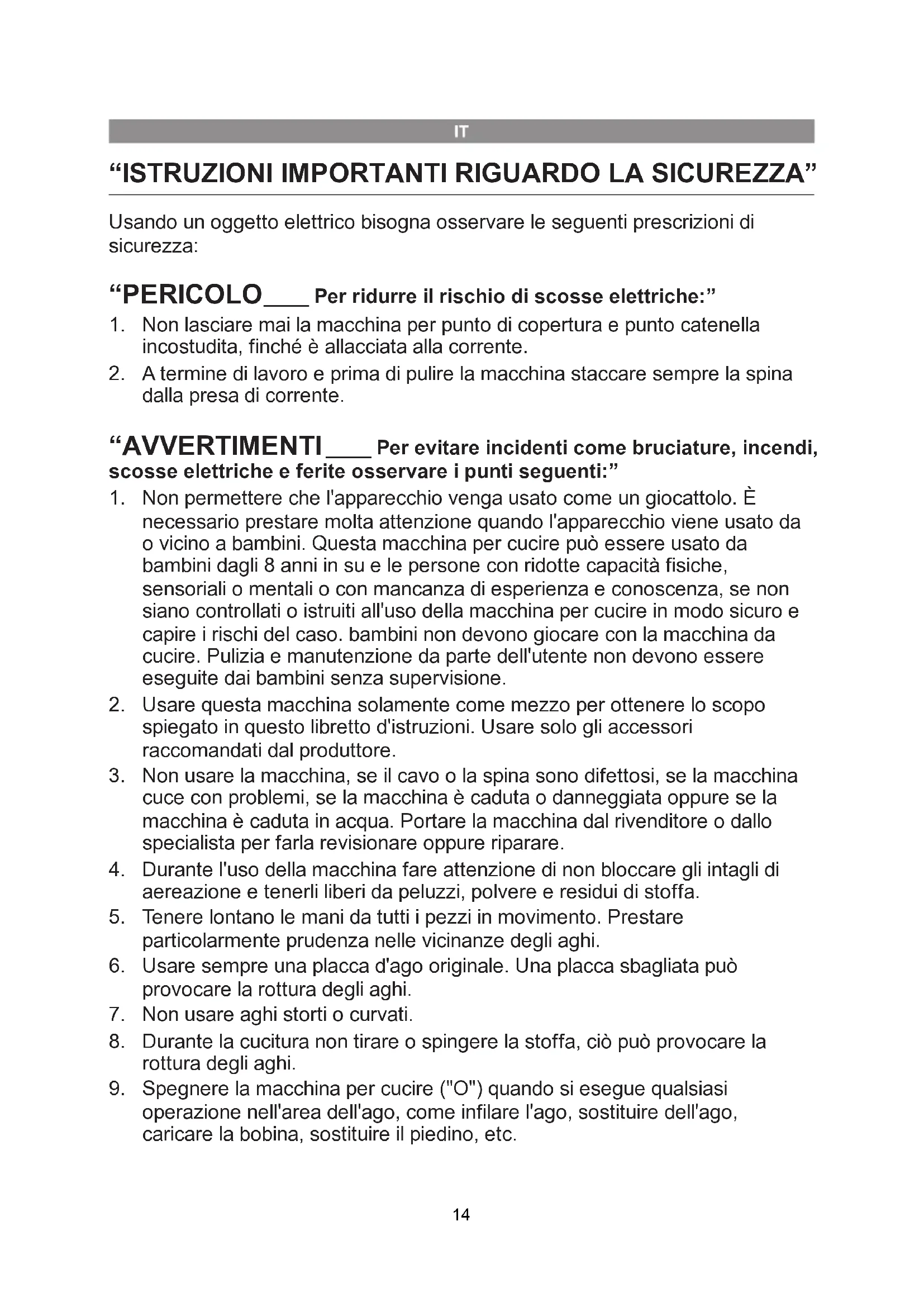 operazione nell'area dell'ago, come infilare l'ago, sostituire dell'ago, caricare la bobina, sostituire il piedino, etc. “PERICOLO “AVVERTIMENTI ____ Per ridurre il rischio di scosse elettriche:” ____ Per evitare incidenti come bruciature, incendi, scosse elettriche e ferite osservare i punti seguenti:”